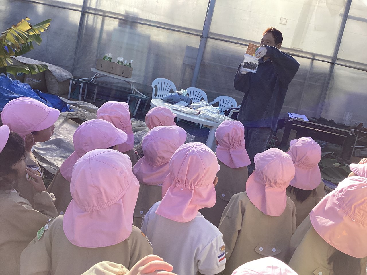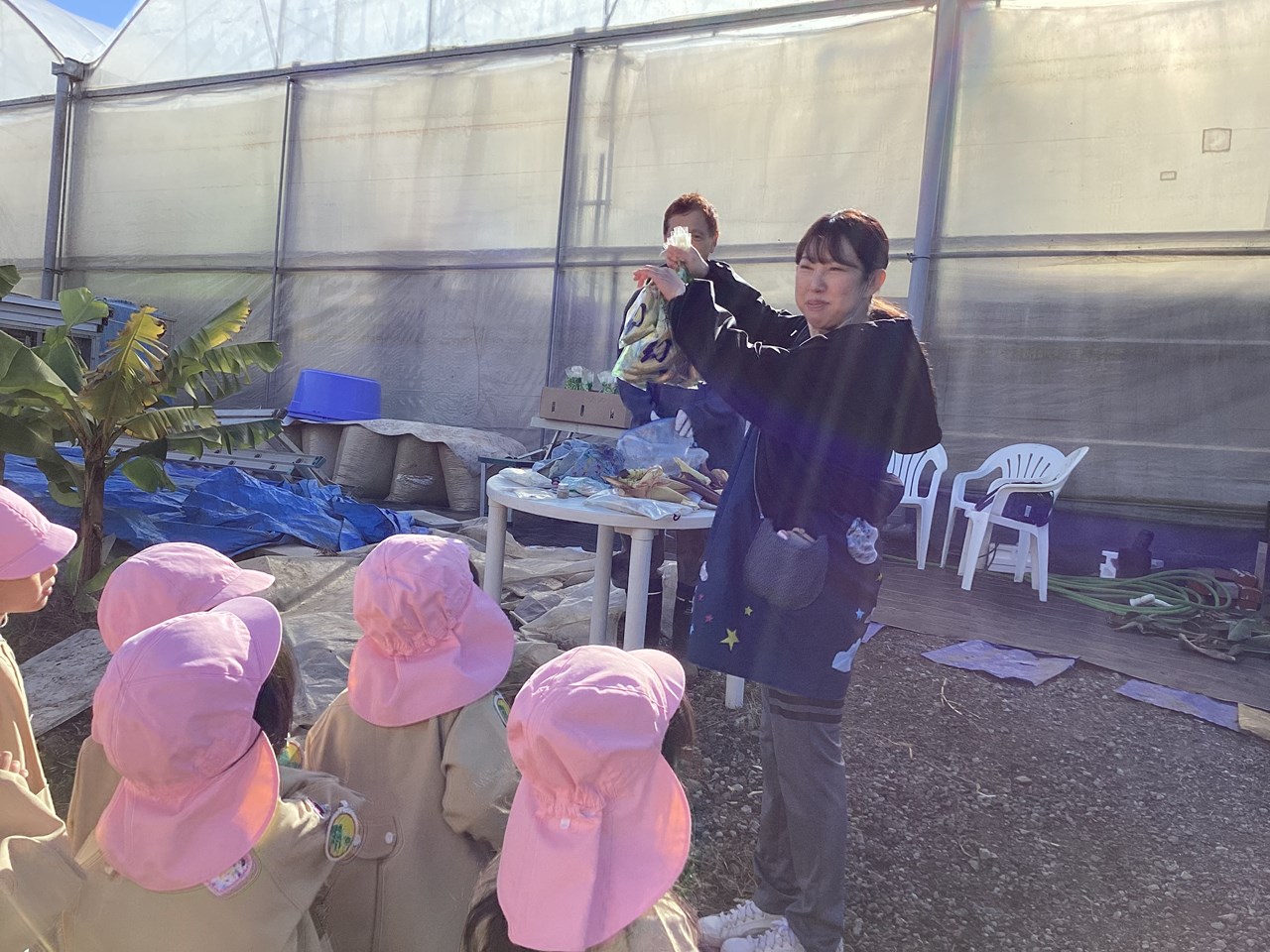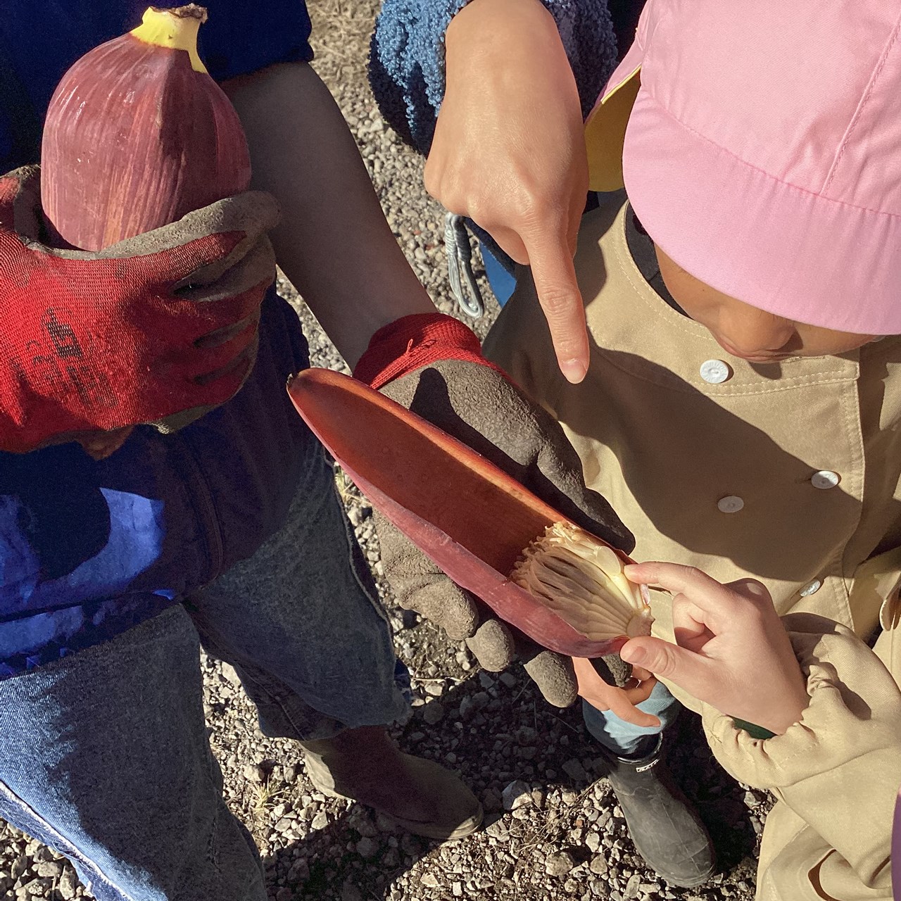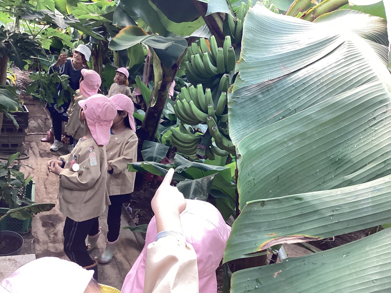 農園はビニールハウスの中にあって、1歩入ると、まるでジャングル!大きな葉っぱが青々と茂って、探検気分の年長さん♪赤ちゃんバナナを見つけたり、葉の大きさに驚いたり、初めてみるバナナの花に興奮したり、驚きや感動で目を輝かせていた子どもたちでした。
