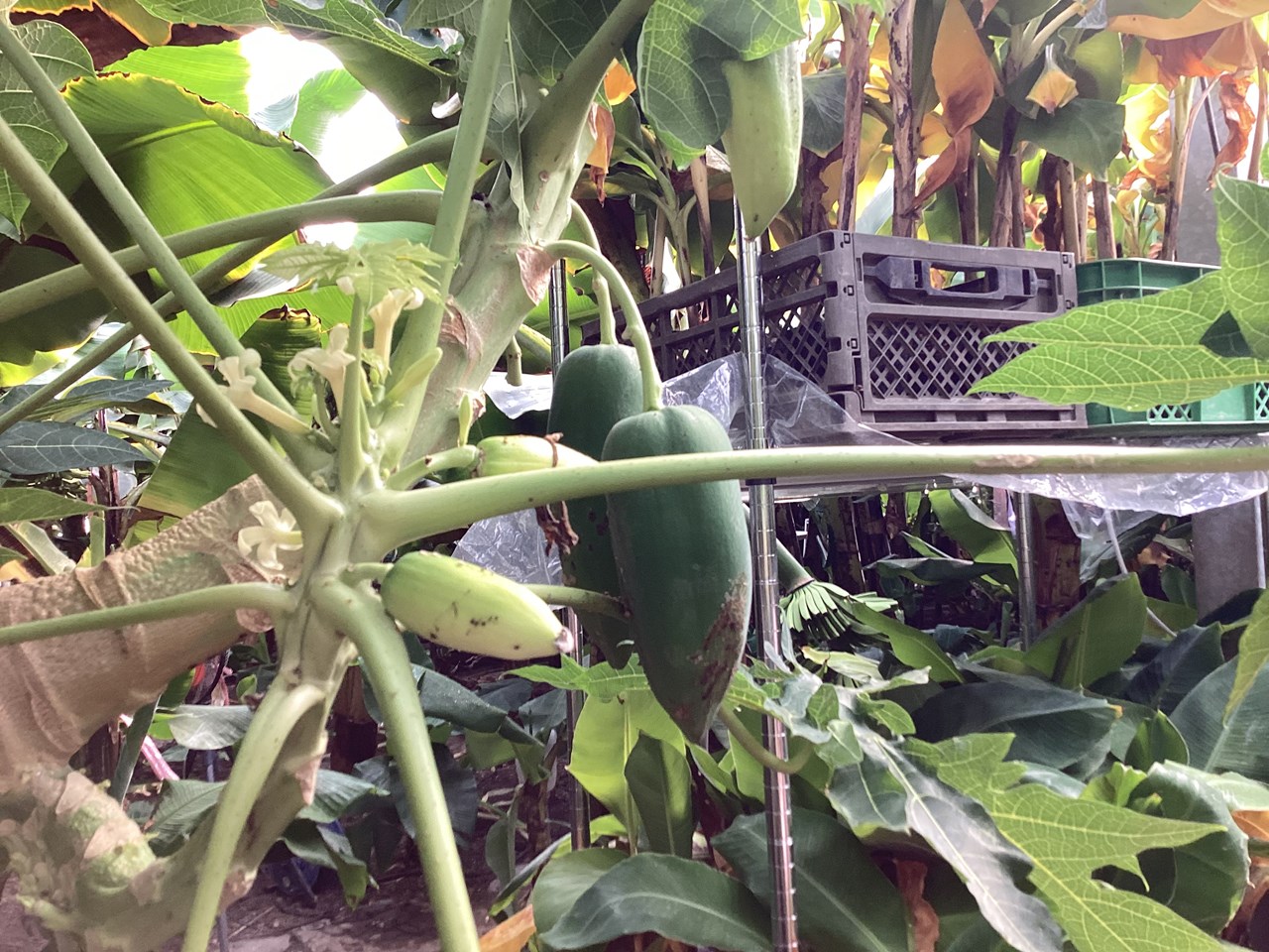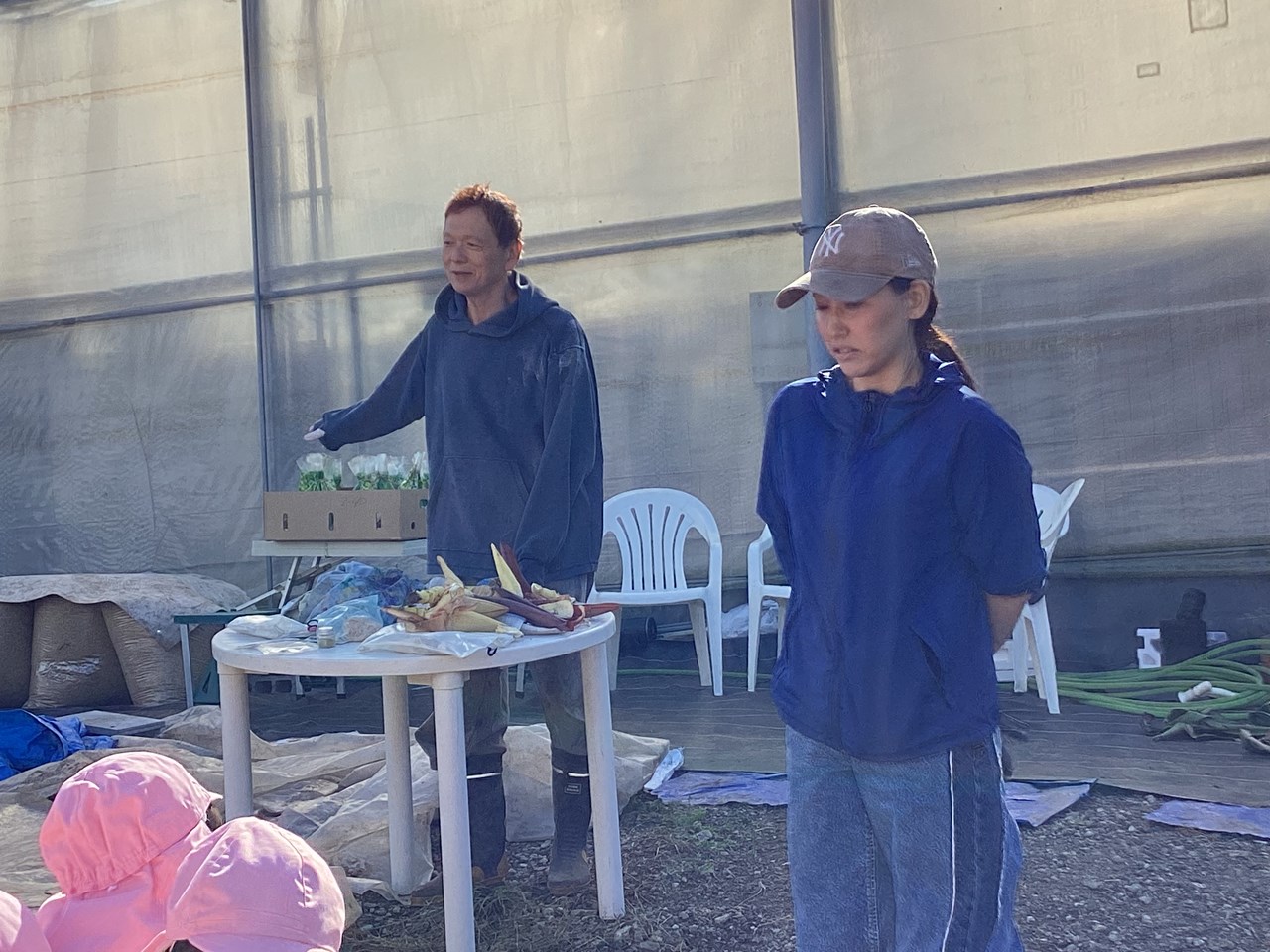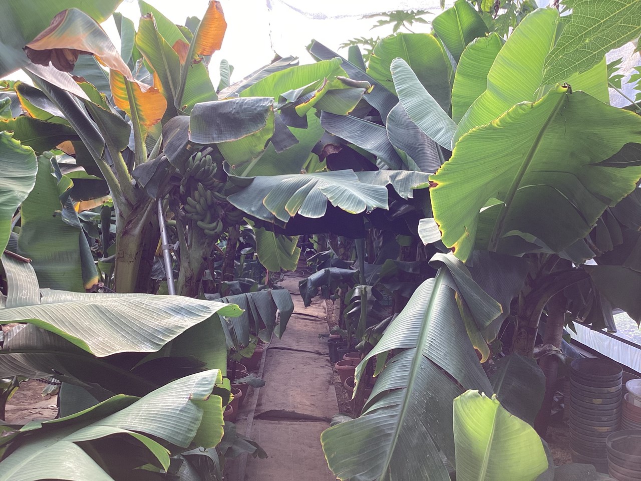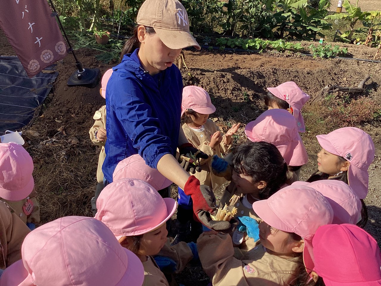 農園はビニールハウスの中にあって、1歩入ると、まるでジャングル!大きな葉っぱが青々と茂って、探検気分の年長さん♪赤ちゃんバナナを見つけたり、葉の大きさに驚いたり、初めてみるバナナの花に興奮したり、驚きや感動で目を輝かせていた子どもたちでした。