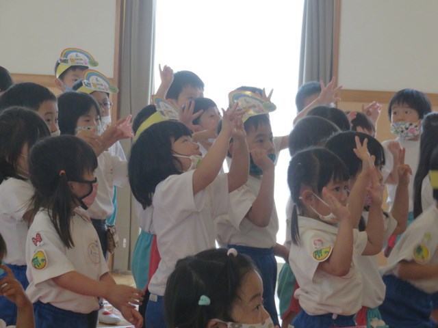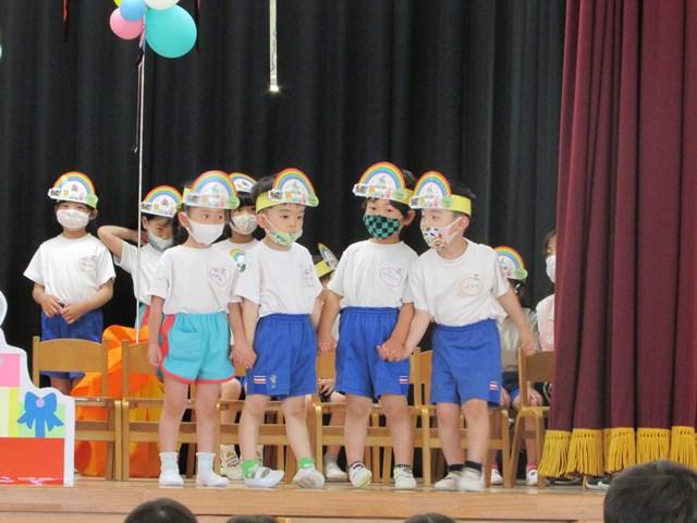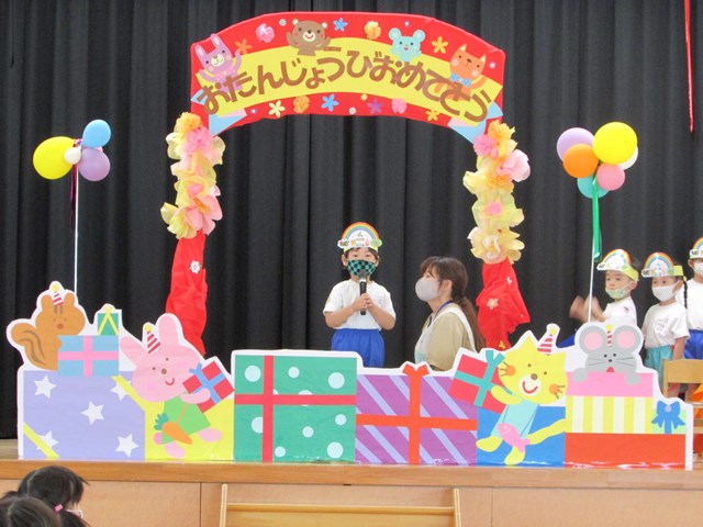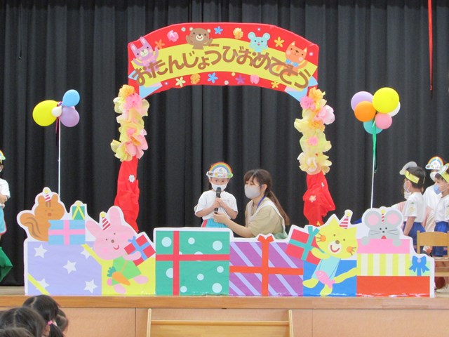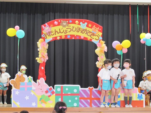 誕生会は、成長の喜びを味わえる大切な行事です。園全体で行うことは大切なことと考えていますが、コロナ禍での開催ですので、参加人数を少なくするために5月も2グループに分かれて行いました。