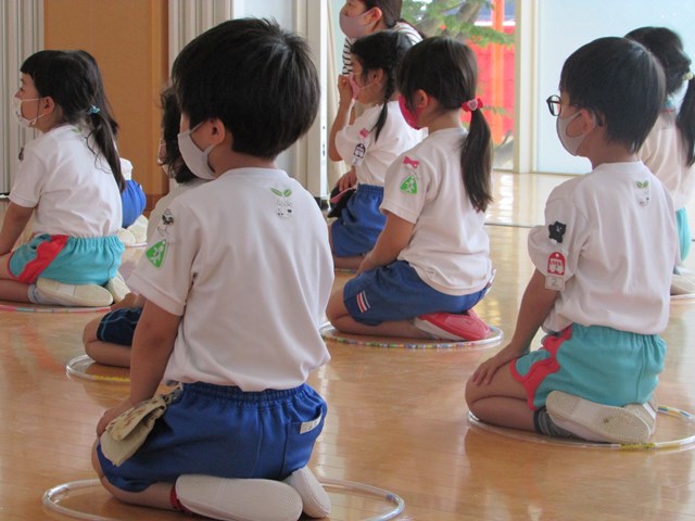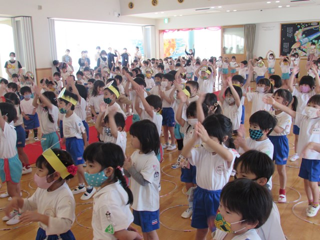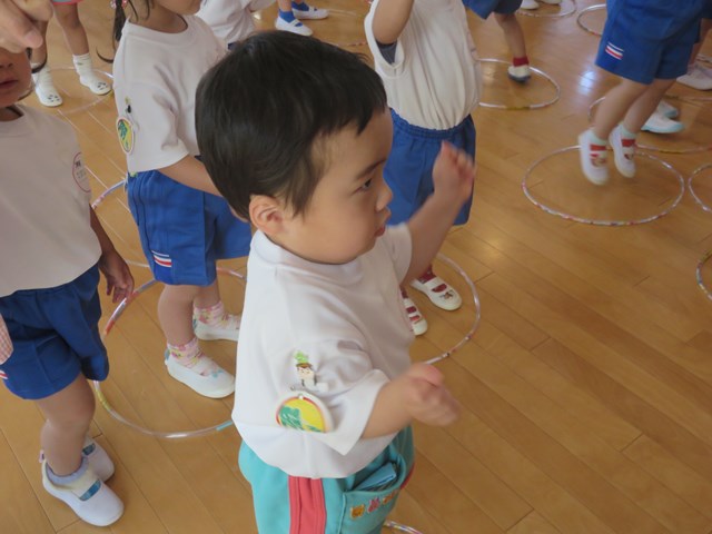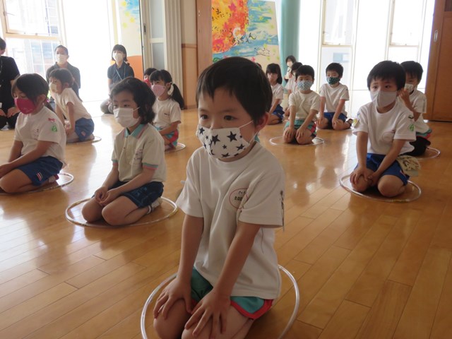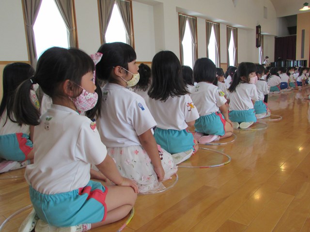 「楽器遊び」と「ヤダットちゃんの誕生日」です。ヤダットちゃんの話では、隣の子と「私はヤダって言わないけど、妹はよく言うよ」「嫌なことはないからヤダって言わないよ」と話している声が聞こえてきました。自分に置き換えて、話を受け止めている様子が窺えました。最後は、年長組のリードの下、手遊びを行いました。