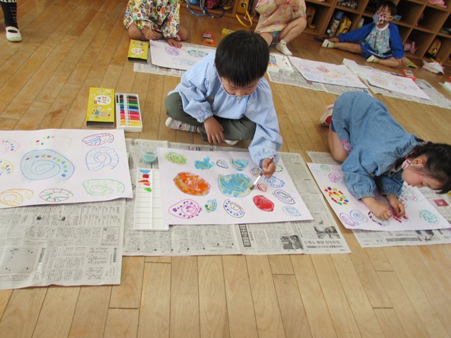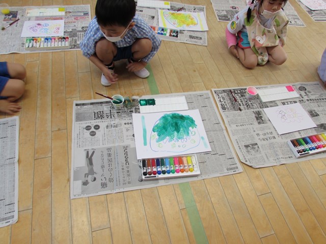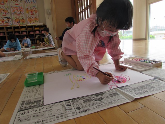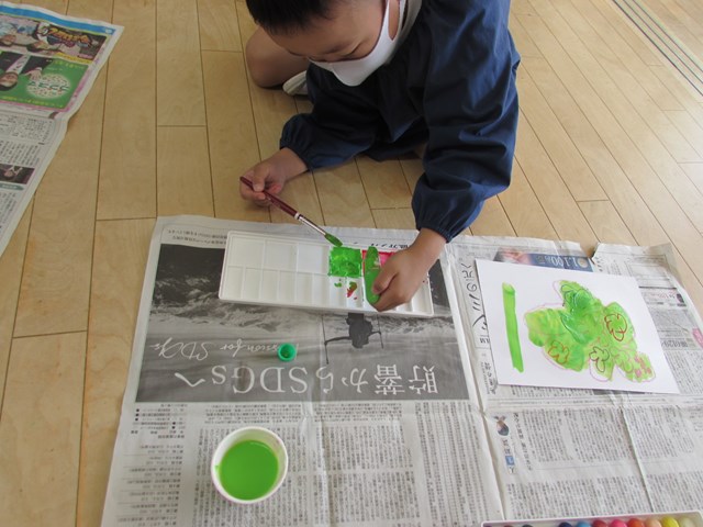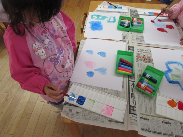 年少の時は共同で絵の具を使いましたが、年中組になると個人持ちの絵の具も併用して使用していきます。昨日初めて個人絵の具を使ってみました。絵の具の分量、パレットの扱い方、筆の洗い方等一つ一つ覚えていきました。自分でできることがまた一つ増え、どことなく誇らしげな様子の年中さんでした。これから一年間、絵を描いていくことを楽しんでいきたいと思います。