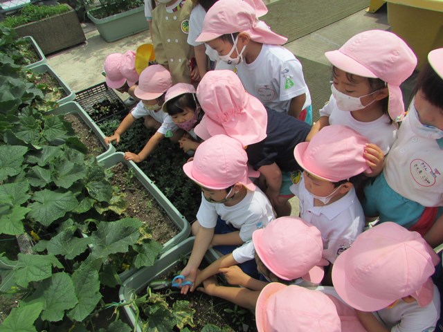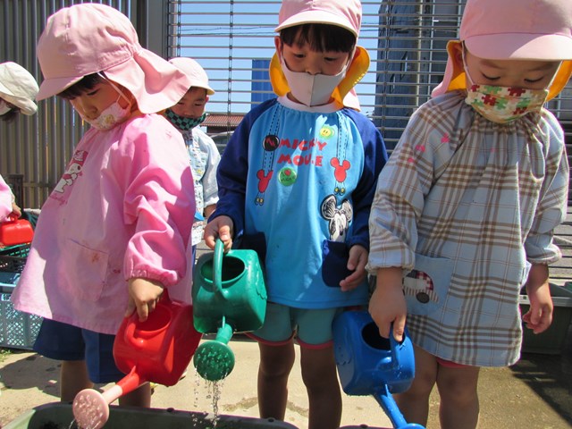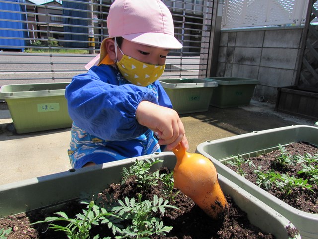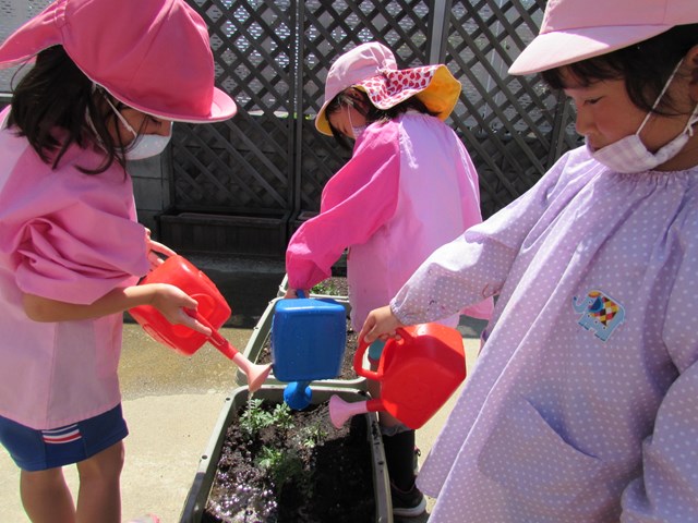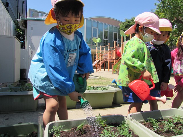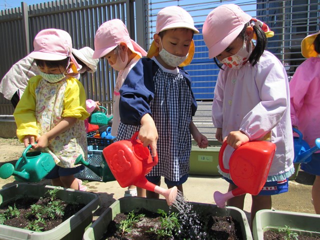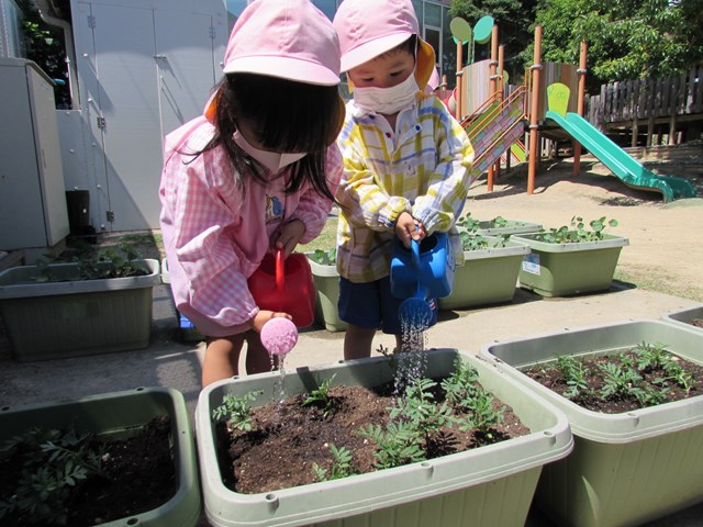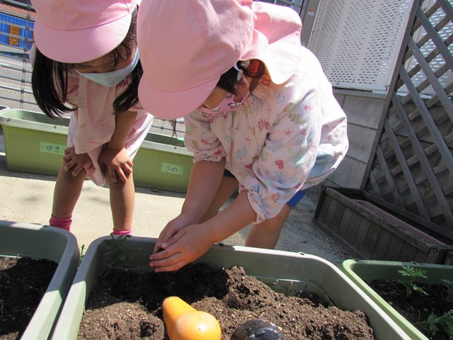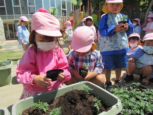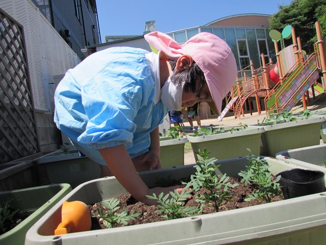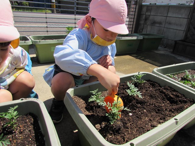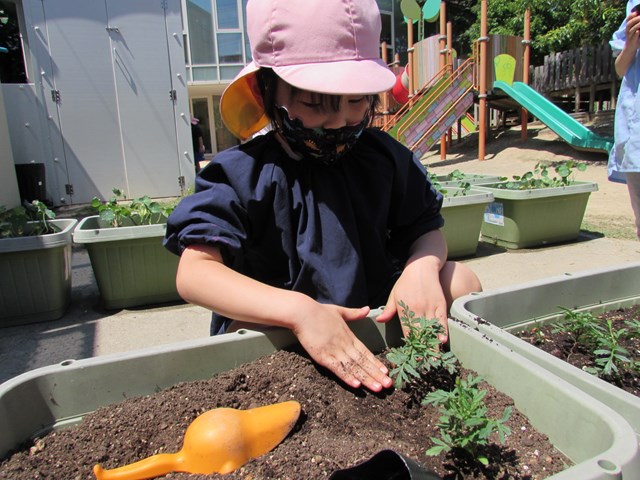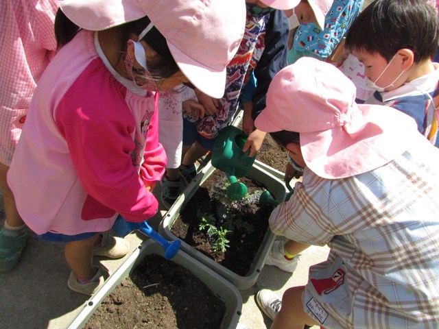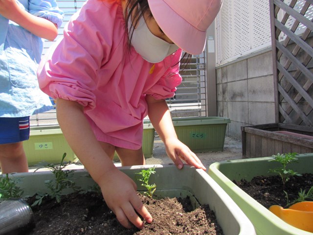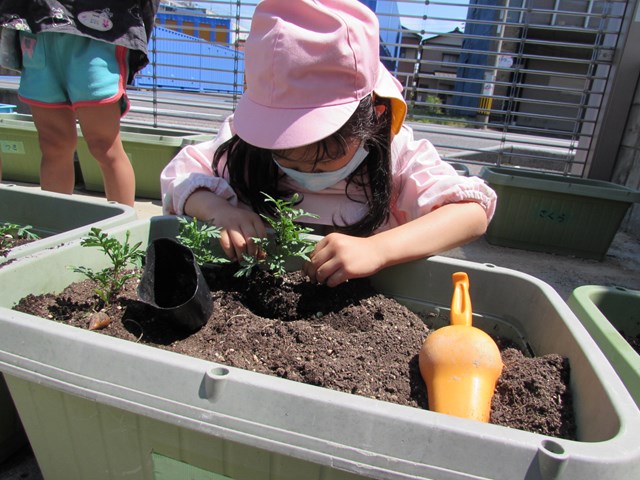 種蒔きをしてから毎日交替で水やりをして大切に育てていますが、発芽し葉っぱが出てきましたので、ポットからプランターに植え替えをしました、穴を掘り、苗を移し土をかぶせます。「小さい苗だから折れないようにそーっとね!」と声を掛け合う姿もあり、丁寧に植え替える子どもたちでした。その後は、たっぷり水やりをしました。「おいしい水あげたよ!」と可愛い発言もあり、子どもたちの優しい気持ちが伝わってきました。