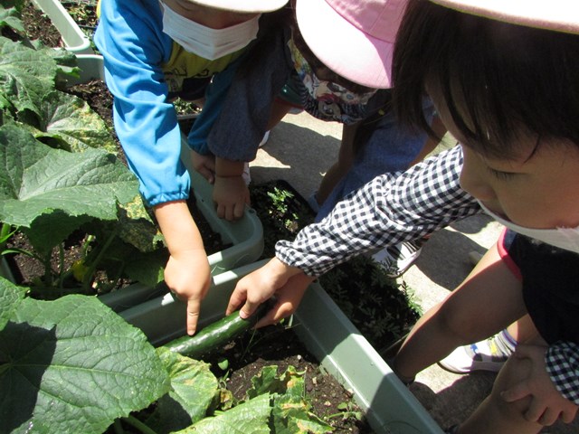 苗植えをしてから毎日観察をしてきました。とうとう1本実り、見つけたときは、大喜びでした。触ってみて「ちくちくするね」「おいしそうだね」「早く食べたいね」と言っていました。来週の給食でいただきたいと思います。