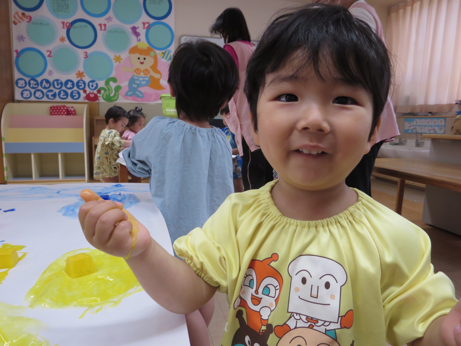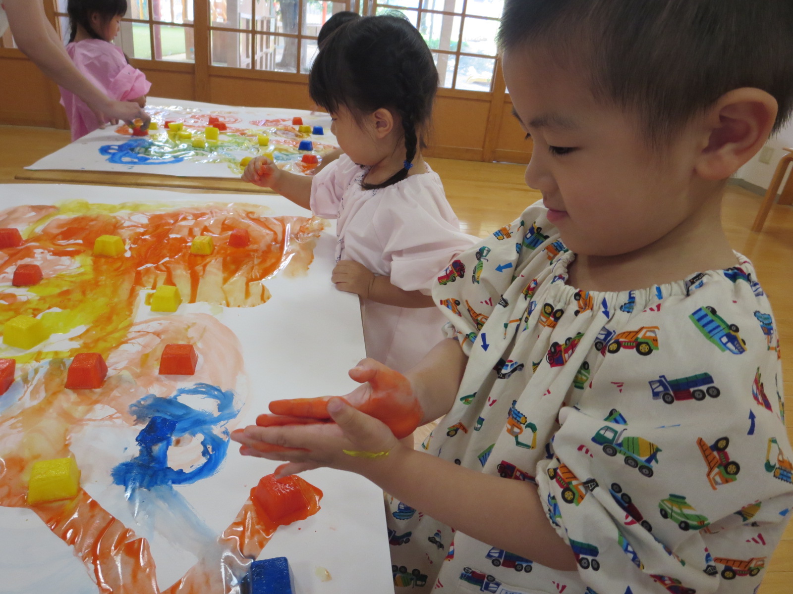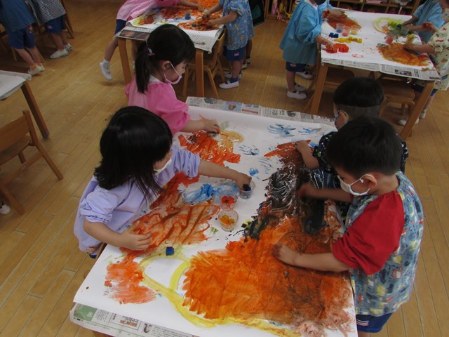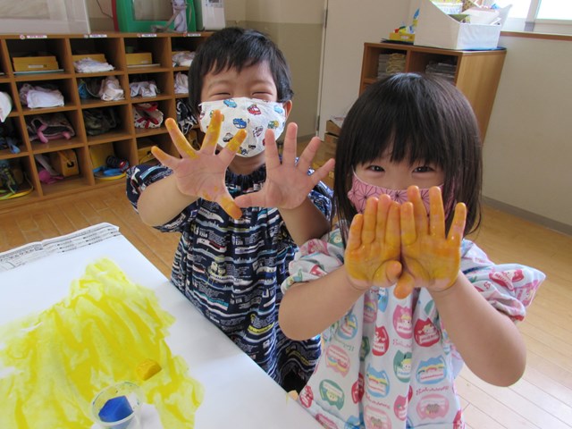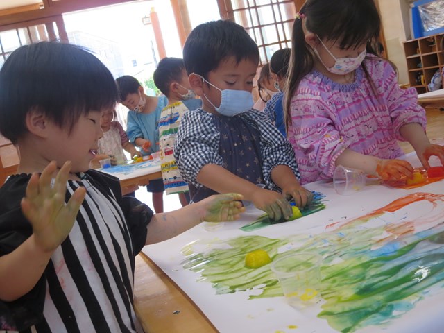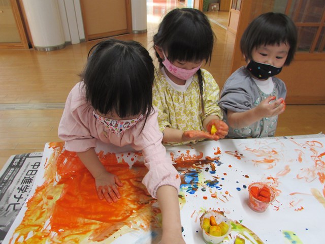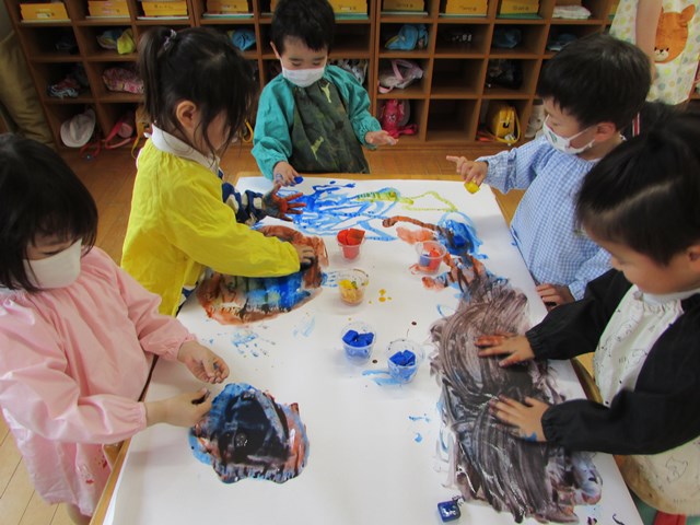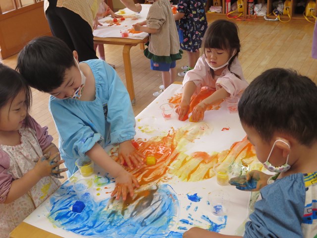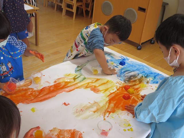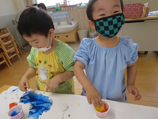 手形を押したり、丸を描いたりしていましたが、氷をグルグルしているうちに、あっという間にその絵や手形は消えてしまいます。色の混ざり具合もどんどん変化していき、とどまることがありません。そして、氷は解けて小さくなっていきます。そんな氷絵の具ならではの遊びに夢中でした。エプロンスモックも手も絵の具でべたべた!でも子どもたちは『遊びきった!』と満足そうな様子でした。