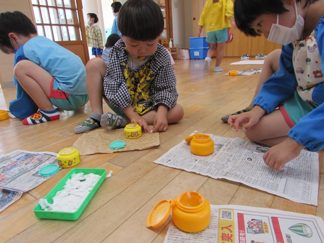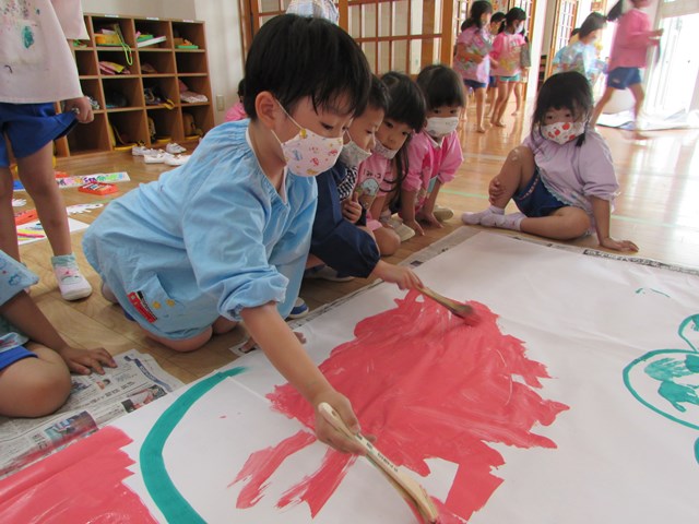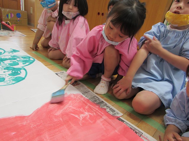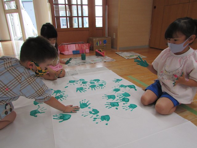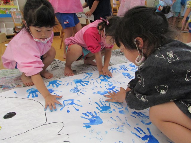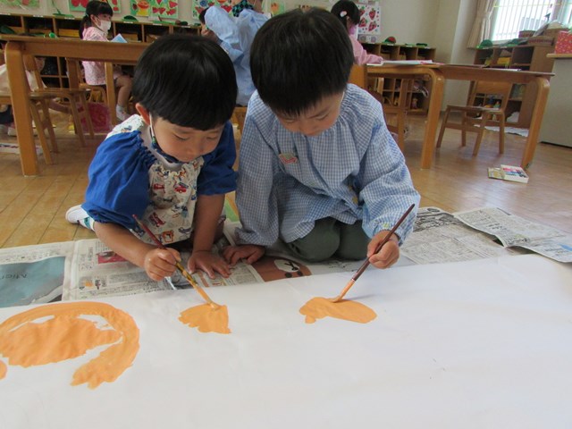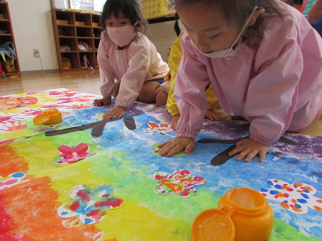 一週間絵画造形遊びに取り組んできましたが、後半は、クラスの共同作品です。クラスの先生や友達と力を合わせて作ったアート作品となました。