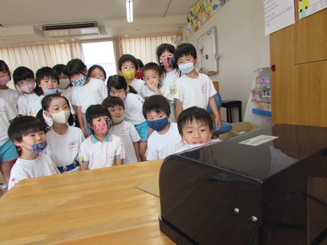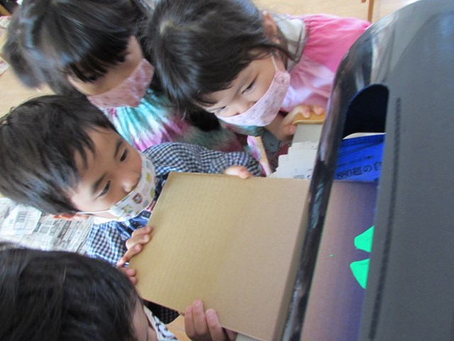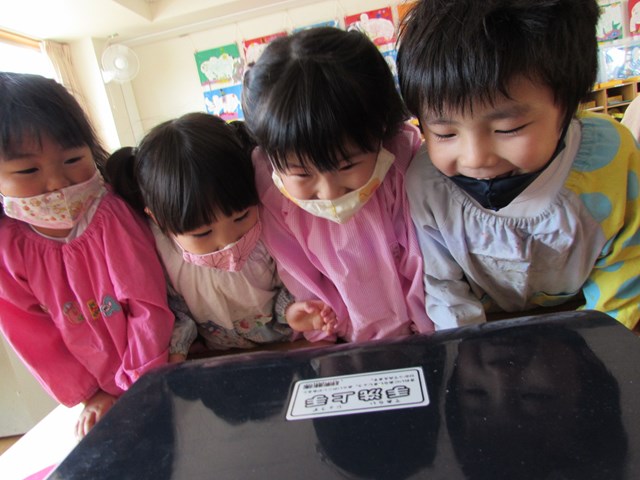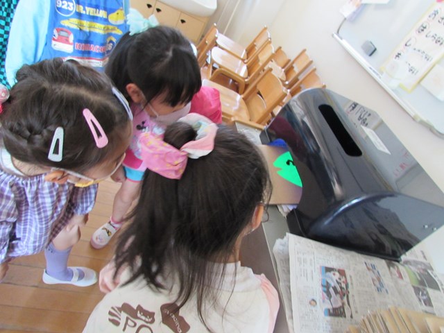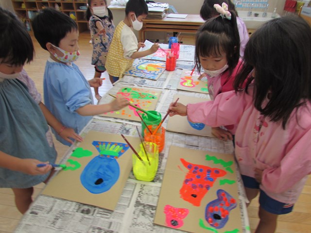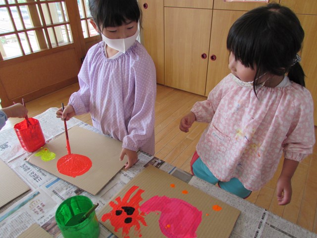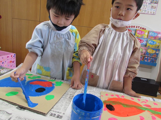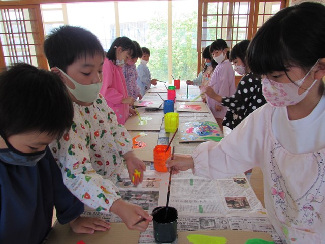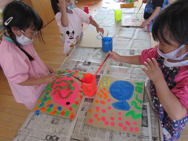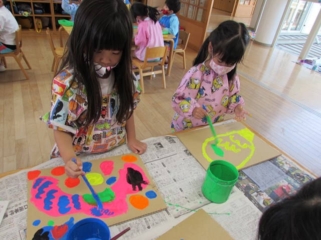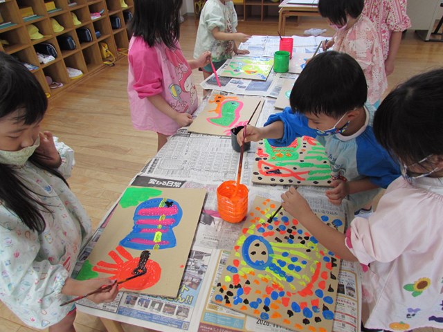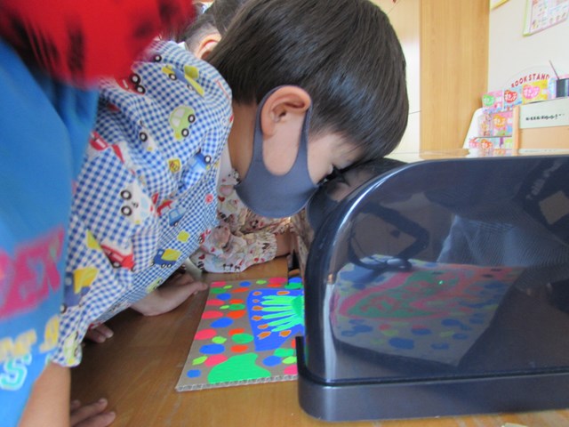 7日から10日までの「アートウイーク」。新しいことにたくさん触れて、子どもたちの豊かな発想を引き出し、遊びがさらに広がっていくよう取り組んできました。アートウイーク後半は、光のアートです。「光る絵の具なんだよ」と話すと、「夜になると光るの?」「どうして?」不思議そうな子どもたち。部屋を暗くして、蛍光絵の具で描いた絵をブラックライトにかざすと「すごい!」「光ってる」「きれい」「魚が泳いでいるみたい」と驚きの様子でした。