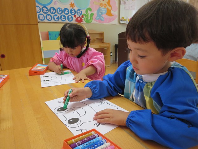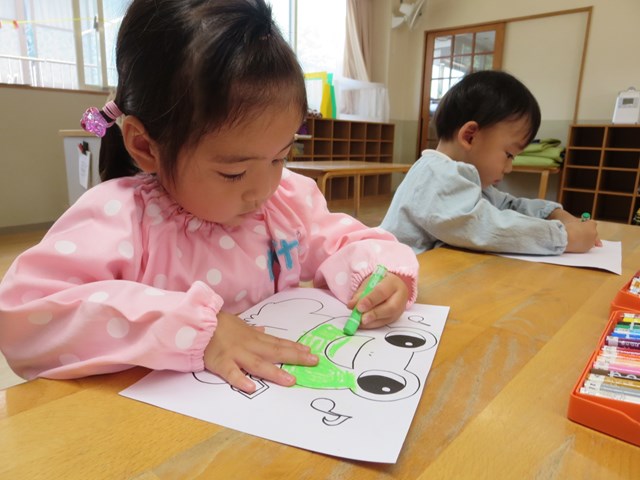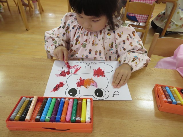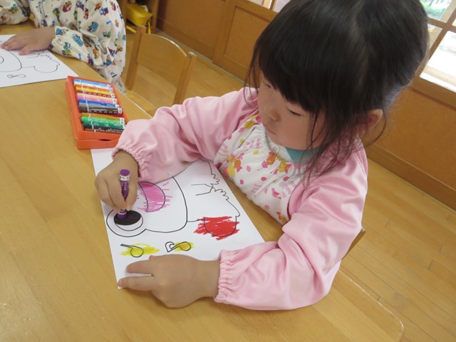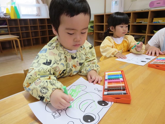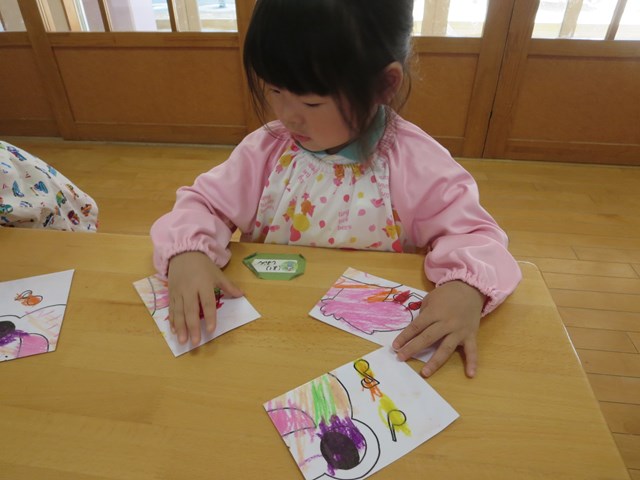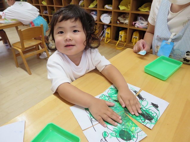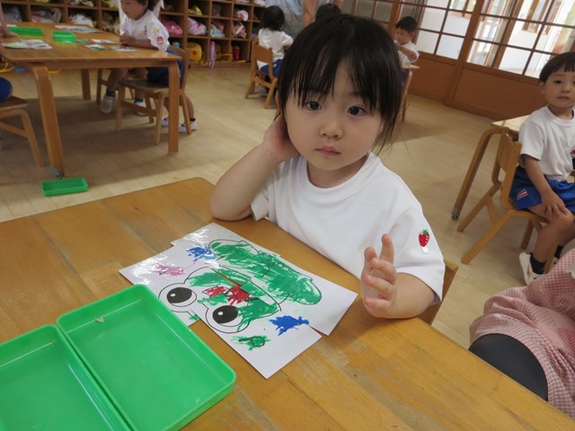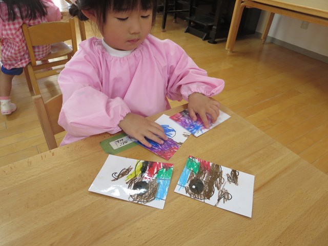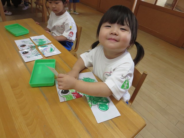 ピタゴラスウイーク(満3歳児) 2021.06.20 手作りパズルで遊ぶ まずはカエルの色塗りです。好きな色で塗っていきました。できた絵を半分に切って、2枚のパズルを合わせました。「できた!」とすぐに完成しました。次は4分の1に切って4枚パズルです。足がなかなか合わない子も少しヒントをあげると、あとは自分で考えることが出来ました。 < >