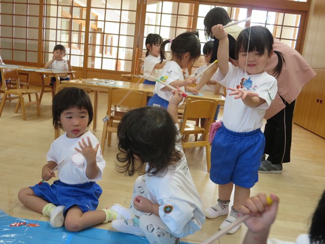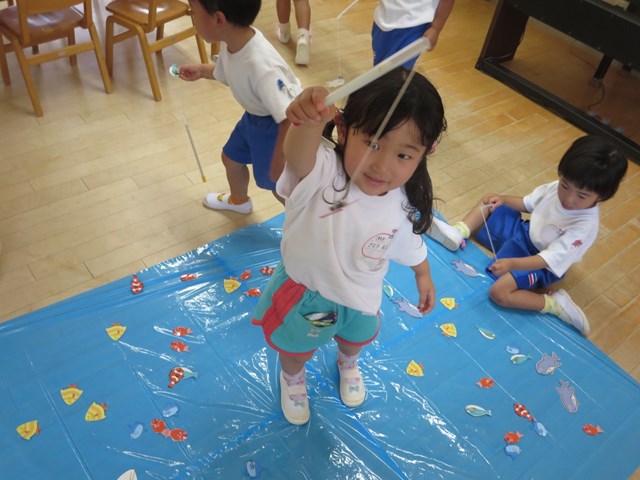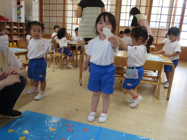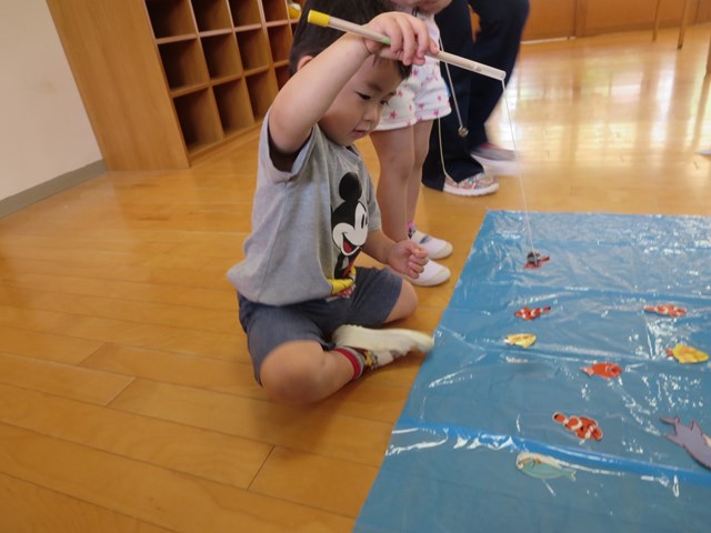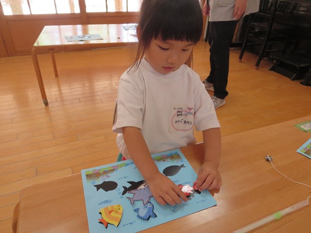 魚釣り遊び(満3歳児) 2021.06.26 きれいなお魚釣ったよ! 『海』に泳いでいる色々な魚を釣りました。釣った魚はシルエットが描かれたところへ当てはめていきます。同じ形を認識しながらきれいな魚が並べられていきますが、ときには同じ魚を釣ってしまうこともありました。そんなときは「逃がしてくるね」「バイバイするね」と海へ戻していました。みんな6種類の魚が釣れて大満足でした。 < >