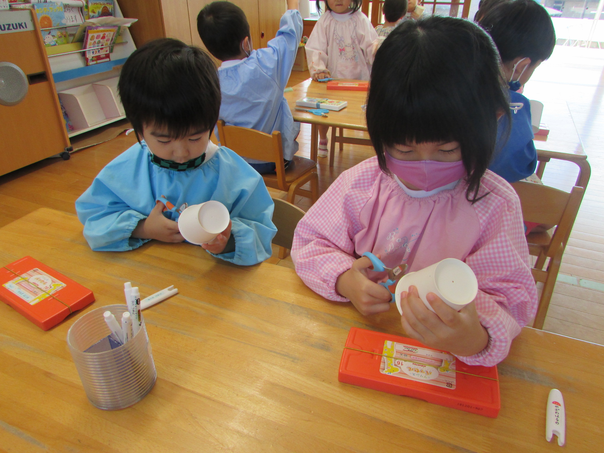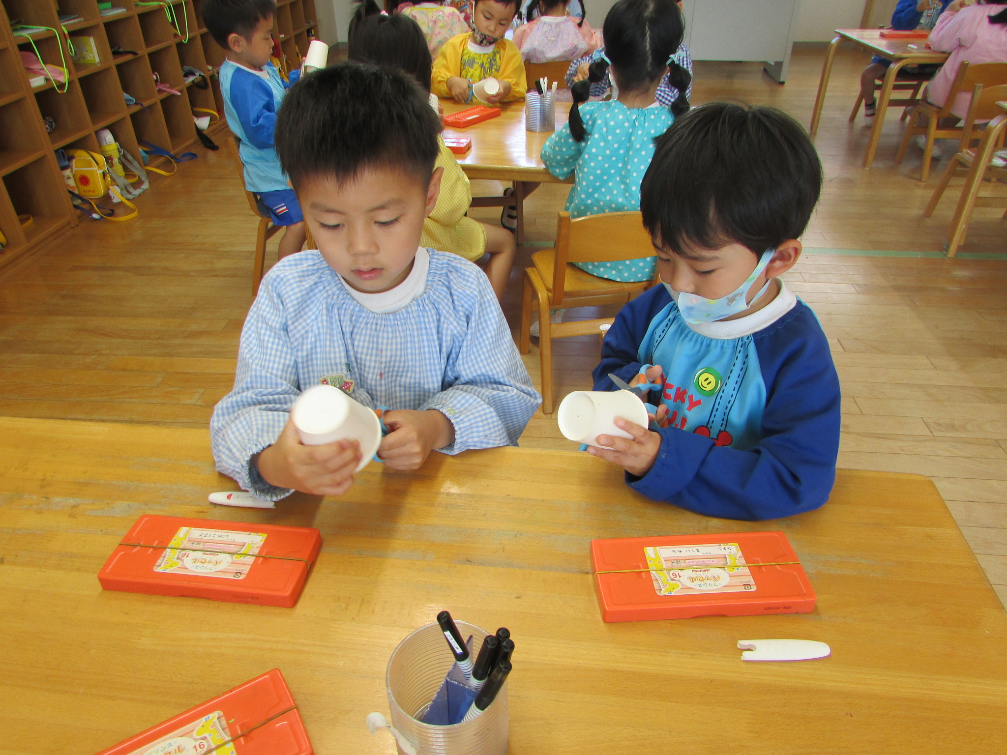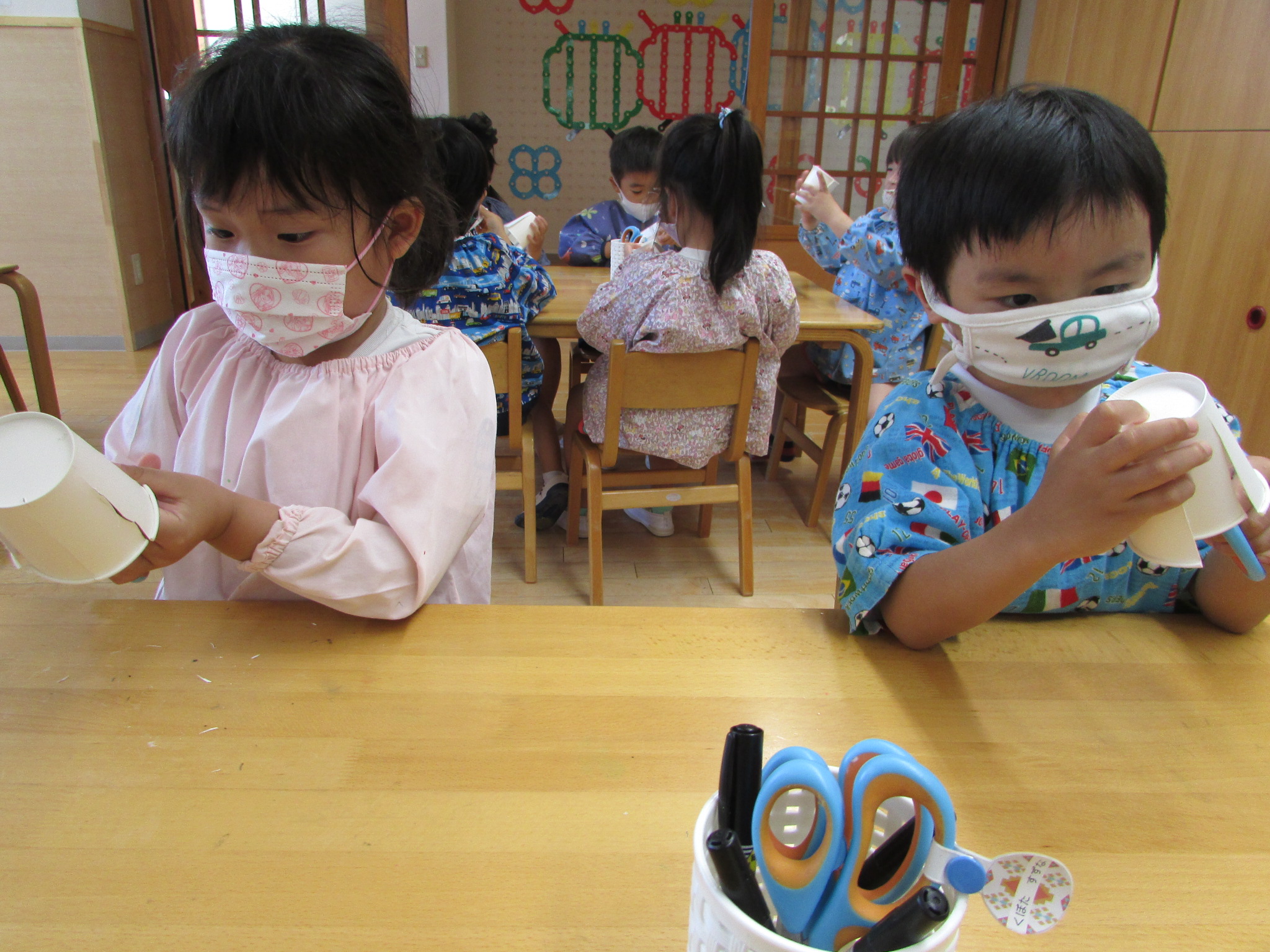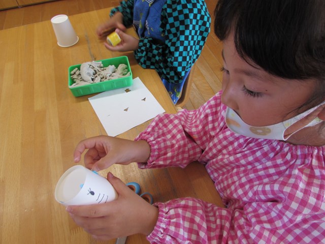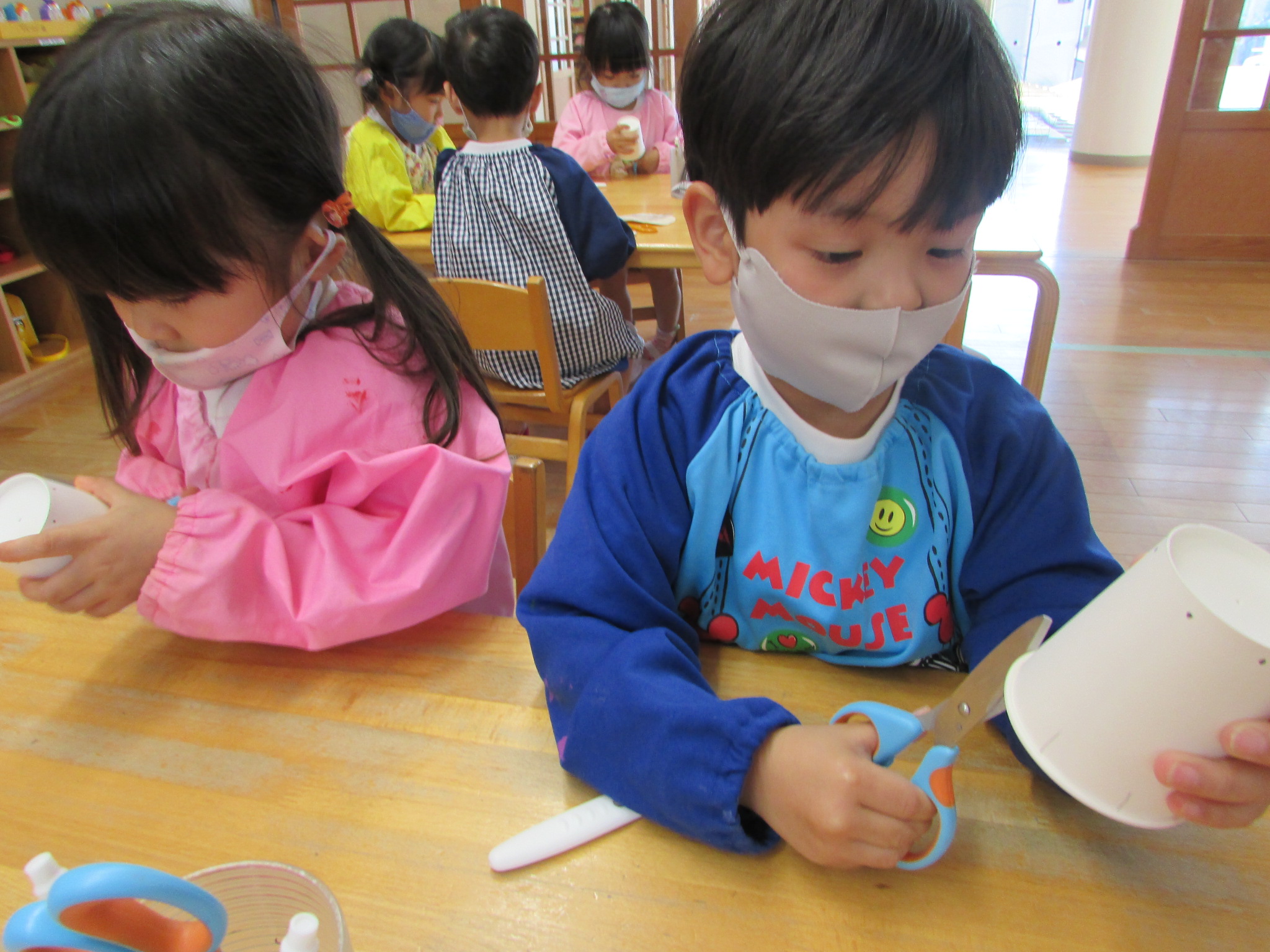 年中組 切りなれていない紙コップを一生懸命ハサミで切る子どもたち。真剣な表情で紙コップと向き合い、点から点までハサミを動かし、真っすぐに切ることができました。