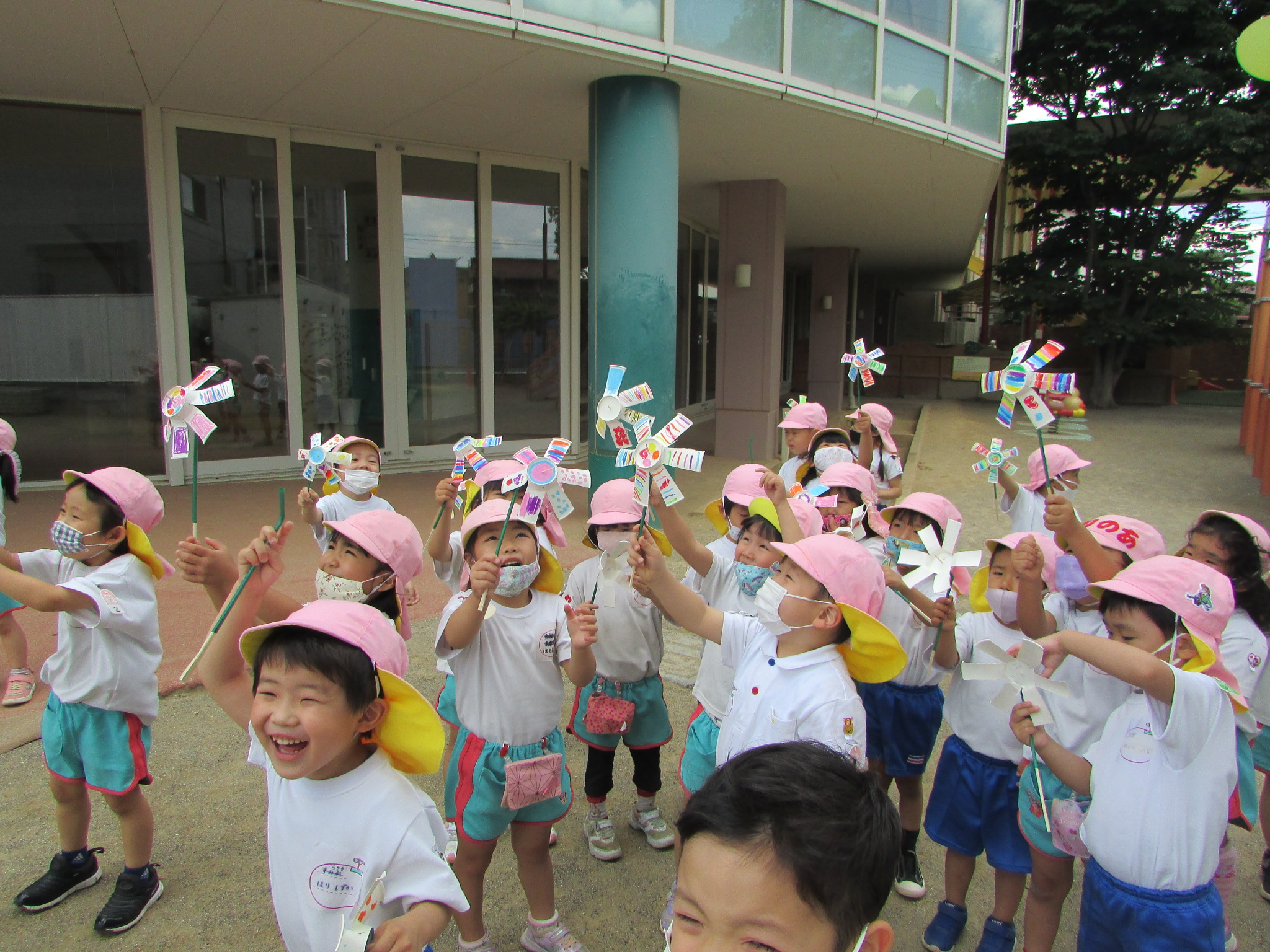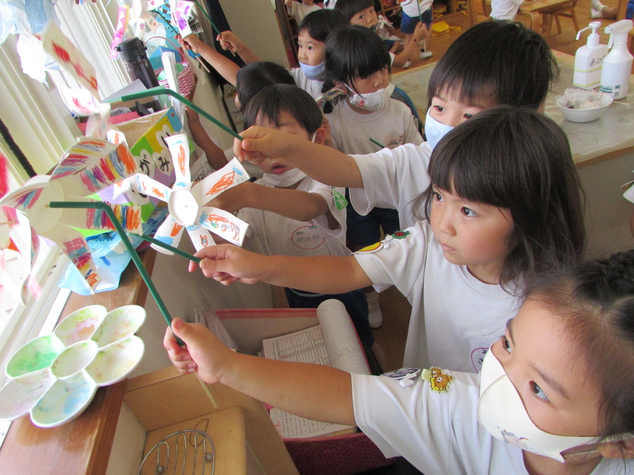 ストローをさして完成です。「ここは風が来るよ」「扇風機のところがいいね」「外へ行ってみよう!」と風を感じる場所を探して、回ることを試すことができました。