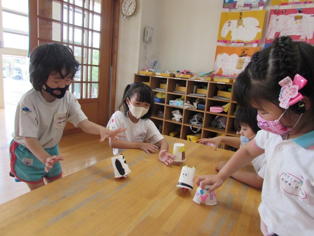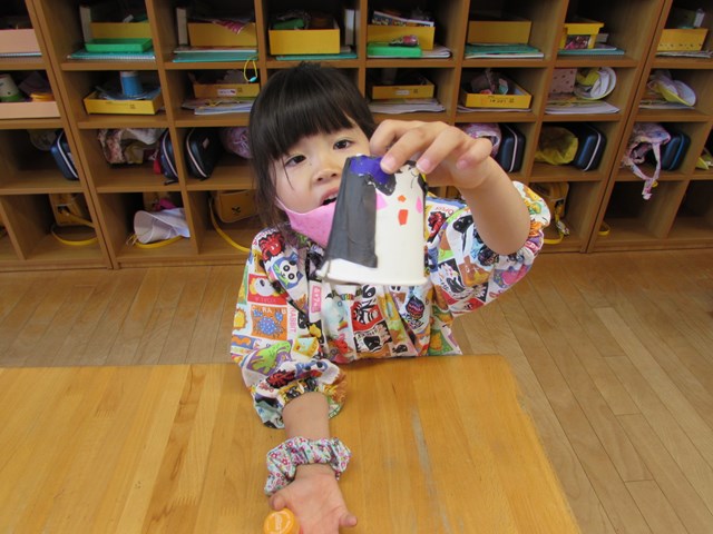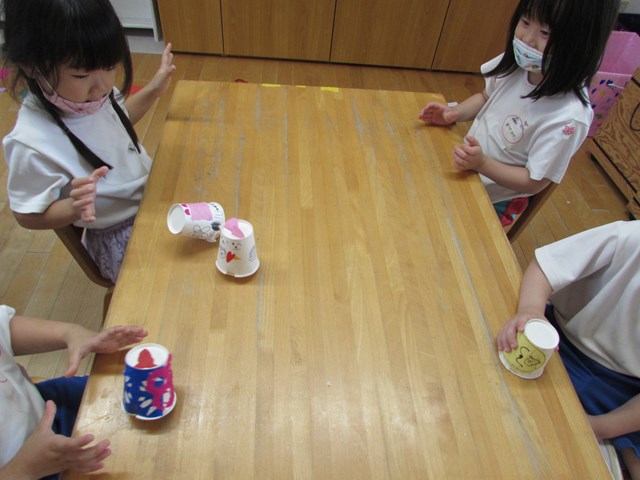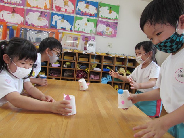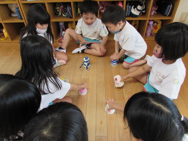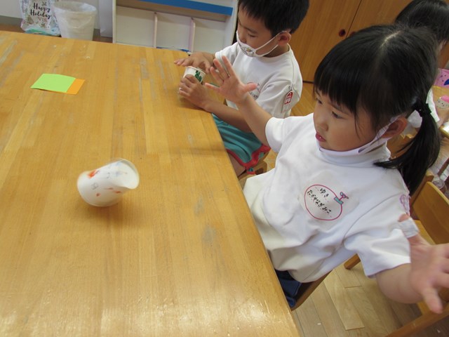 紙コップを自分の方に引き寄せて手を離すとコロコロと前に進み大喜び!3.2.1とカウントを数えて楽しんでいました。「ゴムが回転するから動くんだね」と動く仕組みに気づくことができました。