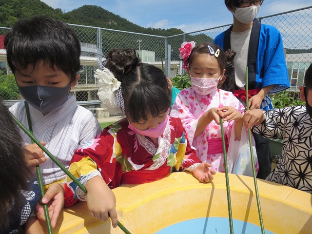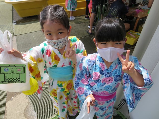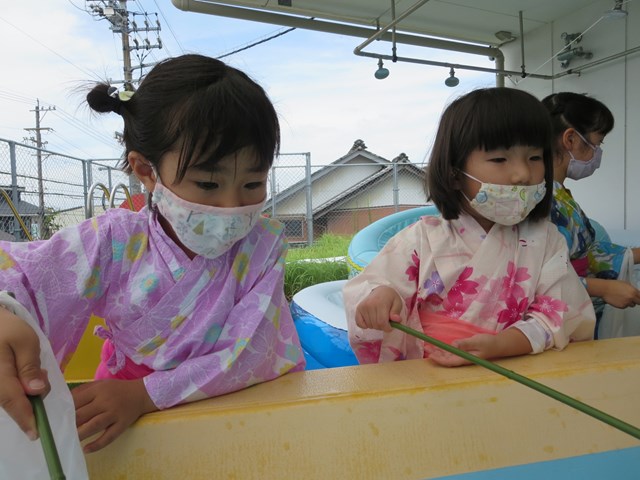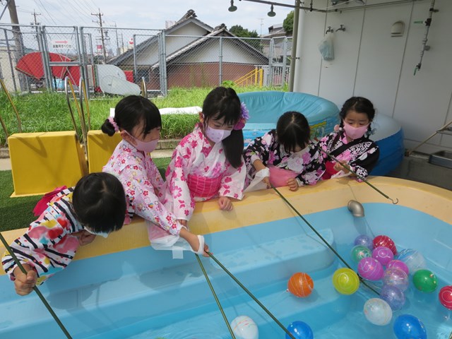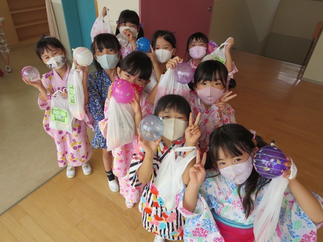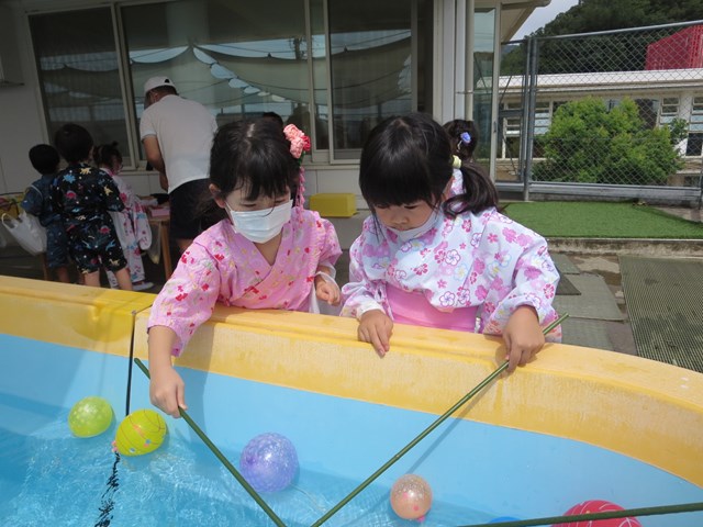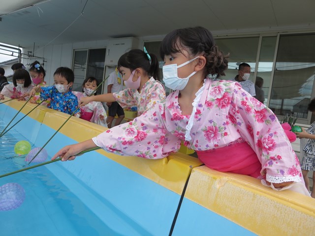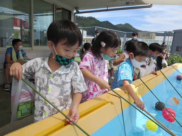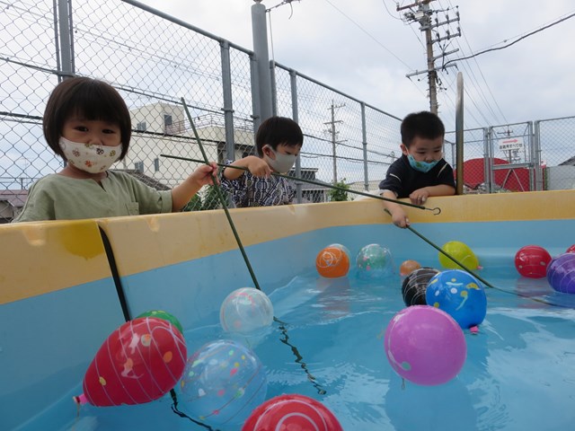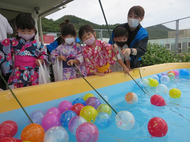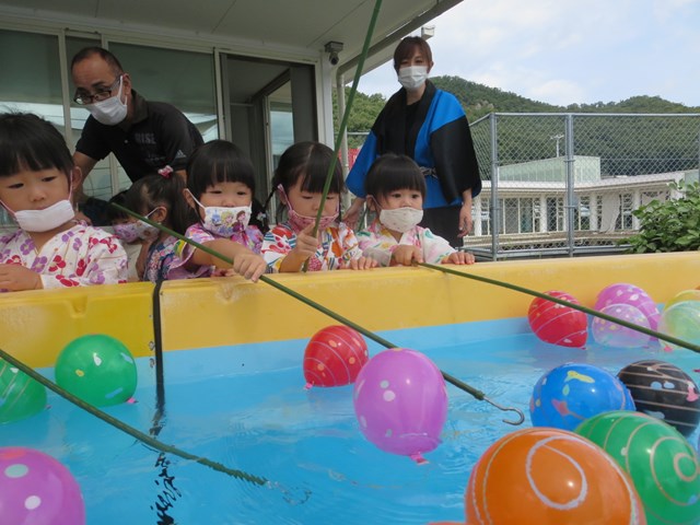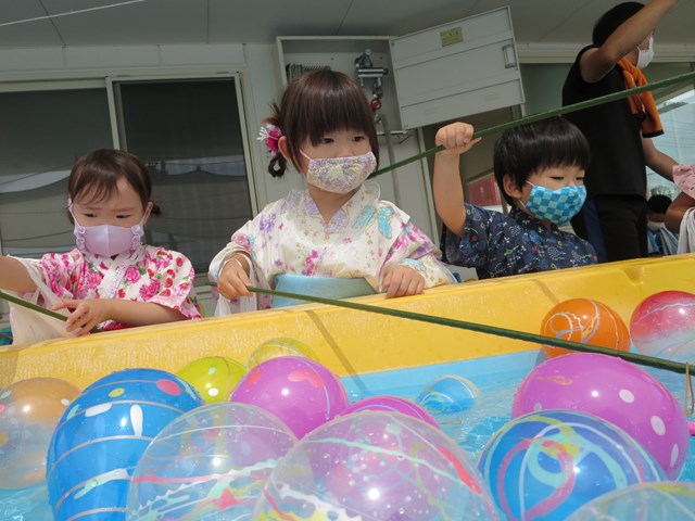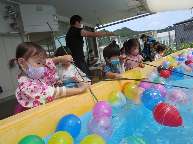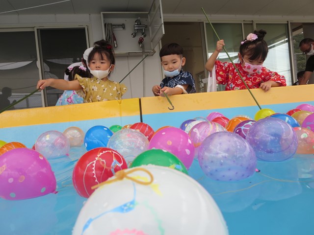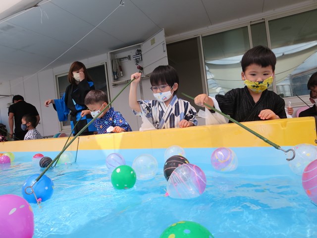 夏まつり②ヨーヨー釣り 2021.09.01 どれにしようかな~ お目当てのヨーヨー風船にねらいを定めて釣り竿を操りますが、なかなか思うように引っ掛かりません。何度もチャレンジして、釣れた時は大喜びでした。 < >