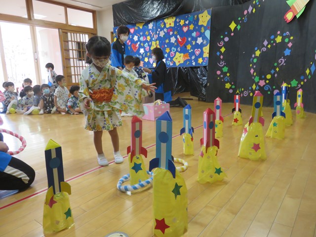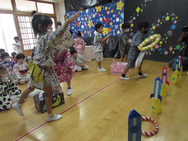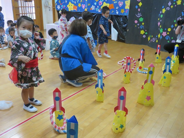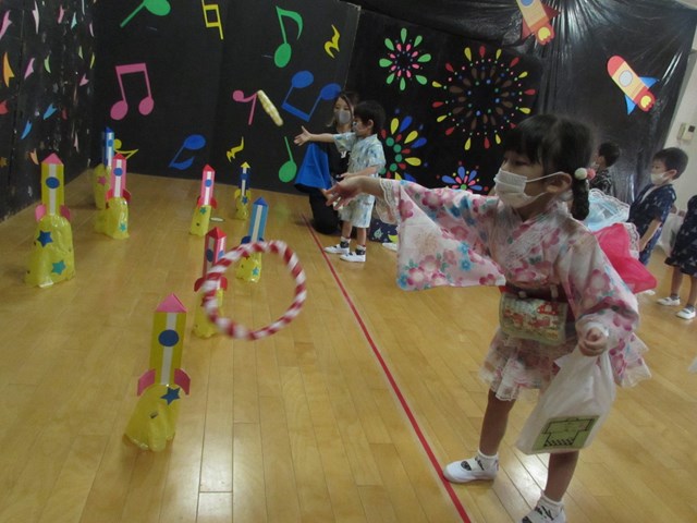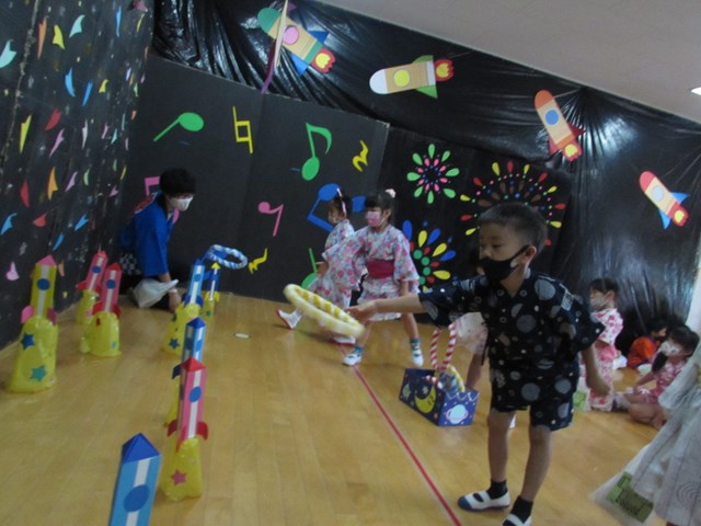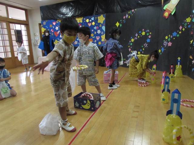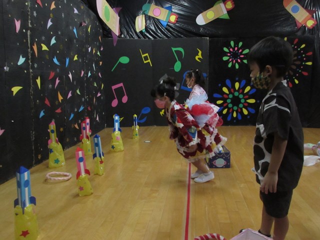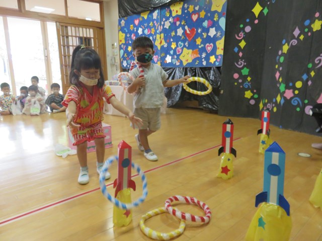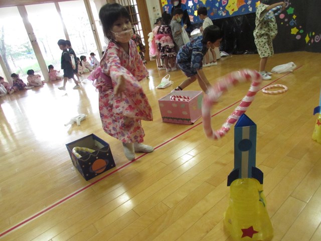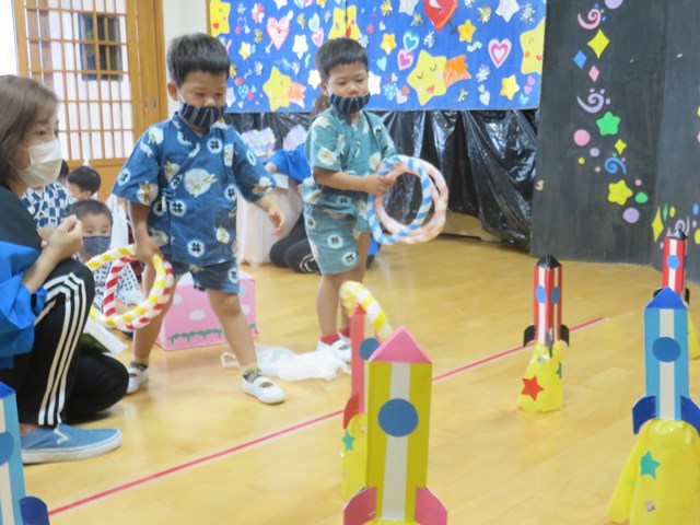 夏まつり④ロケット輪投げ 2021.09.01 ええい! 輪っかをロケットめがけて投げます。近くを目指して投げる子や、遠くに向かってチャレンジすること、それぞれに目指す方向に身を乗り出して輪っかを投げました。 < >