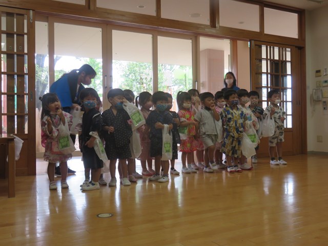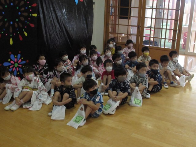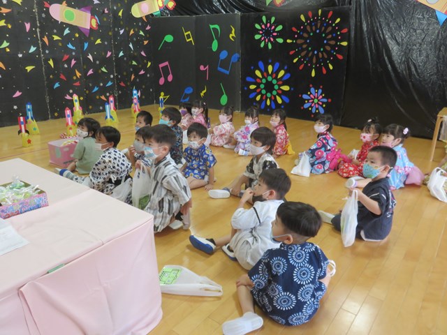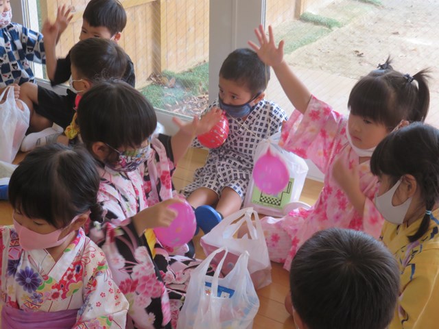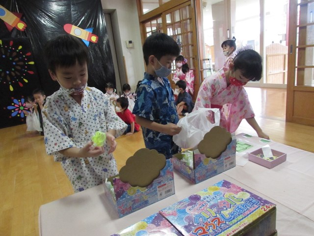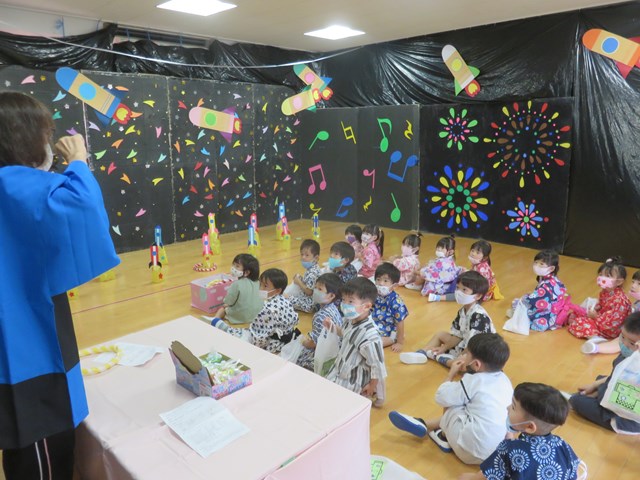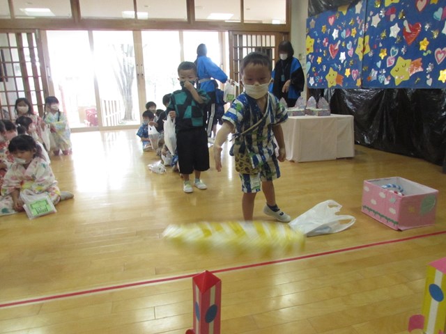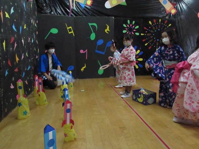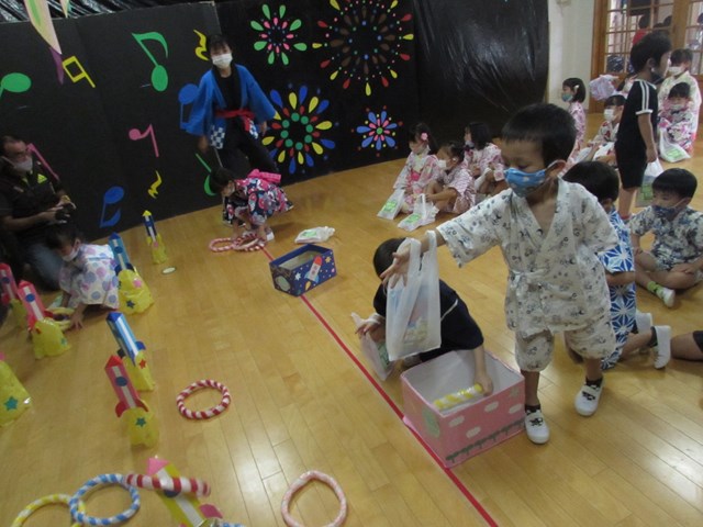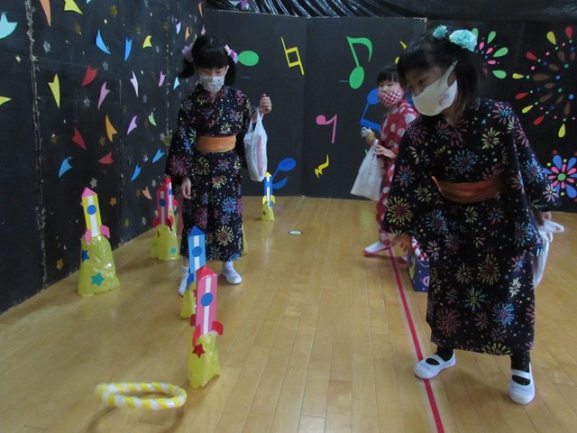 夏まつり④ロケット輪投げ 2021.09.01 ええい! 輪っかをロケットめがけて投げます。近くを目指して投げる子や、遠くに向かってチャレンジすること、それぞれに目指す方向に身を乗り出して輪っかを投げました。 < >