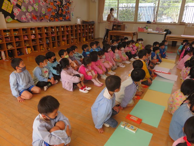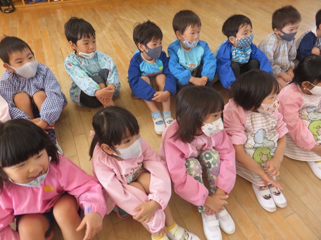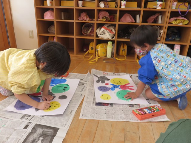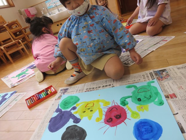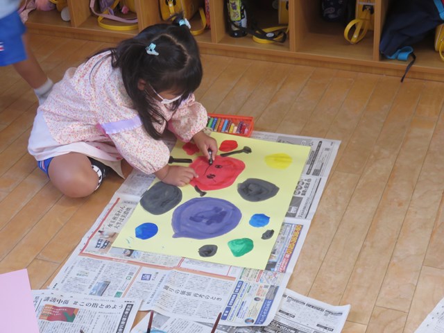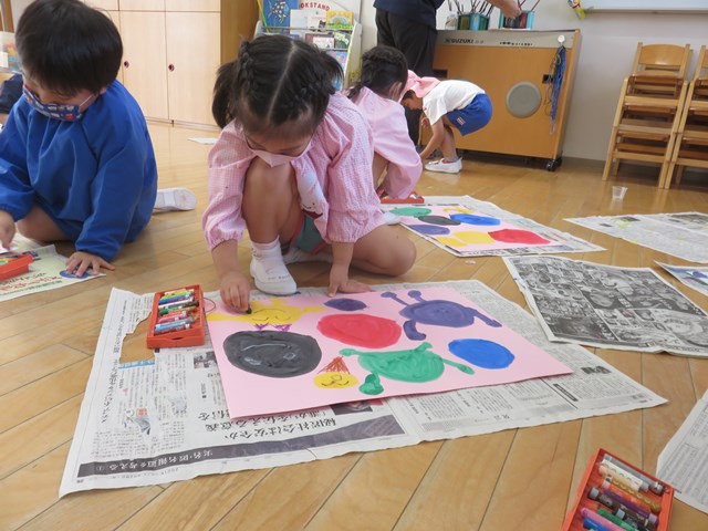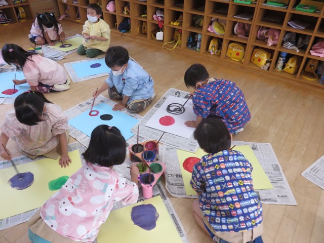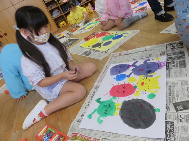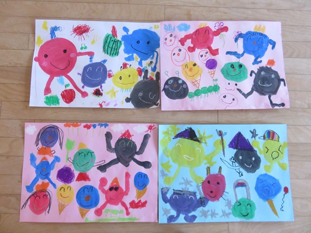 『あかまるちゃんとくろまるちゃん」のお話が聞いて絵を描きました。まず最初に6色の絵の具を使って丸を描きます。大きな丸や小さな丸を描き、丸や色からイメージを広げていろいろな物に変身させていきました。コーンを描いてアイスクリームにしたり、耳を描いて動物にしたり、お話の世界がどんどん広がります。「描いていたら楽しくなってきた!」「もっといろいろな丸描きたい!」と子どもたちの描画意欲は止まりませんでした。