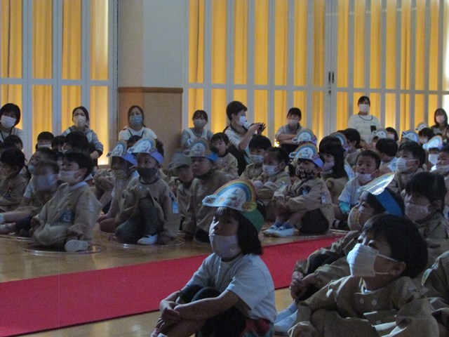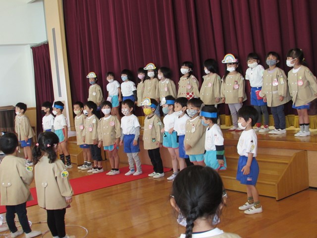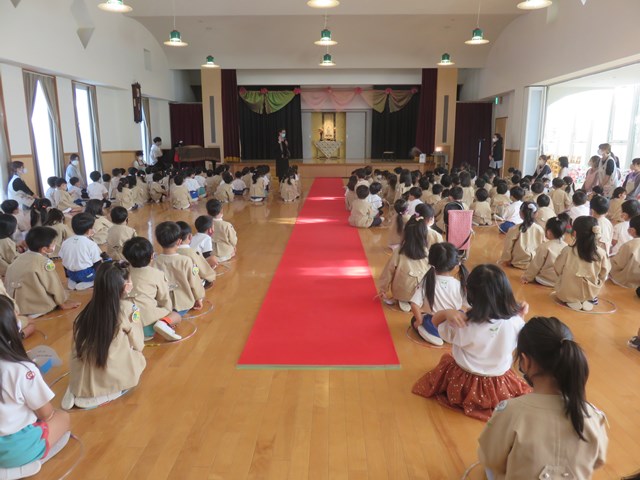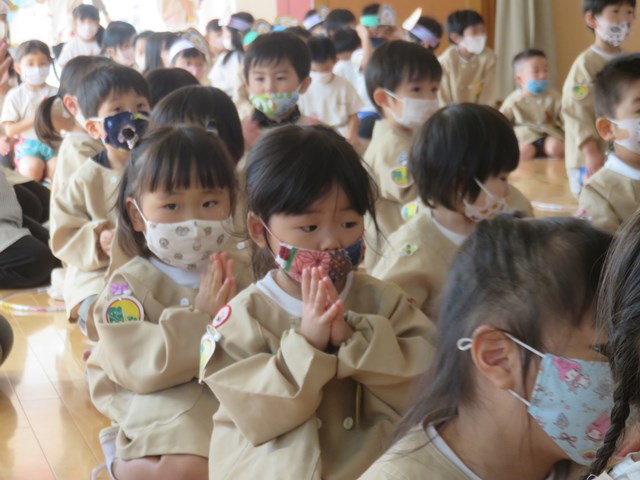 緊急事態宣言のため、8月~10月の誕生日のお祝いを一緒に行いました。まずは「幼児のおつとめ」からです。みんなと一緒にいることの幸せや、大きくなることの喜びを感じる集いとなりました。