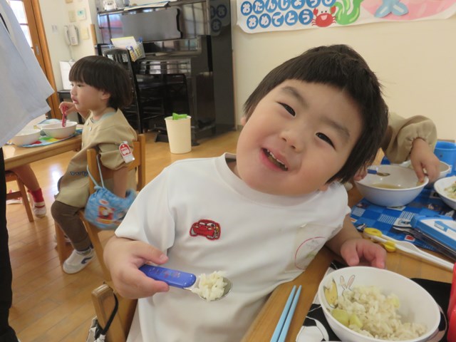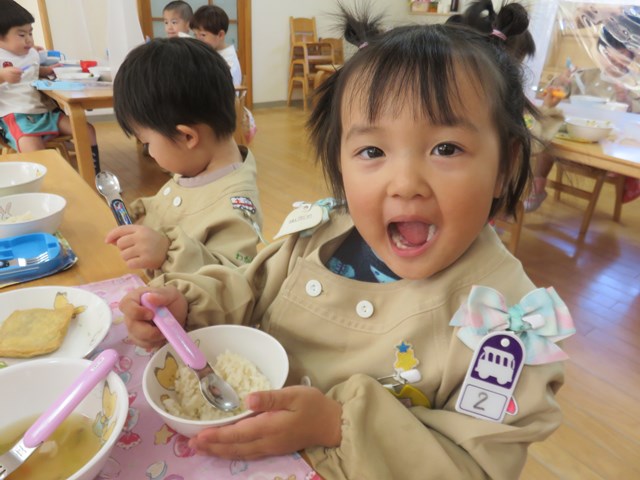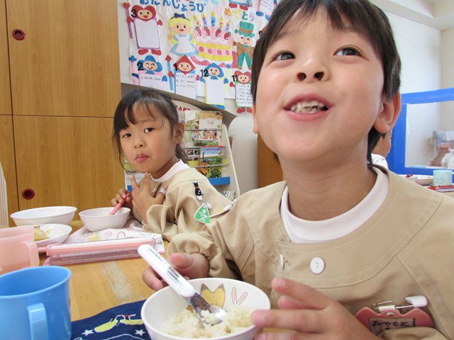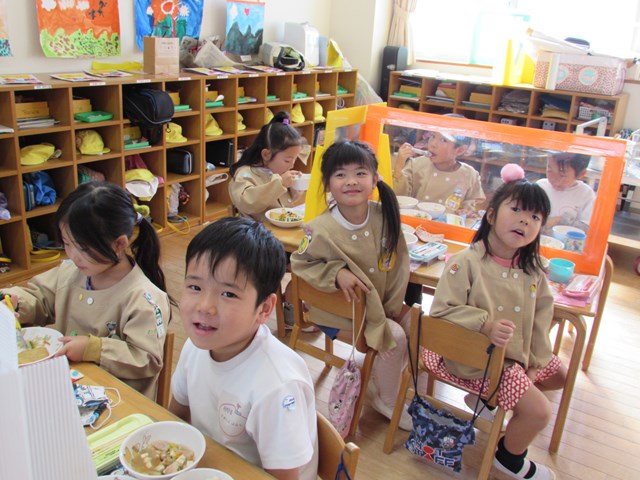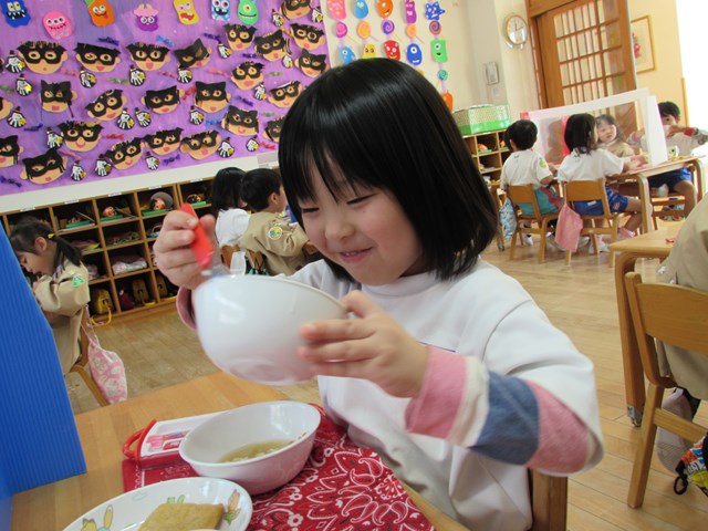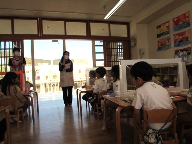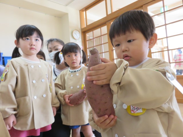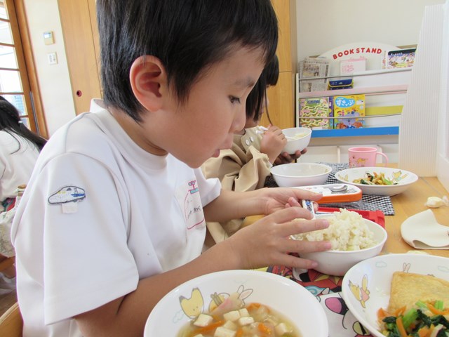 4日のメニューは、ご飯、五目豆腐スープ、加賀包み煮、おひたし、キャンディチーズでした。ご飯は、先日収穫したさつまいもを入れて、さつまいもご飯にしました。「甘くて美味しい!」「サイコー!」「家でも食べたよ!」「私はリンゴとさつまいものデザートを作ってもらった!」「蒸しパン作ってくれた!」「味噌汁に入れた!!」「おじいちゃんちでやきいもした!」「年少の とき天ぷら、年中のときも天ぷら、年長も天ぷら!!」等会話も弾みながらおいしくいただきました。持ち帰ったさつまいもはご家庭でいろいろな物に変身したようですね。