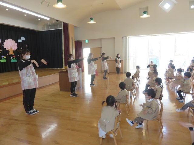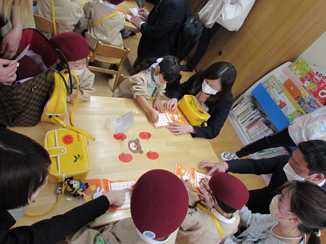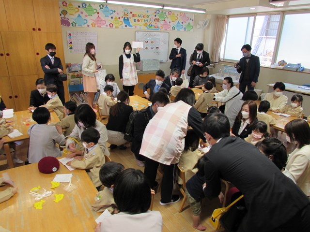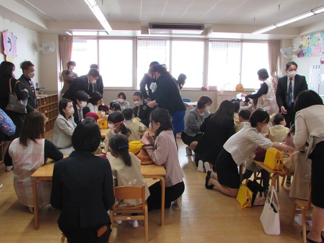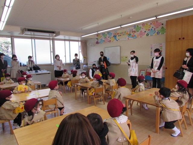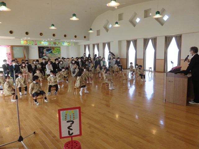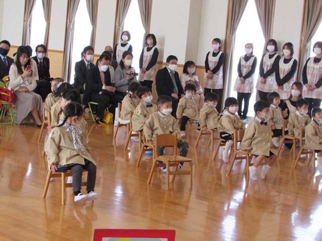 令和4年度 入園式 2022.04.08 喜びの春、新しい春 幼稚園は、『子どもが初めて出会う学校』です。子どもたちは、家庭の子から社会の子へと一歩踏み出しました。一人一人の成長を願い、寄り添っていきたいと思います。どうぞよろしくお願い致します。 入園式はクラスごとに行いました。真新しい制服に身を包んだ新入園児は緊張気味です。 手遊びを楽しみました。 クラスへ移動し先生から話を聞いたり、シールを貼ったりしました。幼稚園生活への期待が高まります。 < >