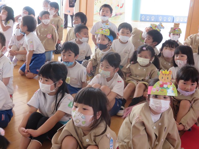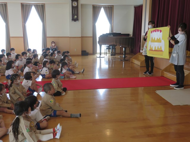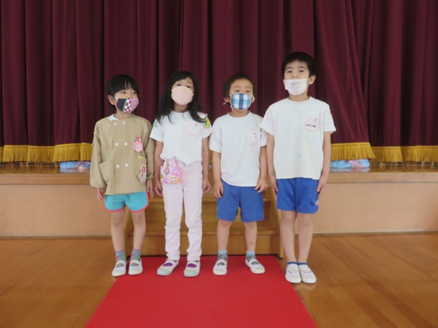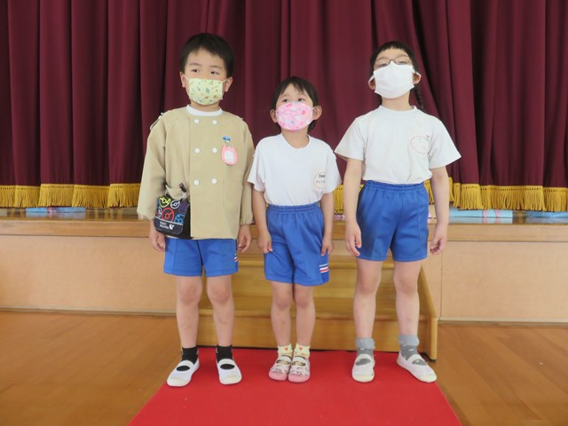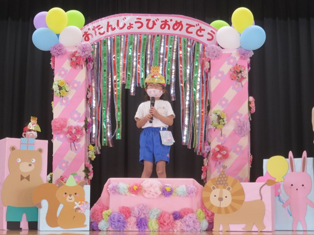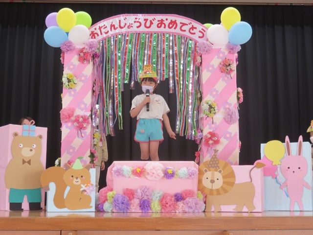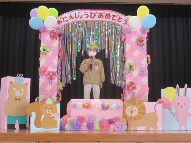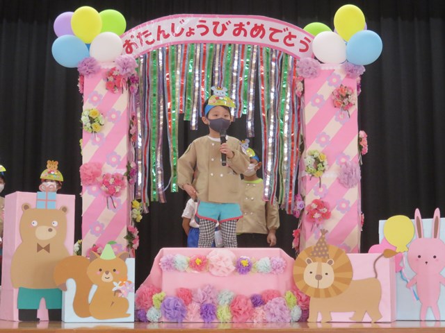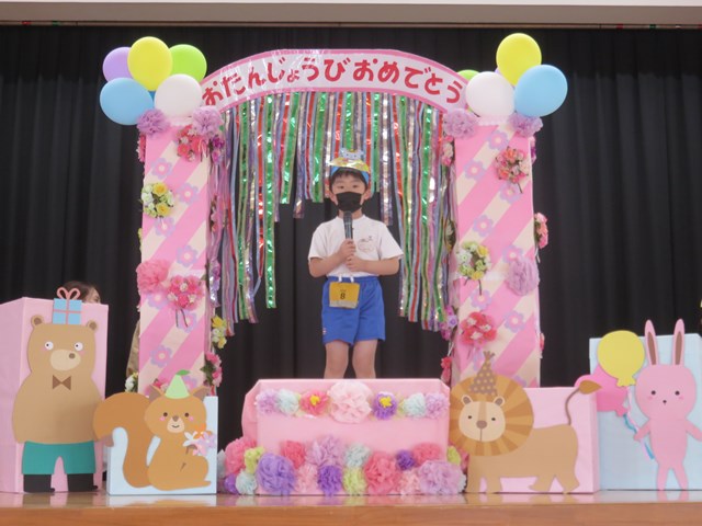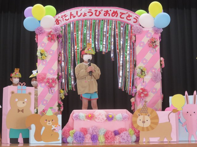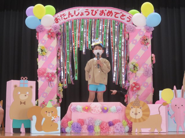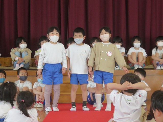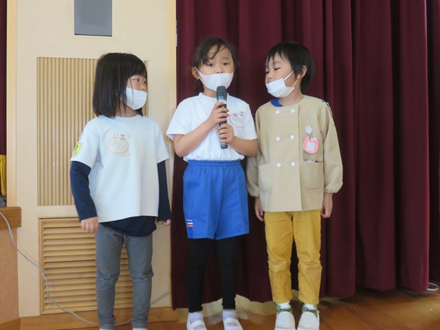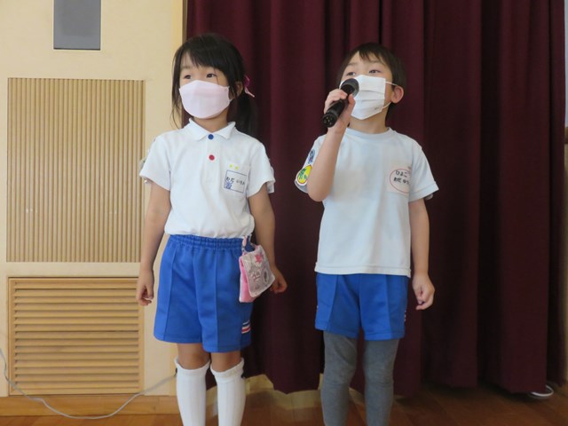 主役のお友達は、マイクを持って話します。年少組は名前と好きな食べ物、年中組は名前と好きな遊び、年長組は名前と将来の夢です。