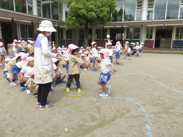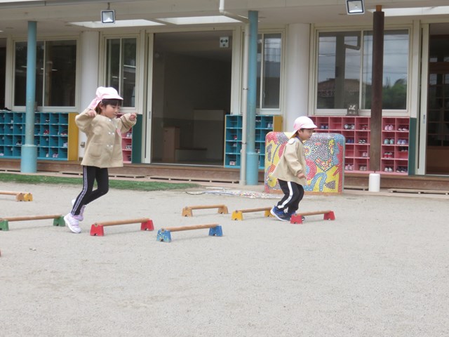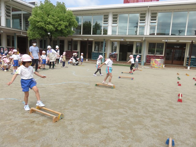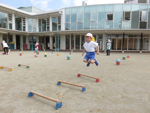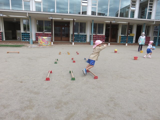 わんぱくひろば(年長組) 2022.04.28 走って、跳んで 障害物リレー! 慎重に進む子、1位を目指して全速力で走る子等、一人一人が最後まで頑張る姿を見せてくれました。 くねくねラインを走ります。 運動棒から落ちないように進みます。 運動棒を三つ飛び越えます。 ボールを運んだら折り返しです。 次のお友達にバトンタッチです。 < >