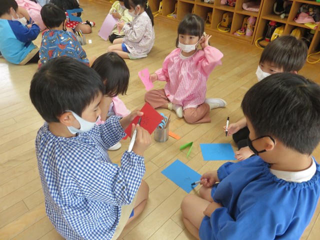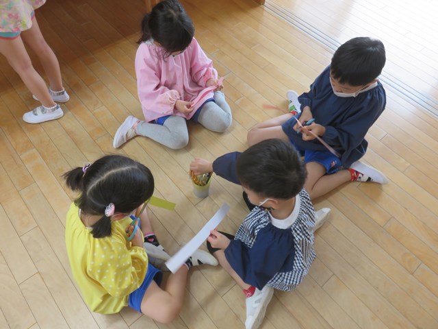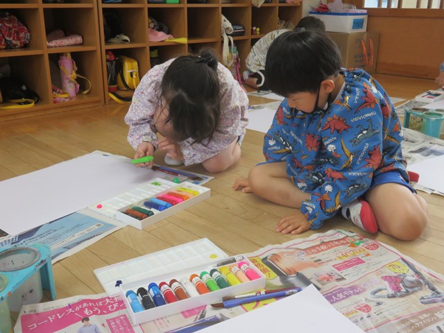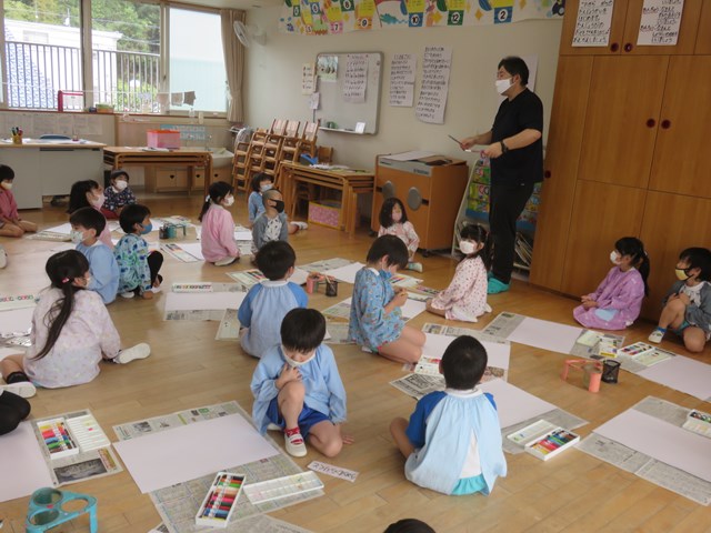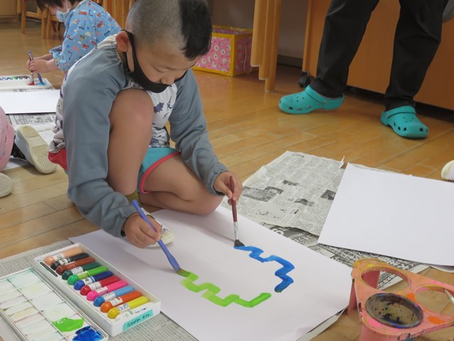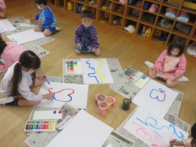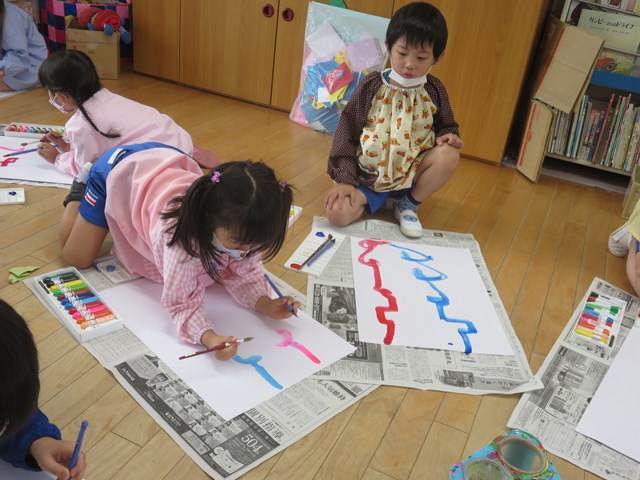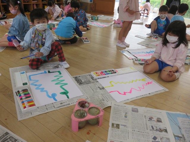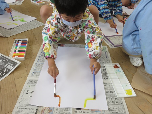 わくわくアート(年長組) 2022.05.13 両手で描こう! 年長組になり、初めてのわくわくアート。講師は野田智之先生と安田麻美子先生です。久しぶりに会う先生たちにみんなは大喜び。 まず一つ目は簡単にできるマジック作り。 本題に入ります。テーマは「両手で描こう」です。自分の好きな色を2色選び、2本の筆を同時に動かす技法。「ハートの模様だよ!!」「くねくねビーム描いたよ!」と思い思いに筆を動かして楽しんでいました。 < >