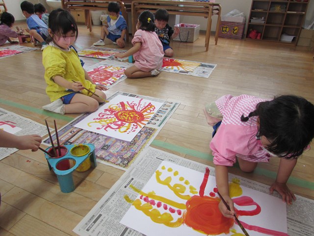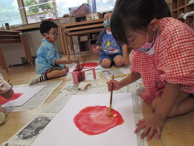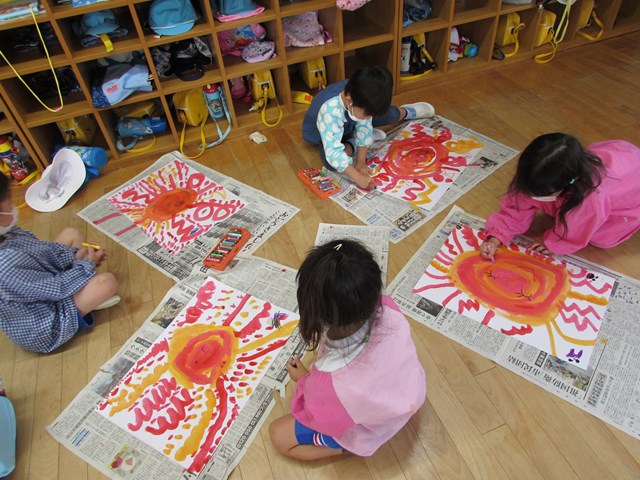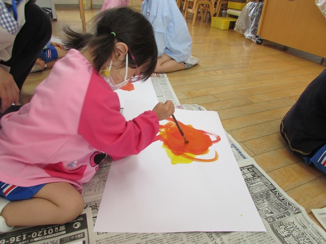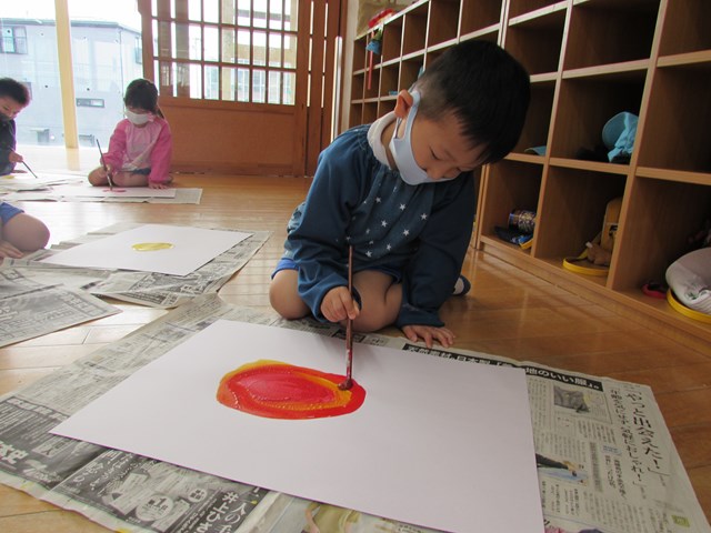 今回のテーマは「元気な太陽」です。最初は赤と黄色の絵の具で丸を描きました。2色が混ざるとオレンジ色に変化することを喜び、ぐるぐると筆を動かして楽しんでいました。