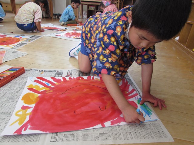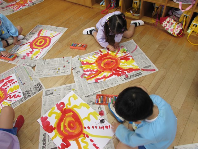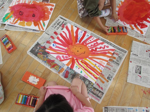 最後はクレヨンで、太陽の顔や、虫、花、乗り物、すいか、アイスクリーム等思い思いに描きました。