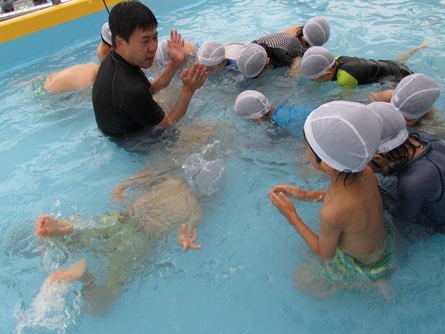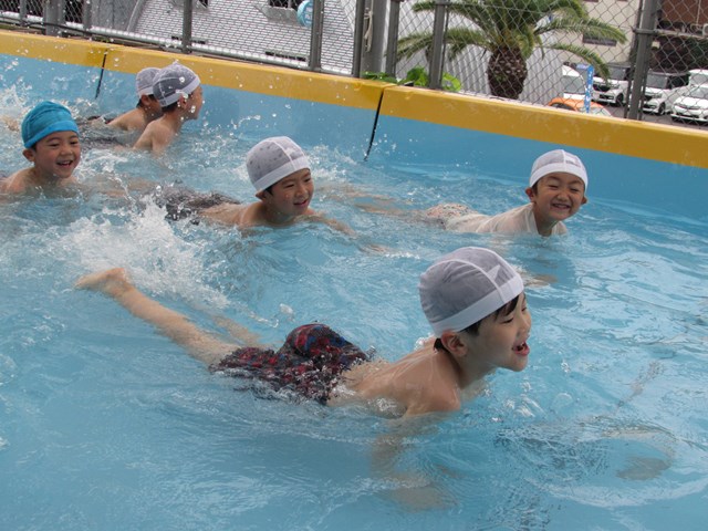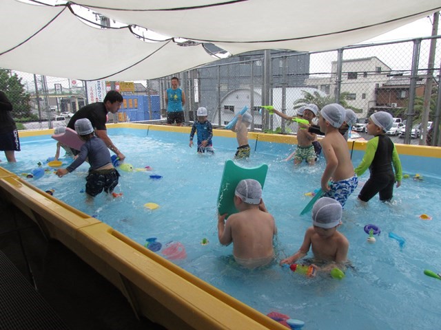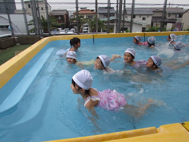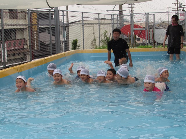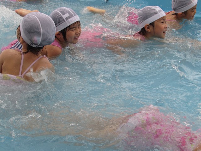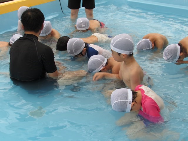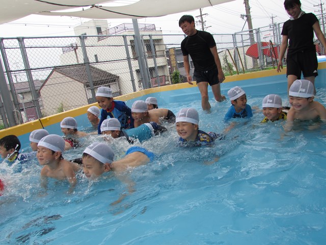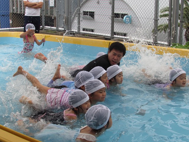 シャワー、消毒槽につかり、いざプールへ。指導する係り、安全を守る監視係りと、子どもたちが楽しくプール遊びが出来るように職員みんなで見守り、援助していきます。本日のメニューは、ビート板を使ってバタ足の練習、ワニ歩き、顔つけ、輪くぐり、おもちゃで遊ぶ、水のかけあい等です。さすが年長さんです。ダイナミックな動きを見せてくれる子もいました。