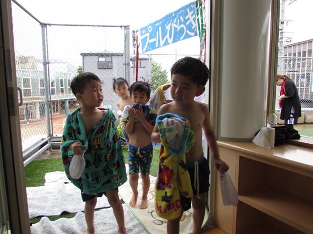 プールバッグを持ってうれしそうに登園してきた年長組の子どもたちでした。