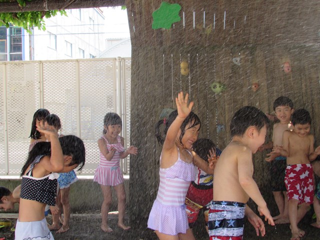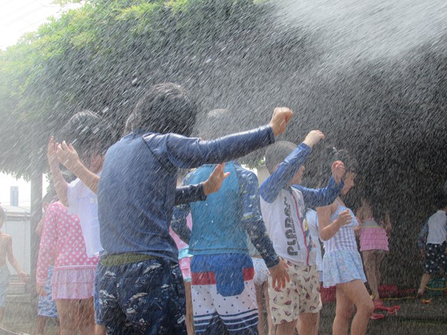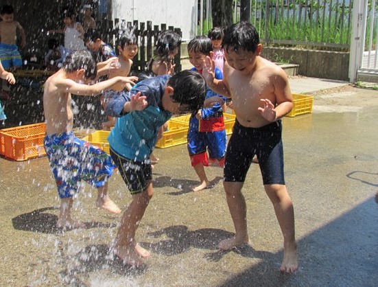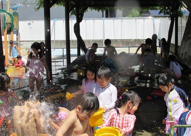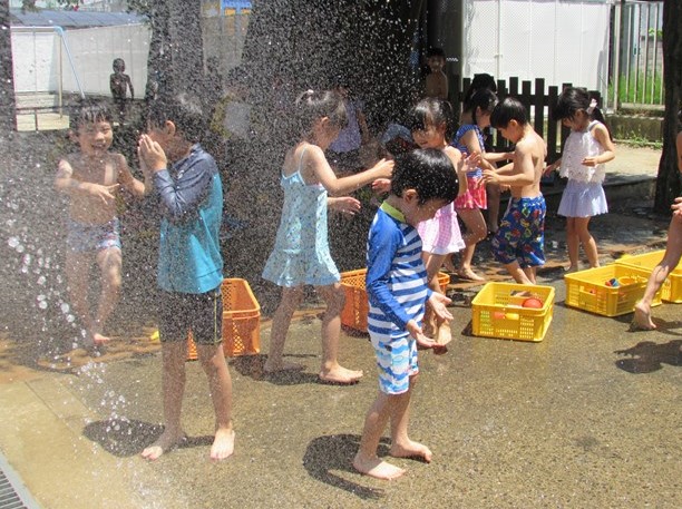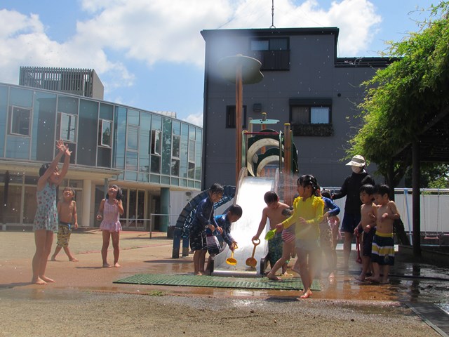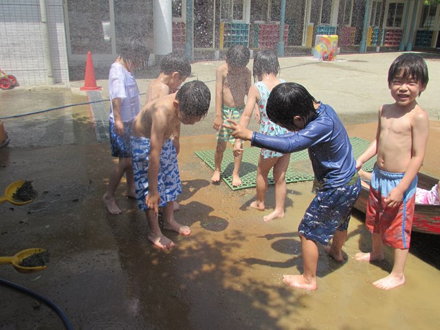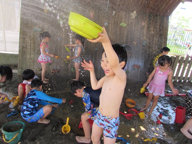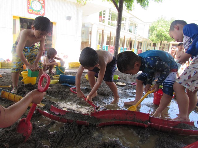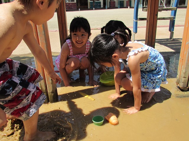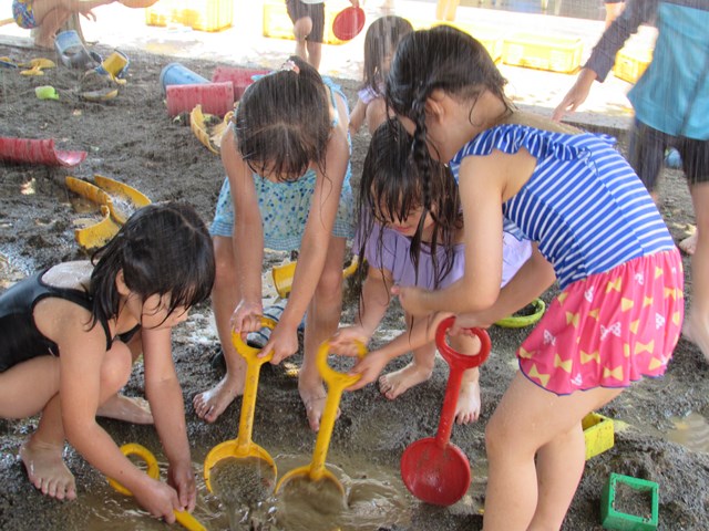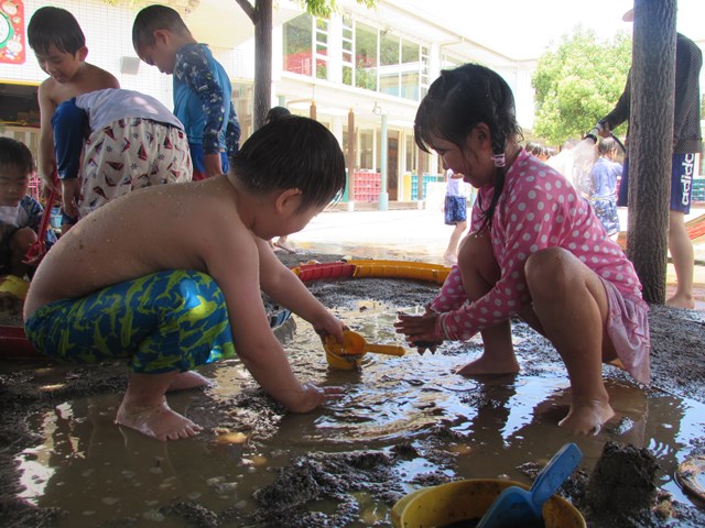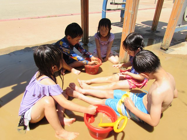 泥遊び 年長組 2022.07.07 笑顔輝く! 水着に着替えると、すぐに友達を誘い遊び始めました。迷路や道を作ったり、穴を深く掘って池や川を作ったり、濁った水をコーヒーに見立ててコーヒー屋さんごっこをしたり、水浴びを楽しんだり、色々な遊びをと提案しながら普段できない体験にうれしそうな子どもたちでした。泥の感触を味わったり、友達とコミュニケーションを楽しんだりして、豊かな時間を過ごすことができました。 < >