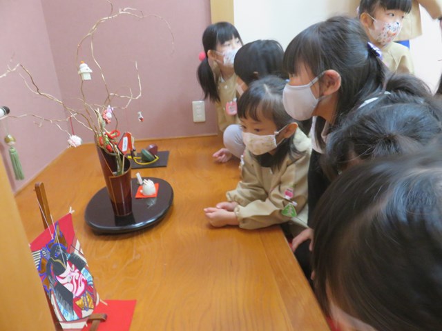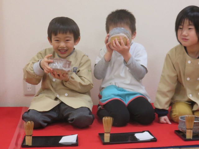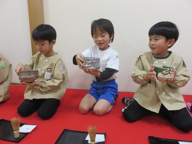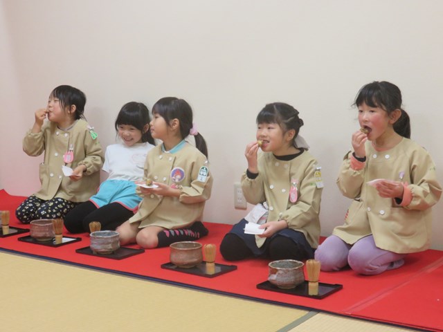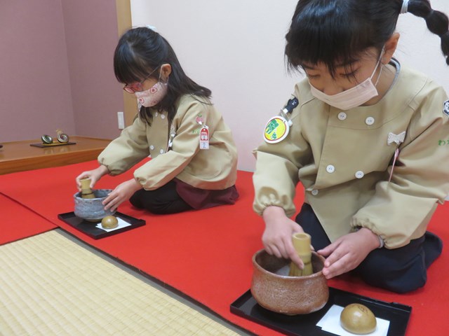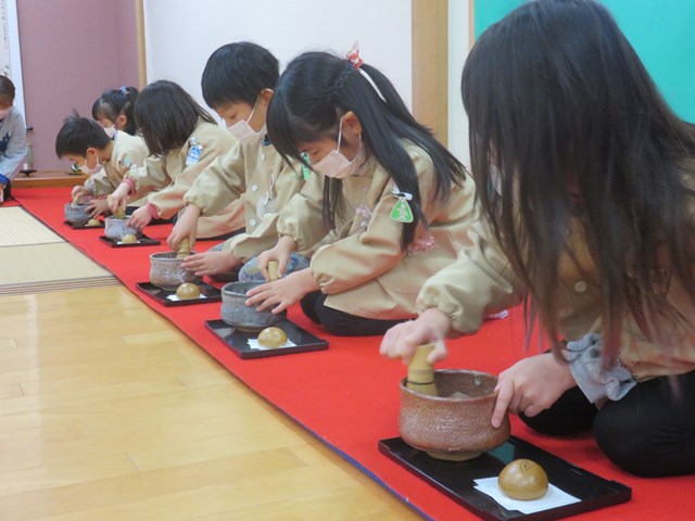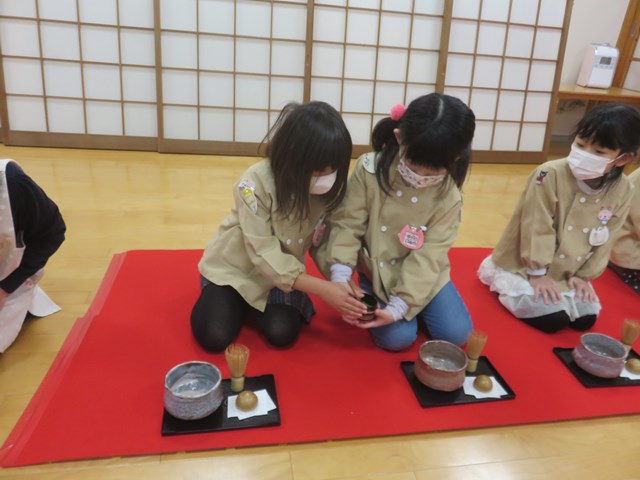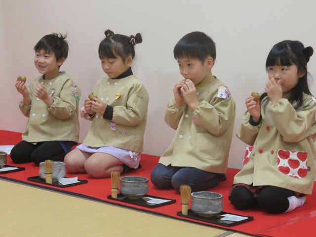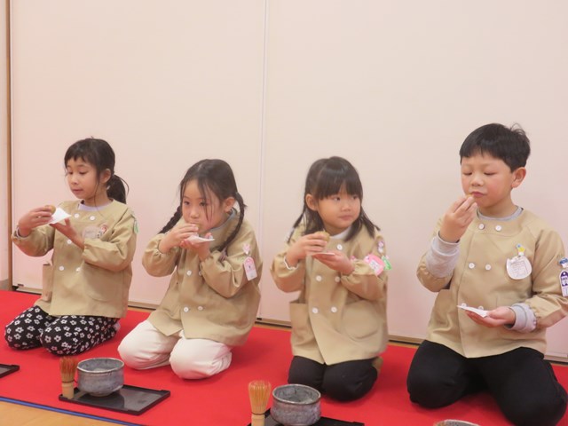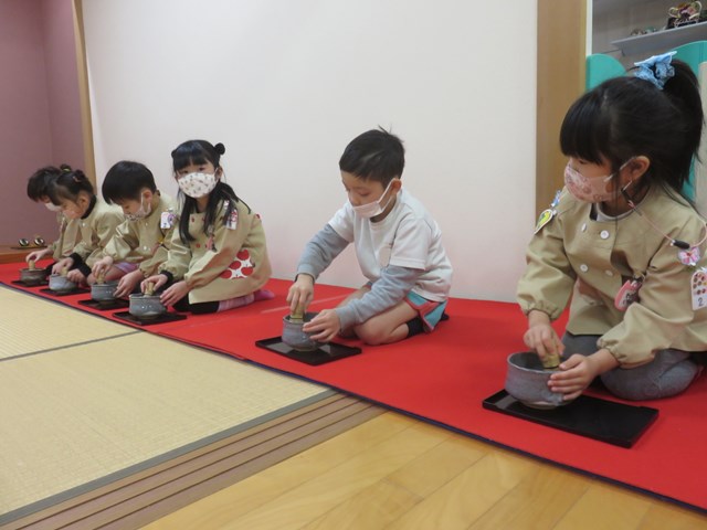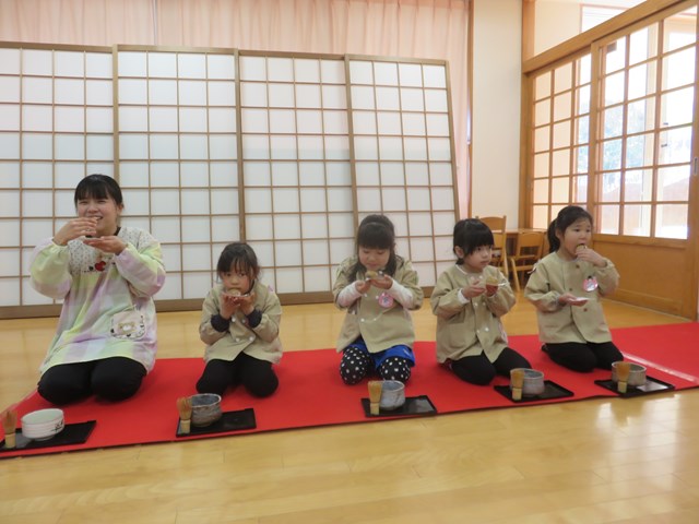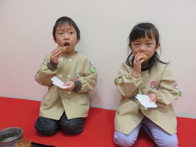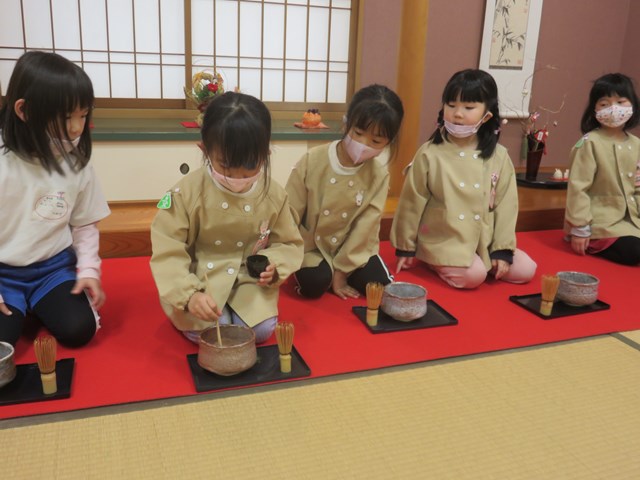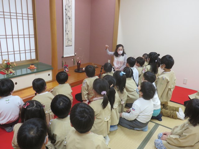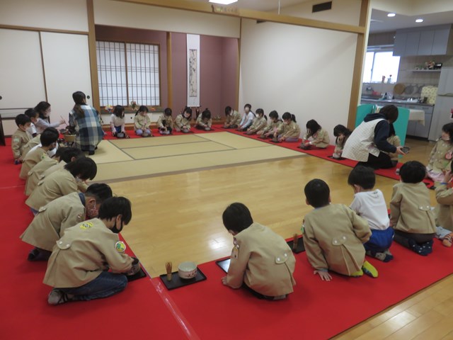 お茶会(年長組) 2022.12.26 うさぎ年を迎えます 床の間には、めでたい正月飾りが飾られ気分は新しい年です。来年の干支は?の問いに「うさぎ年!」と元気に答えてくれた子どもたち。「お先に」や「お菓子を頂戴します」も上手に言えたり、落ち着いて参加したりする姿に成長を感じました。「難しかったけど楽しかった!」「またやたりたい!」と、できるようになったことを喜んだり、次のお茶会を楽しみにしている様子も窺えました。 < >