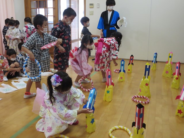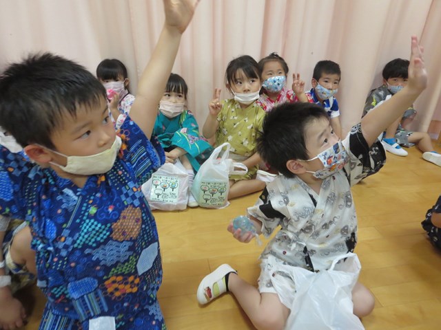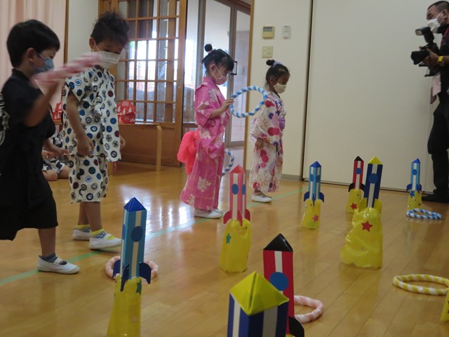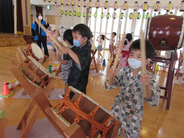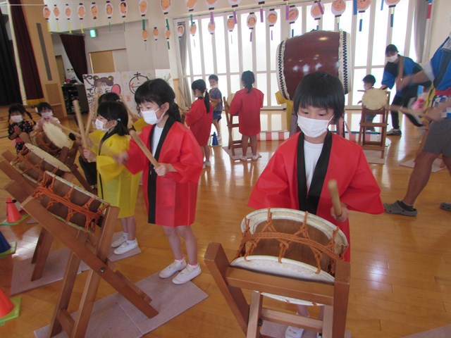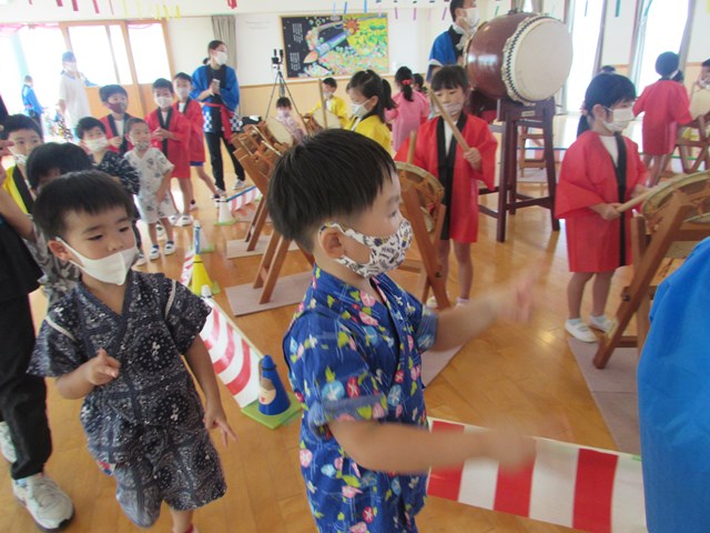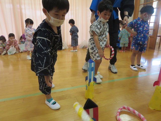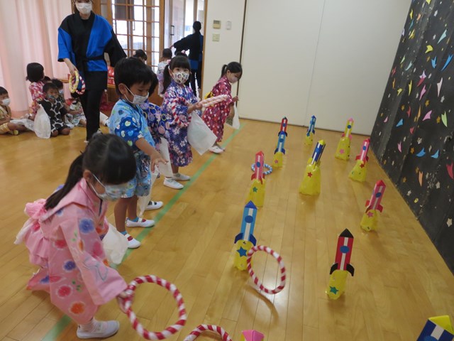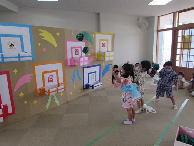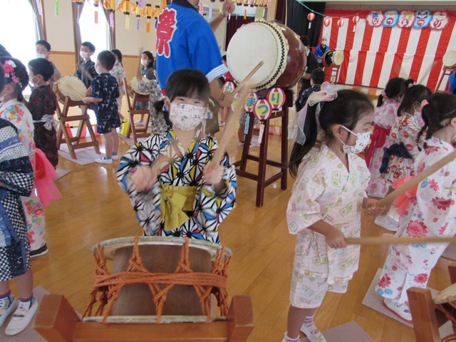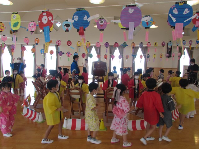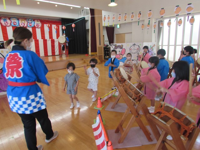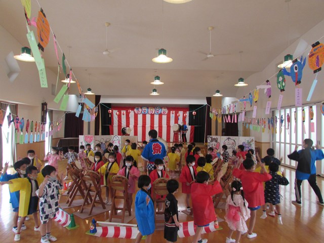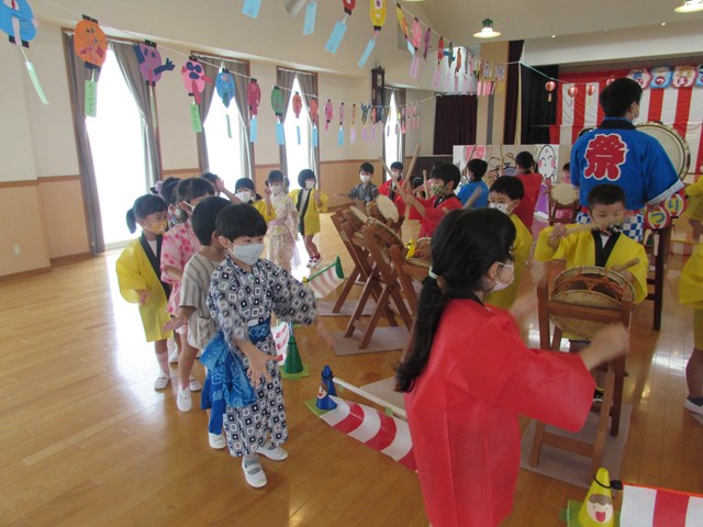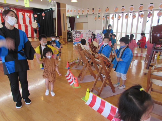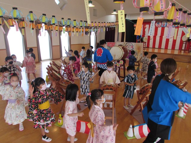夏まつり 2022.09.05 夏を満喫しました 学年ごとに夏まつりを行いました。浴衣や甚平等の私服で登園し、祭りムード満点です。盆踊り、ロケット輪投げ、ヨーヨー風船釣り、すいか玉入れ、影絵と色々な場所をまわり、楽しく夏のひと時を過ごしました。年長さんが大活躍し、他の学年の時も和太鼓で盛り上げてくれました。 < >