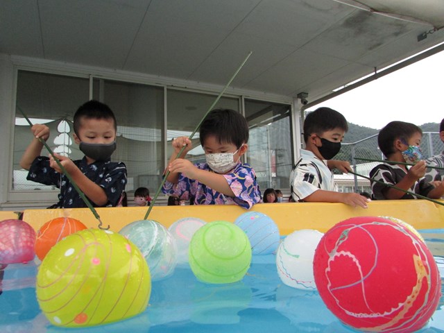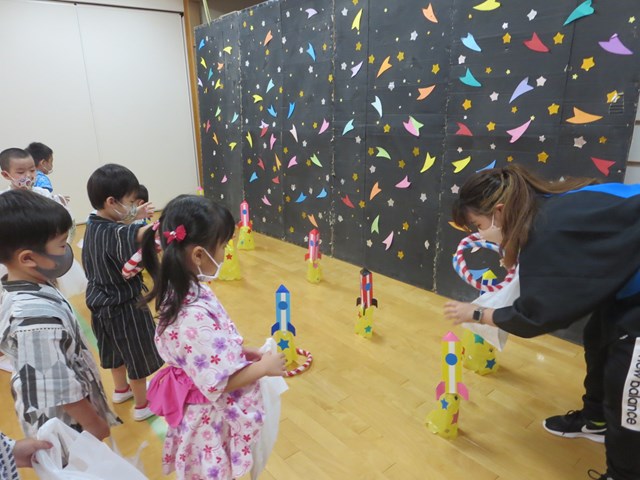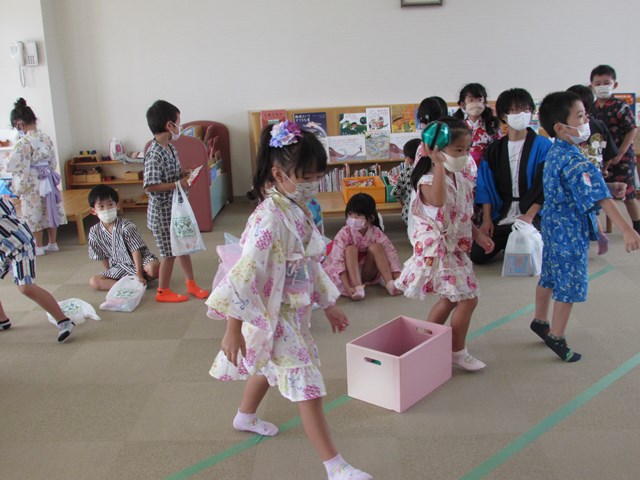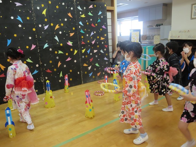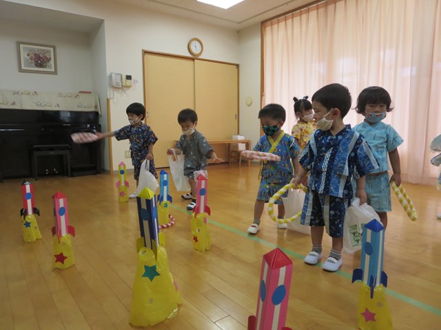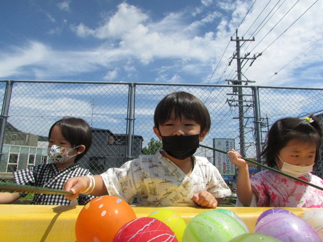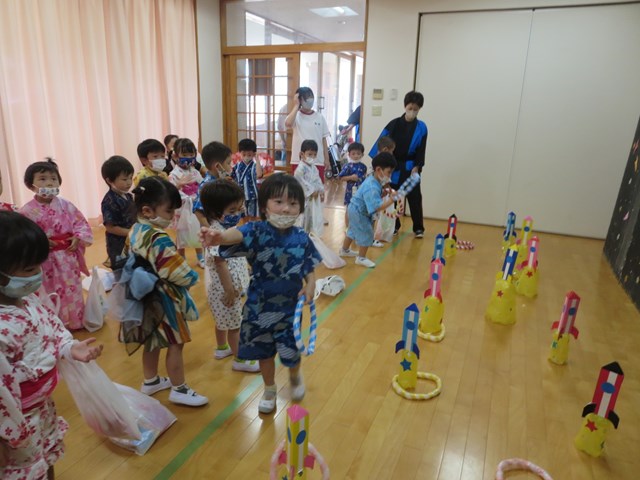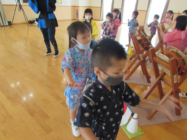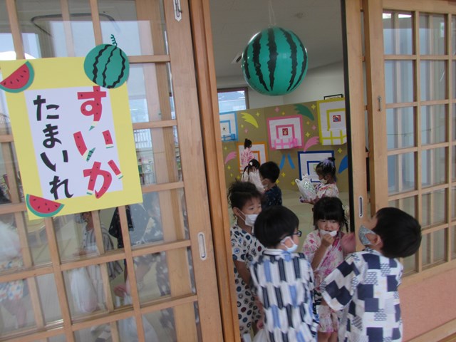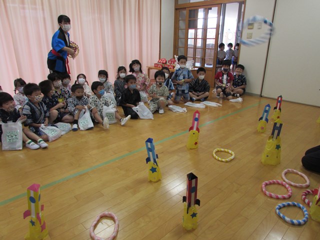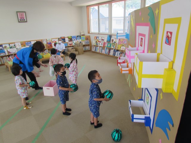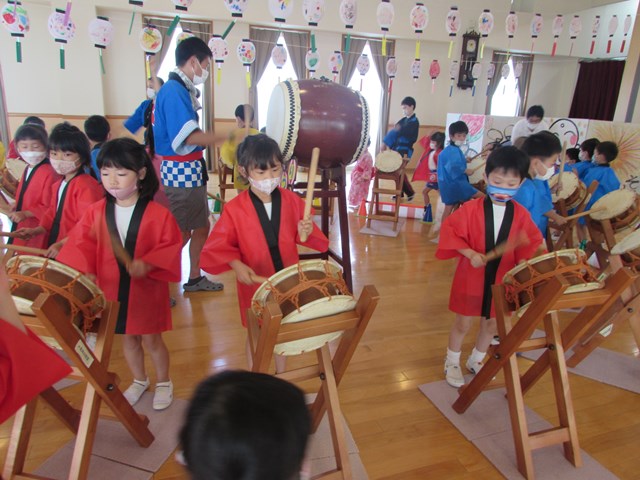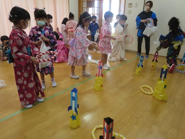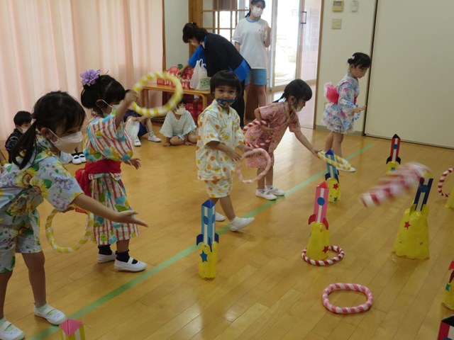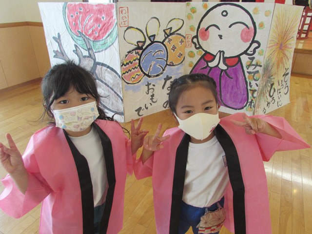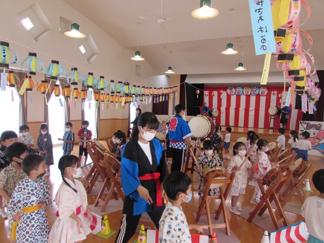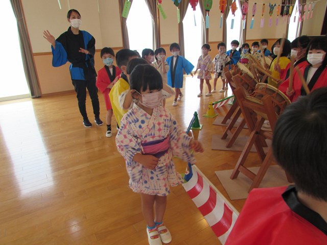 夏まつり 2022.09.05 夏を満喫しました 学年ごとに夏まつりを行いました。浴衣や甚平等の私服で登園し、祭りムード満点です。盆踊り、ロケット輪投げ、ヨーヨー風船釣り、すいか玉入れ、影絵と色々な場所をまわり、楽しく夏のひと時を過ごしました。年長さんが大活躍し、他の学年の時も和太鼓で盛り上げてくれました。 < >