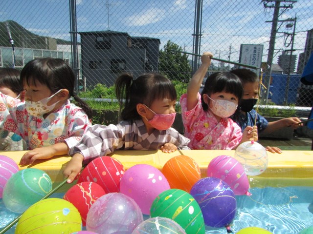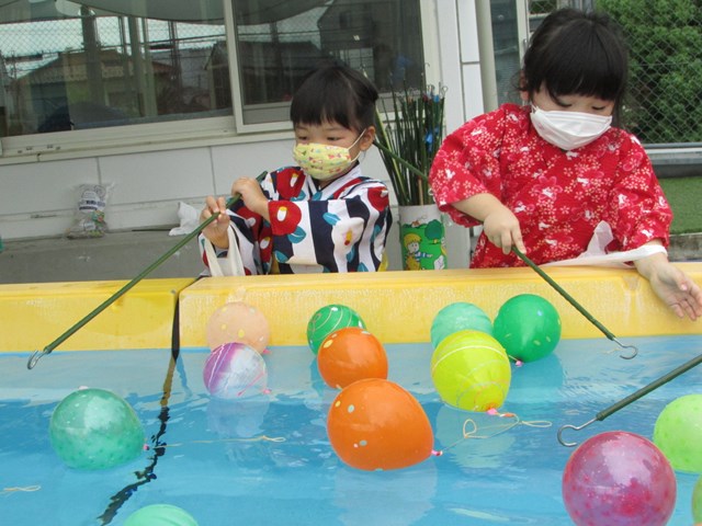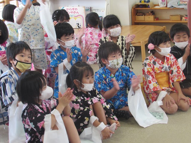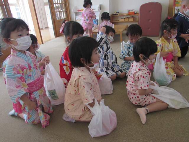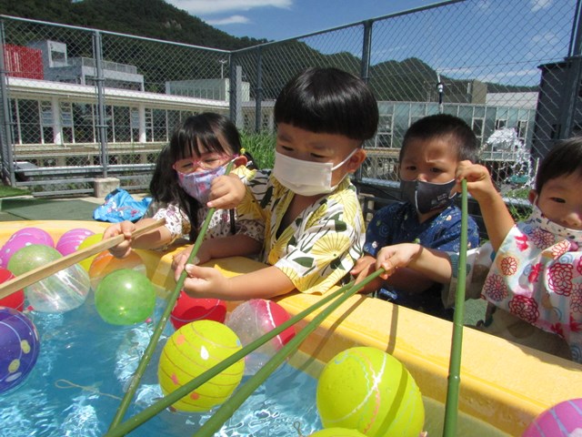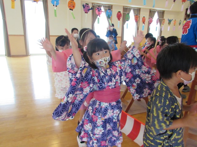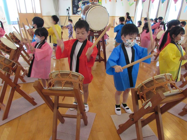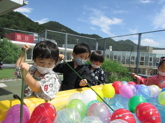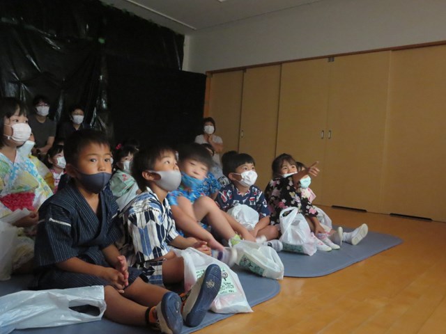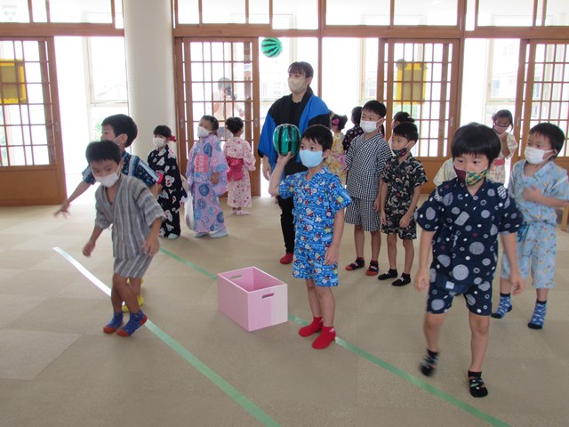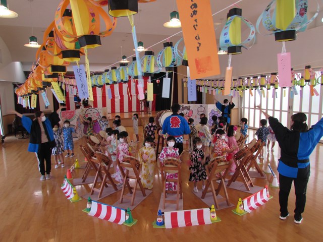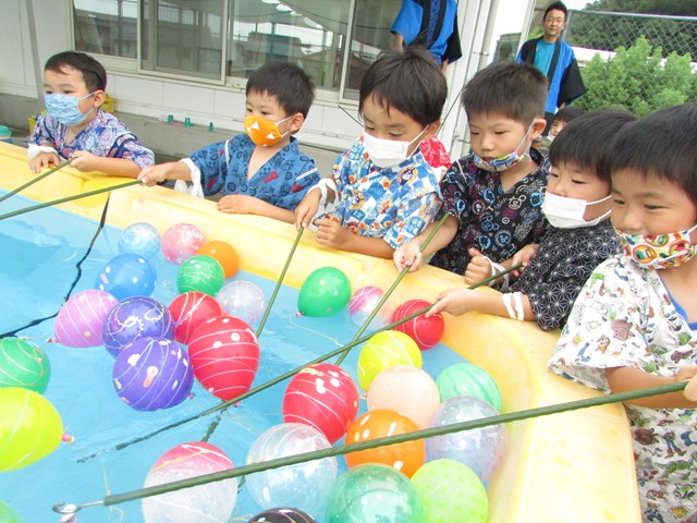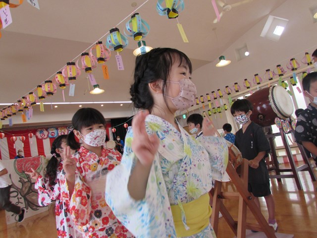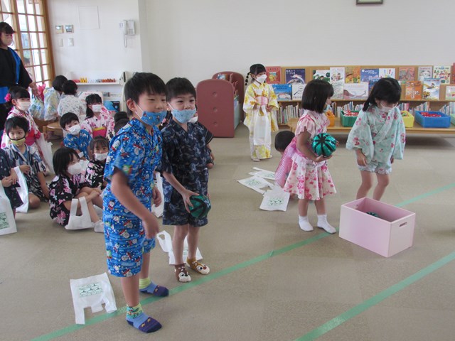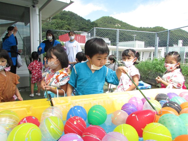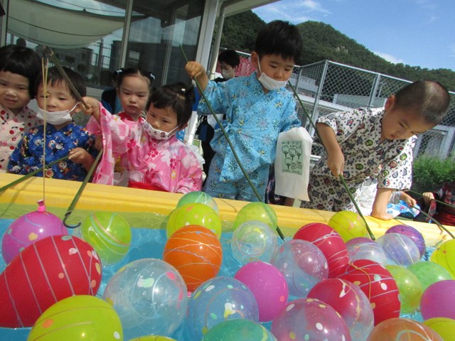 夏まつり 2022.09.05 夏を満喫しました 学年ごとに夏まつりを行いました。浴衣や甚平等の私服で登園し、祭りムード満点です。盆踊り、ロケット輪投げ、ヨーヨー風船釣り、すいか玉入れ、影絵と色々な場所をまわり、楽しく夏のひと時を過ごしました。年長さんが大活躍し、他の学年の時も和太鼓で盛り上げてくれました。 < >