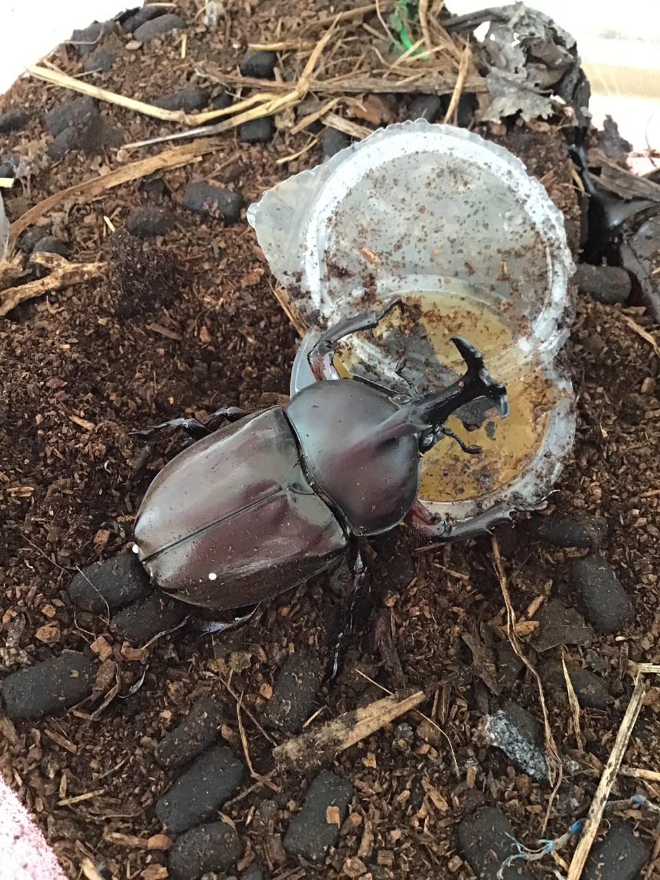 子ども達が飼育ケースの場所から、動かないなあと思っていたら、成虫になったカブト虫に釘付けでした!!