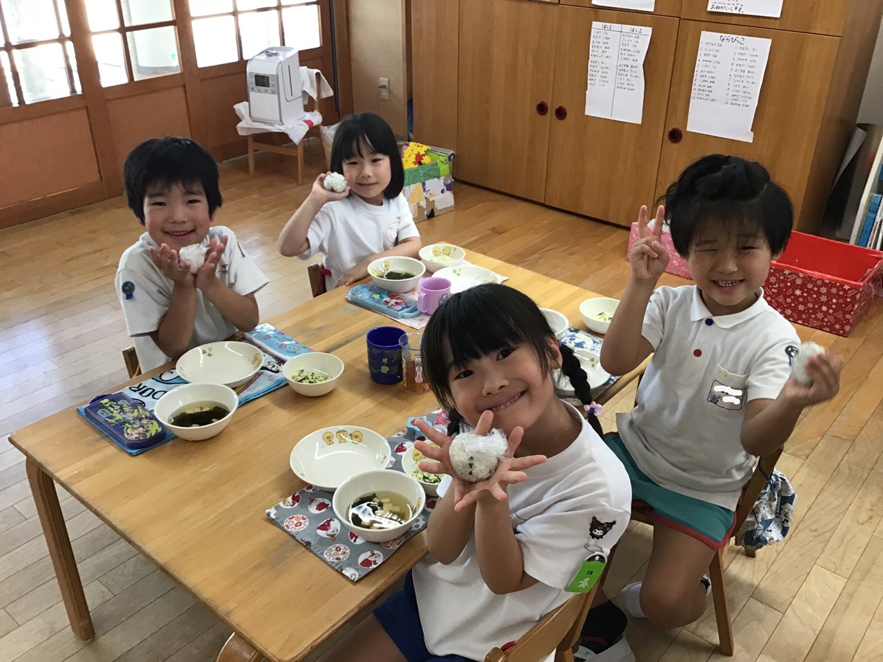 自分でおにぎりをギュッギュッと握って、おにぎり作りをしました。ペロッと完食!!おいしかったね。手慣れている子もいましたよ。おうちでも、ぜひ作ってみてね。