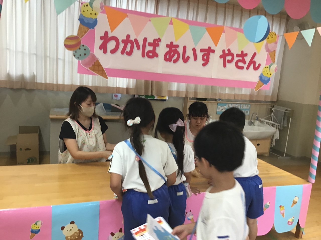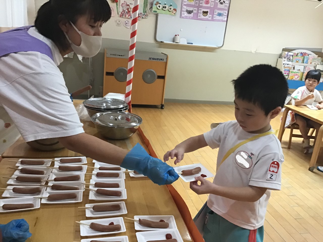 グループごとに好きな屋台へ行って食べた夕ご飯。おいしかったね。からあげにフランクフルト、パスタにたこやきにアイスクリーム!!屋台で「これください」「どうぞ」と本格的なお店屋さんごっこを楽しんでいました。普段とは違うスタイルで食べる特別感が、子ども達に喜ばれました。