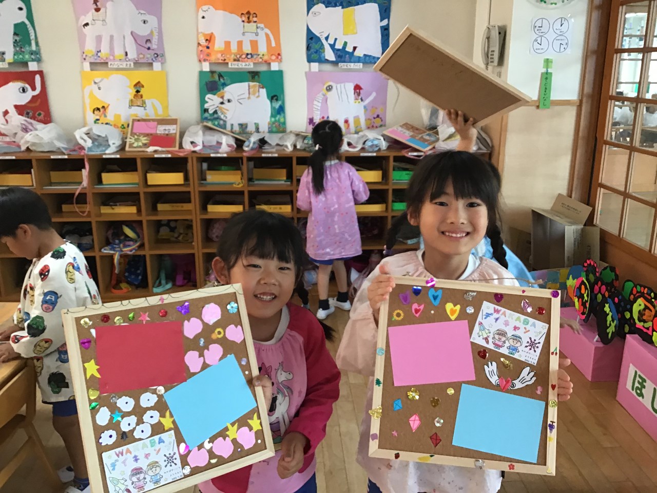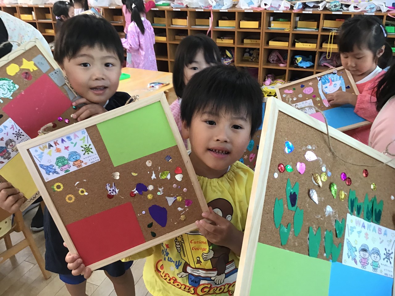 コルクボードにそれぞれ飾りつけをして、オリジナルのコルクボードを作りました。「これここにつけてね…」「それいいね👍」「ここはこうしたいんだ」と子どもたちの思いがいっぱい詰まったコルクボード。年長さんのアイディアや工夫に感心させられました。当日の写真も貼って(お家の方と一緒に貼ってくれましたね)デイキャンプの思い出をまとめました。お家に飾ってくれたかな?