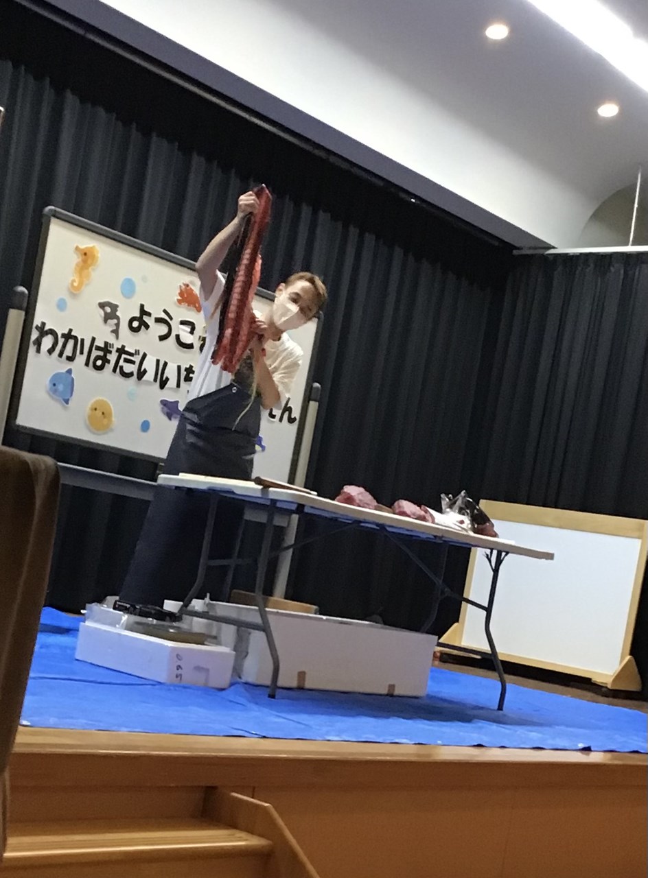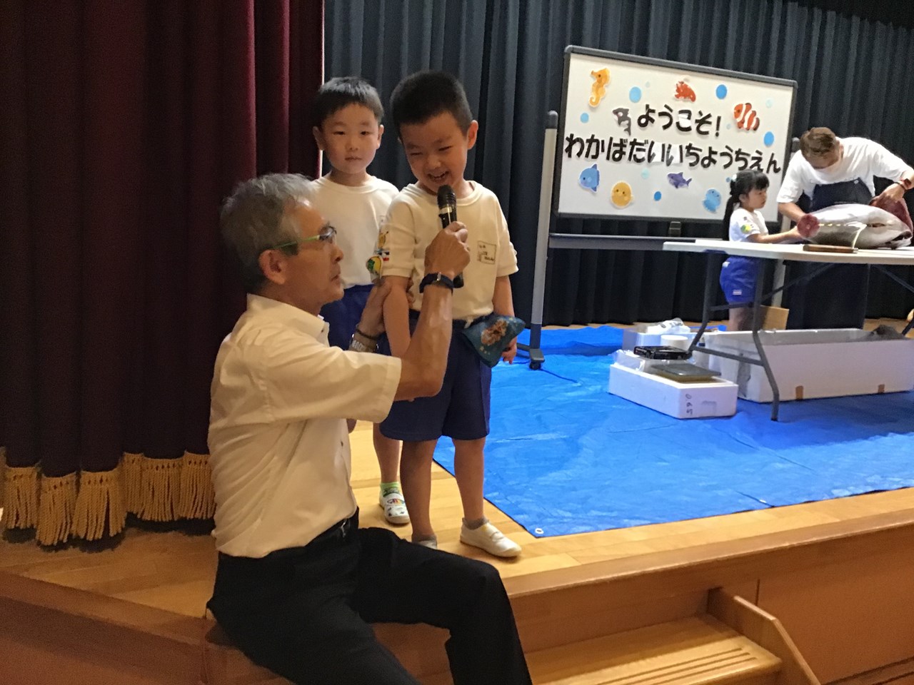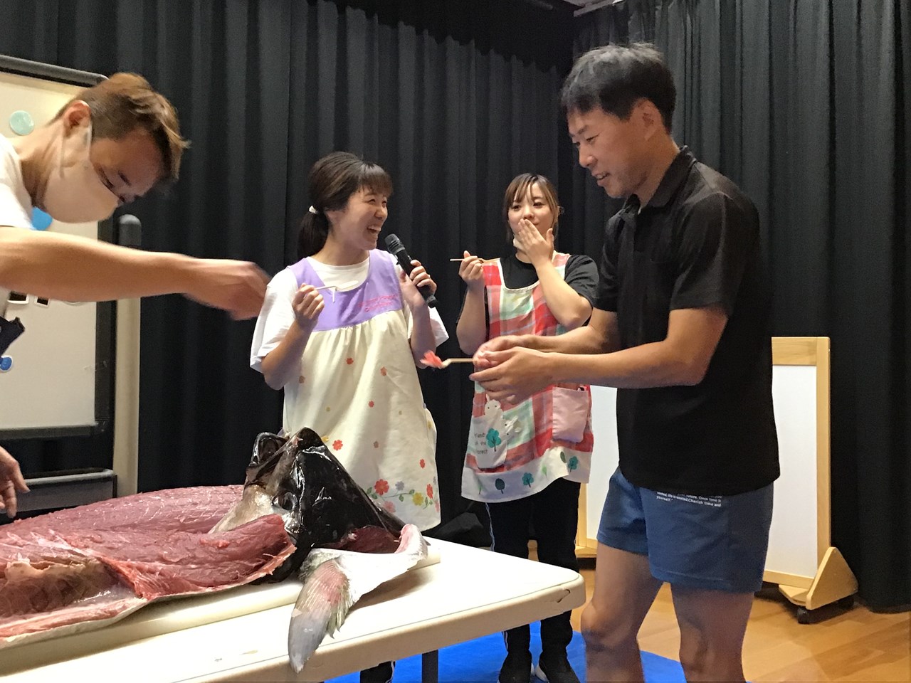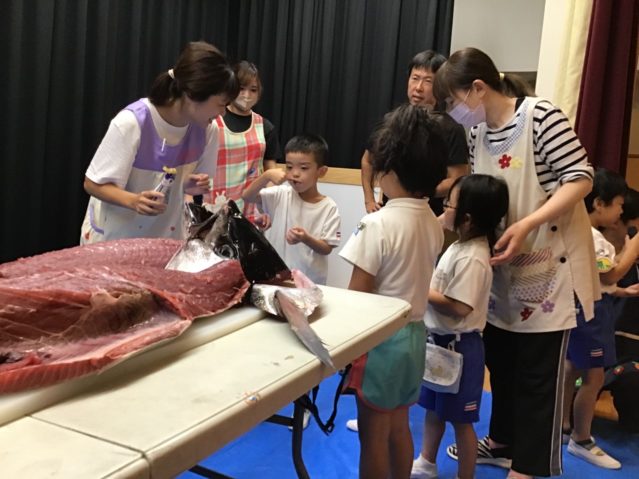 「どうやって切るのかな?」と見ていると、これまたびっくりするほど長い包丁がでてきました。みんな釘付けです!!「大きいね」「マグロ食べたーい」「すごーい!!」など、興味津々でした。