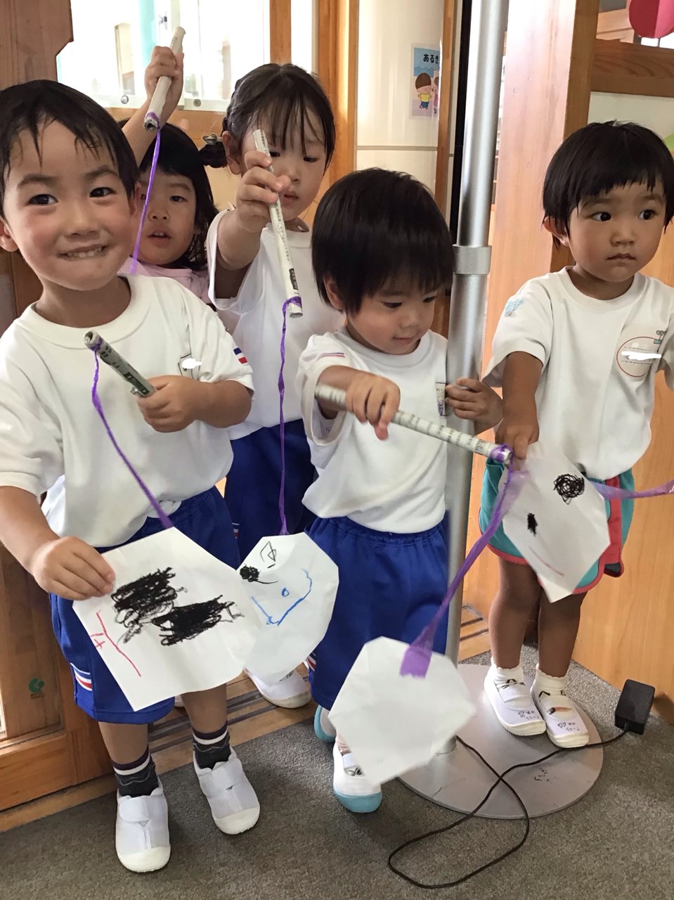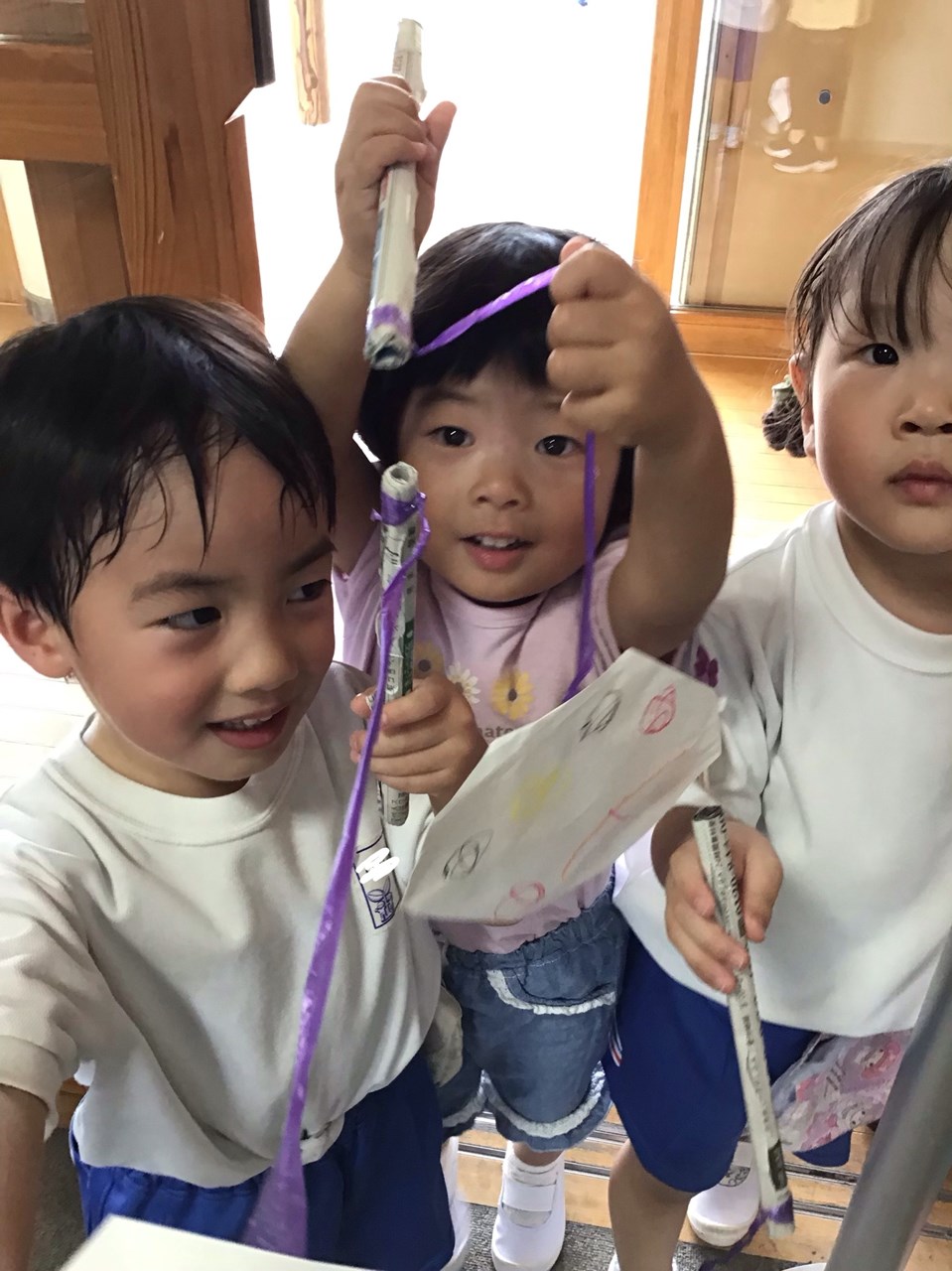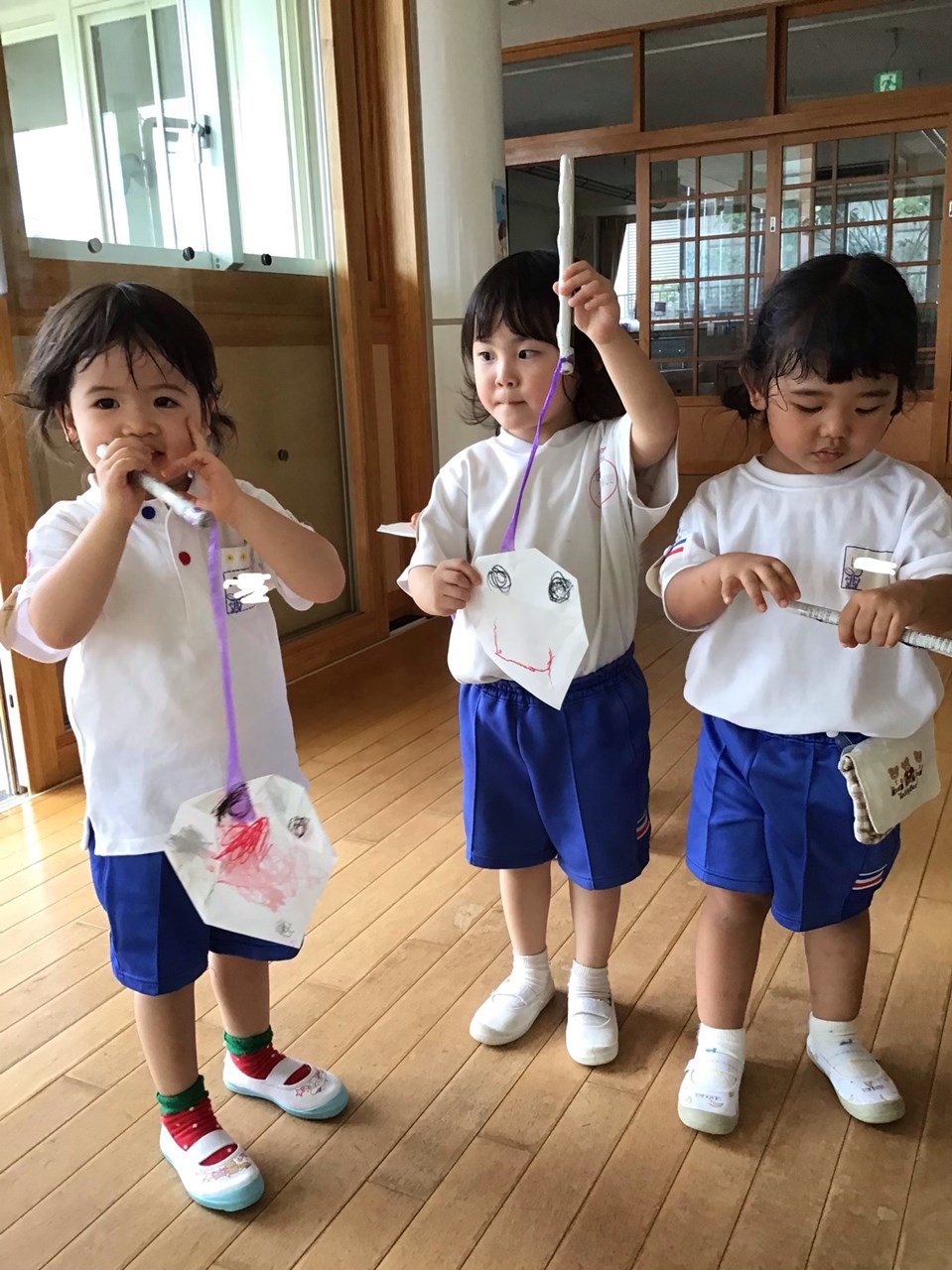 👻おばけだぞ~(プレイこすもす組)👻 2023.08.29 教務室に、かわいいかわいいおばけがやってきました👻 「おばけだじょ~」プレイこすもす組の子どもたちが、自分で作ったおばけを持ってきて、私たち職員を驚かそうとやってきたのです !! それも、まだまだ小さい子どもたちですが、声色や表情も怖そうにして驚かそうとする姿に、思わずキュン♡ 今日も、かわいいかわいい子どもたちに癒されて、幸せを感じたひと時でした😊 < >