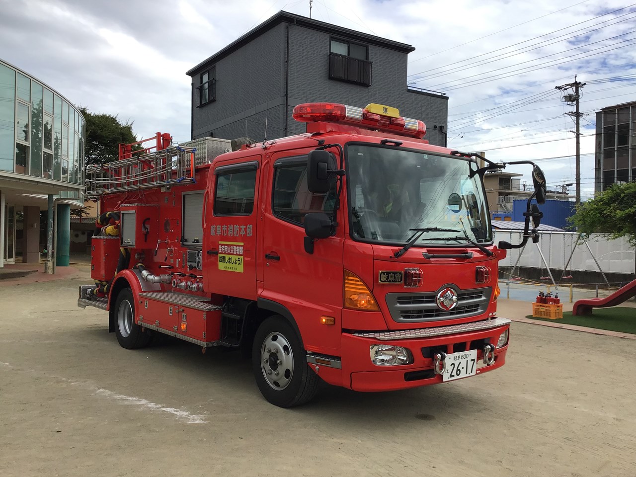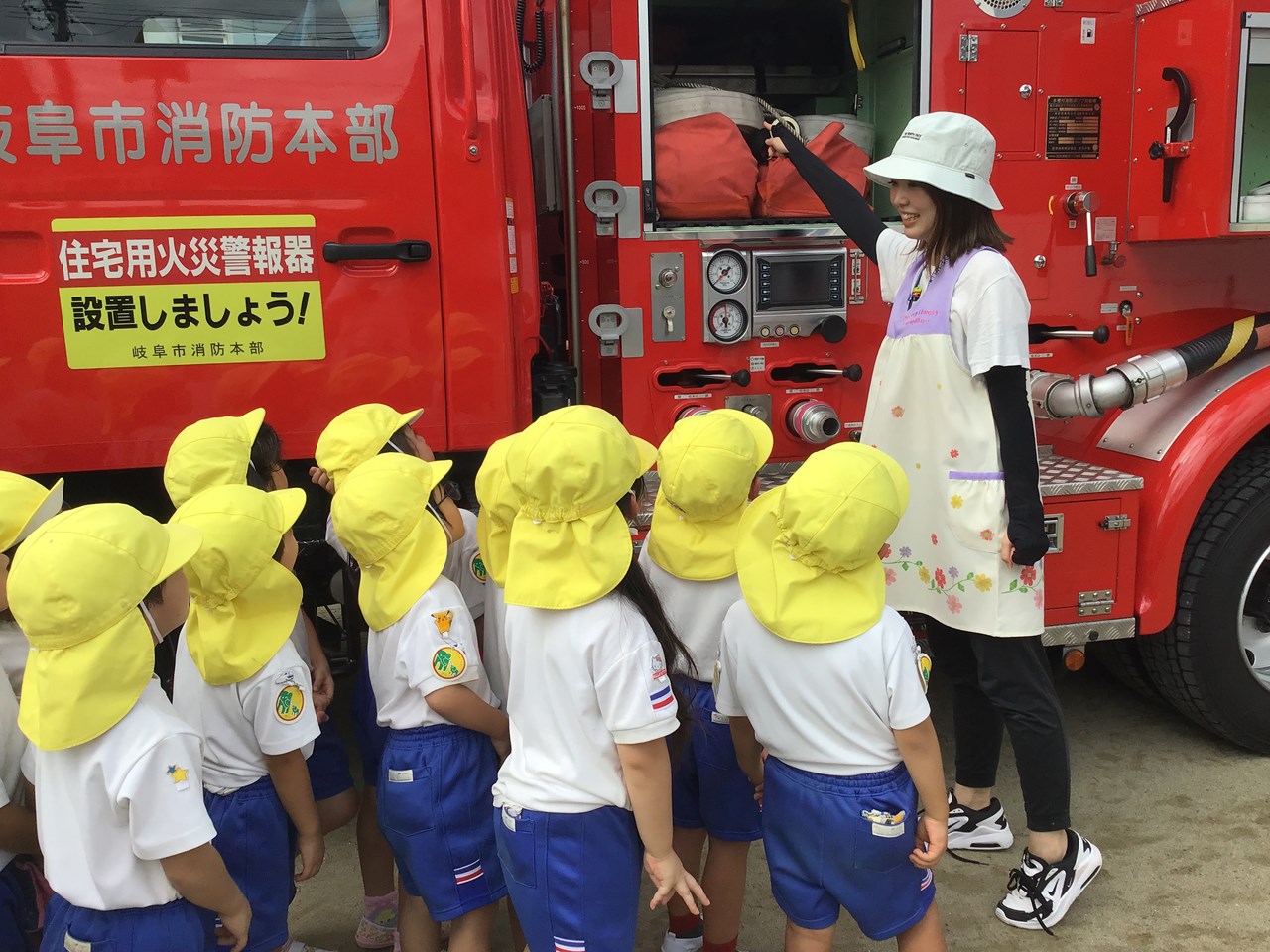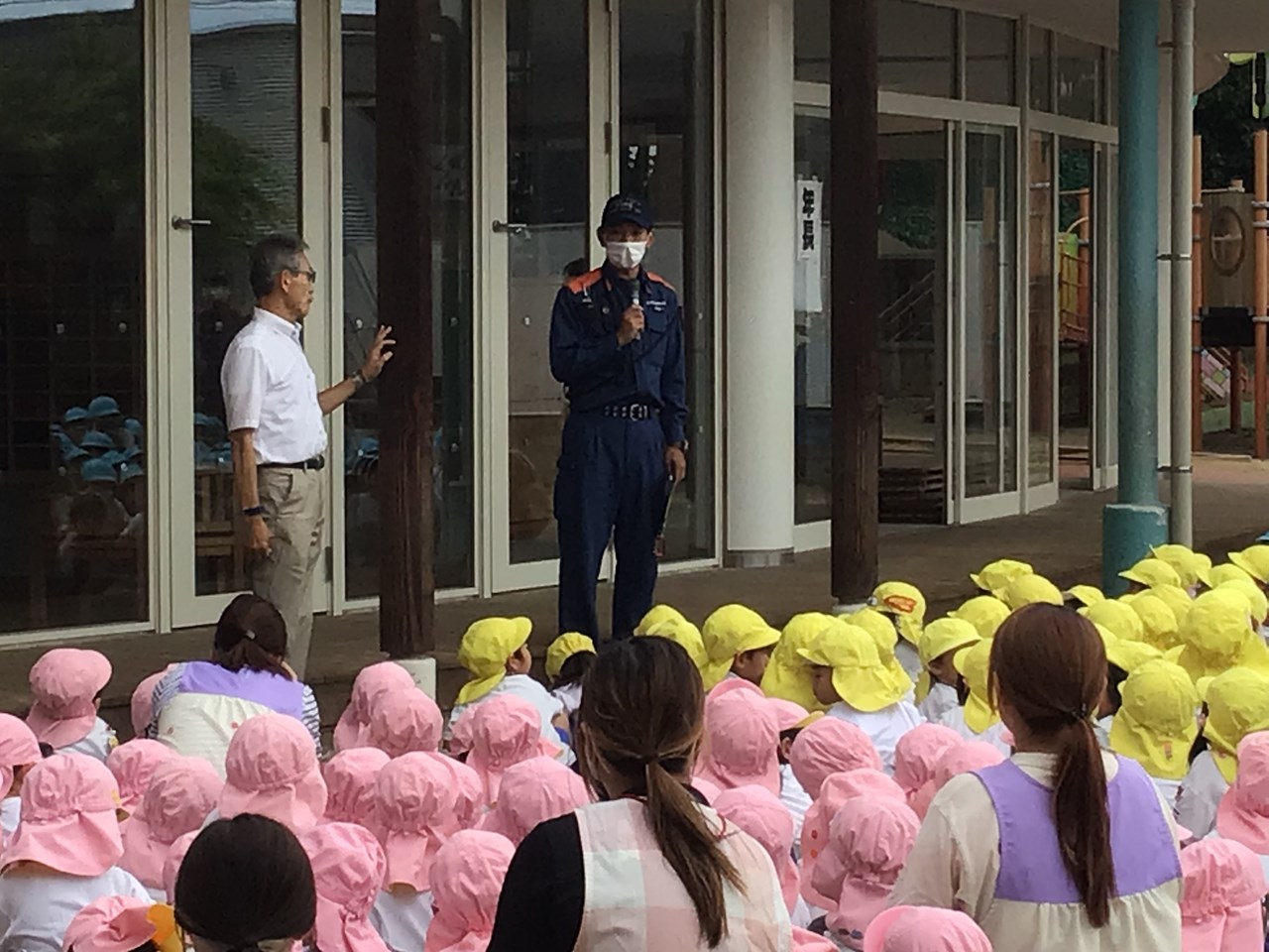 消防車に乗って消防士さんも、避難訓練に参加してくださいました。消防士さんから話を聞いたり、職員に消火器の使い方を教えてくださったり、消防車を見せてくださったりしました。