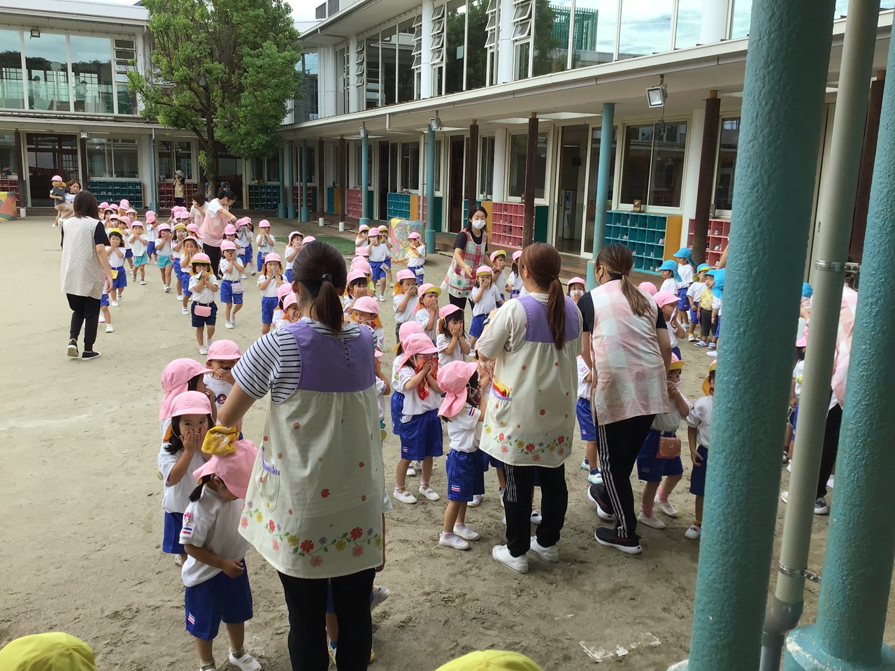 職員も、緊張感を持って訓練を行いました。子どもたちはというと、1学期に行った避難訓練の成果がよく出ていて、先生の話をしっかり聞いて落ち着いて素早く行動できていました。