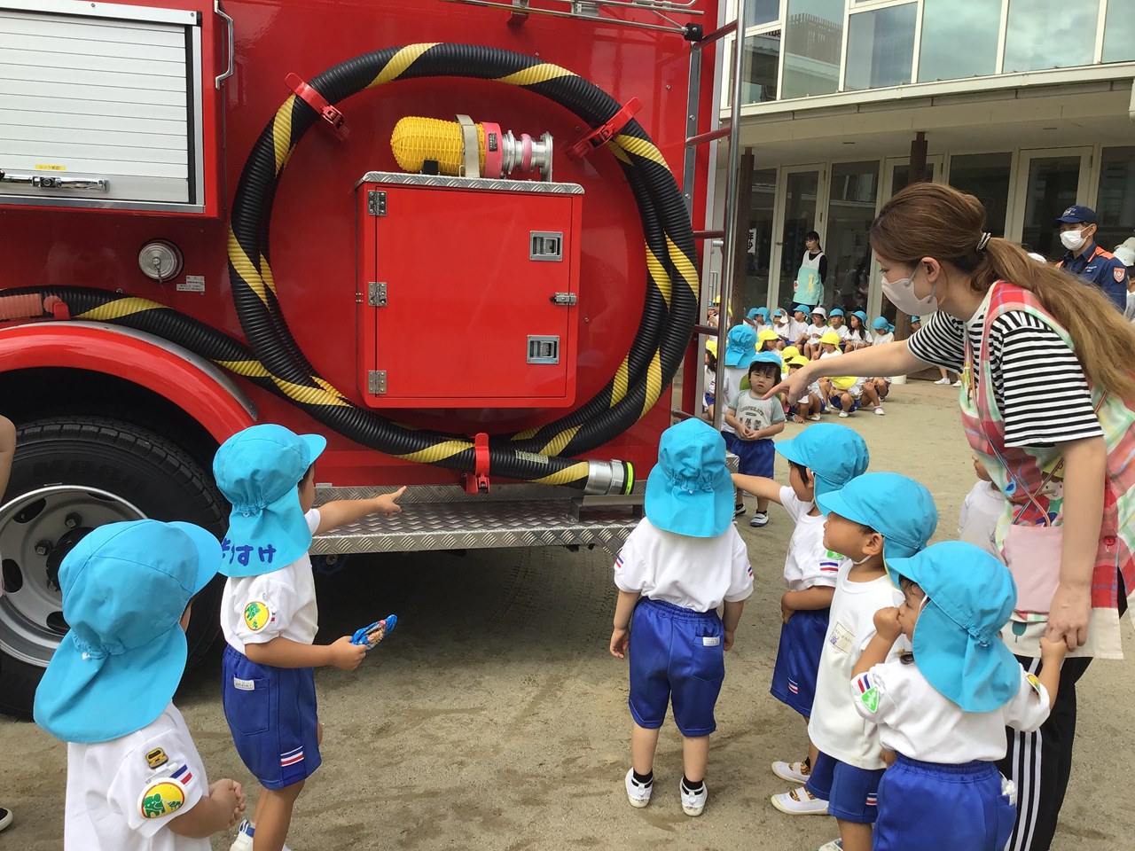 職員の消火訓練では「○○先生かっこい~」「がんばってー!!」と子どもたちがたくさんの声援を送ってくれる中で、消火器の使い方を教わって実践しました。消防車見学では、積極的に質問したり触れて見たりして、キラキラ目を輝かせていました。今回の避難訓練はいつも以上に子どもたちの記憶に残ったのではないかと思っています。