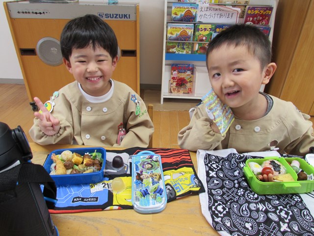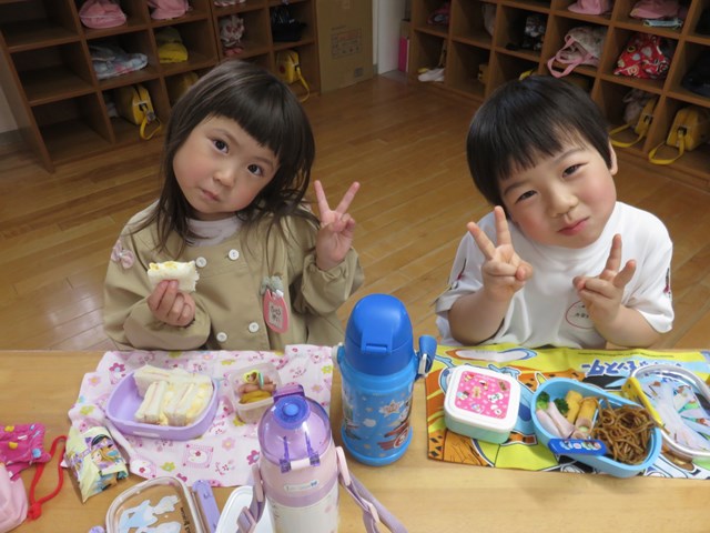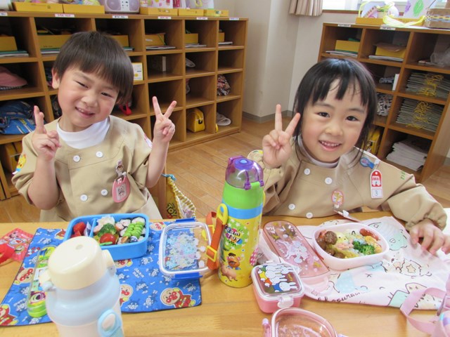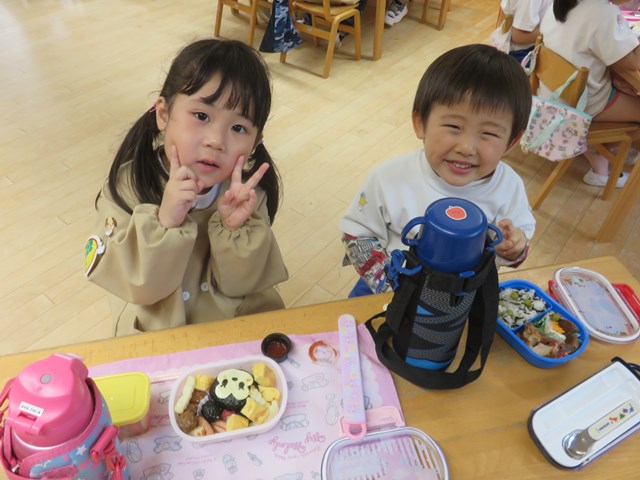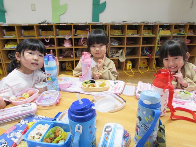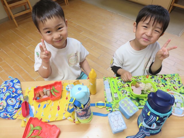 いっぱい遊んでお腹もペコぺコ!楽しみにしていたお弁当の時間です。目をキラキラと輝かせる子どもたち。口いっぱいに頬張り、あっという間にお弁当箱は空っぽに!「愛情あふれる」お弁当に、お腹も心も満たされました。