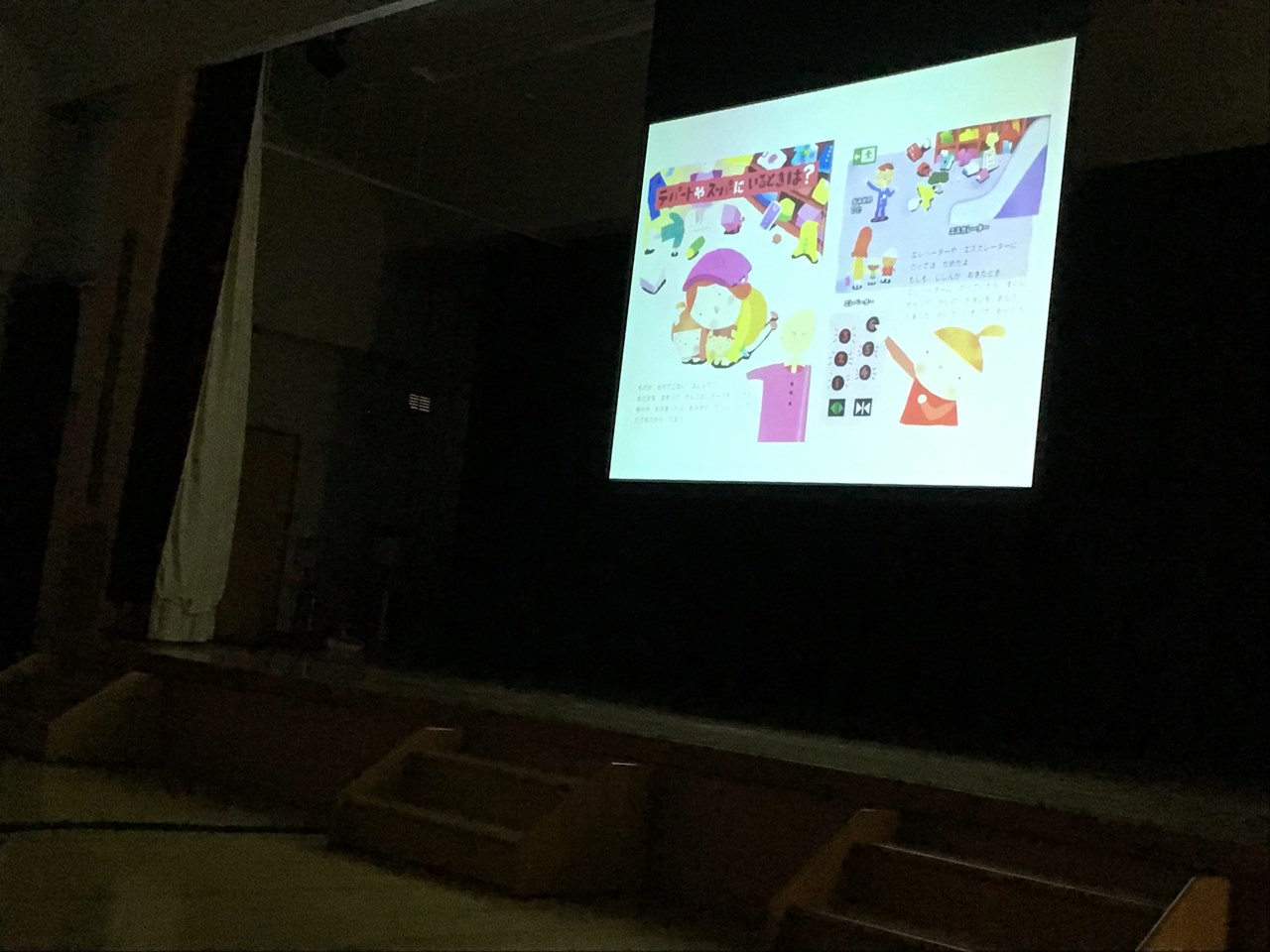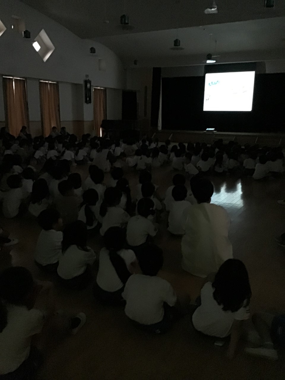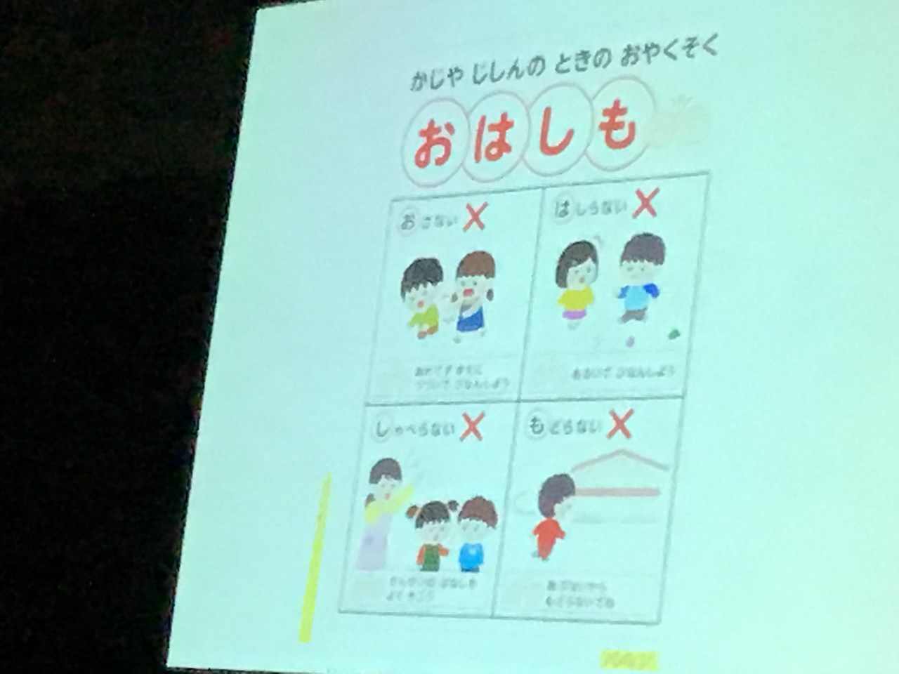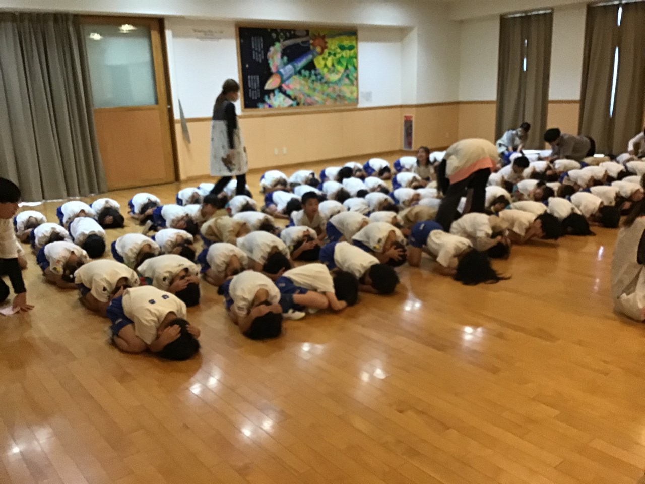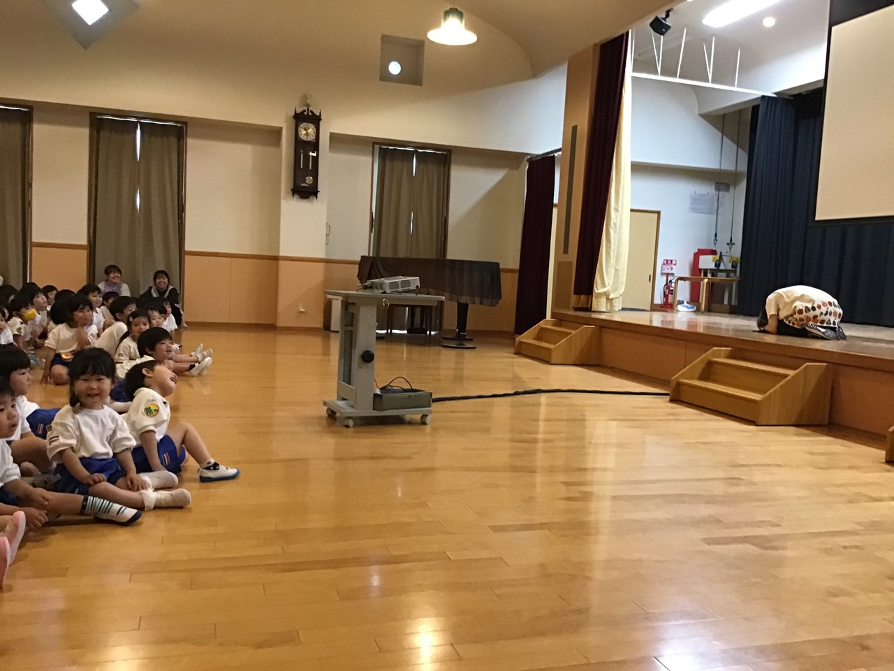 ホールに集まって、スクリーンで防災の絵本を見たり、「おかしも」の約束を確認したり、ダンゴムシポーズの練習をしたりしました。