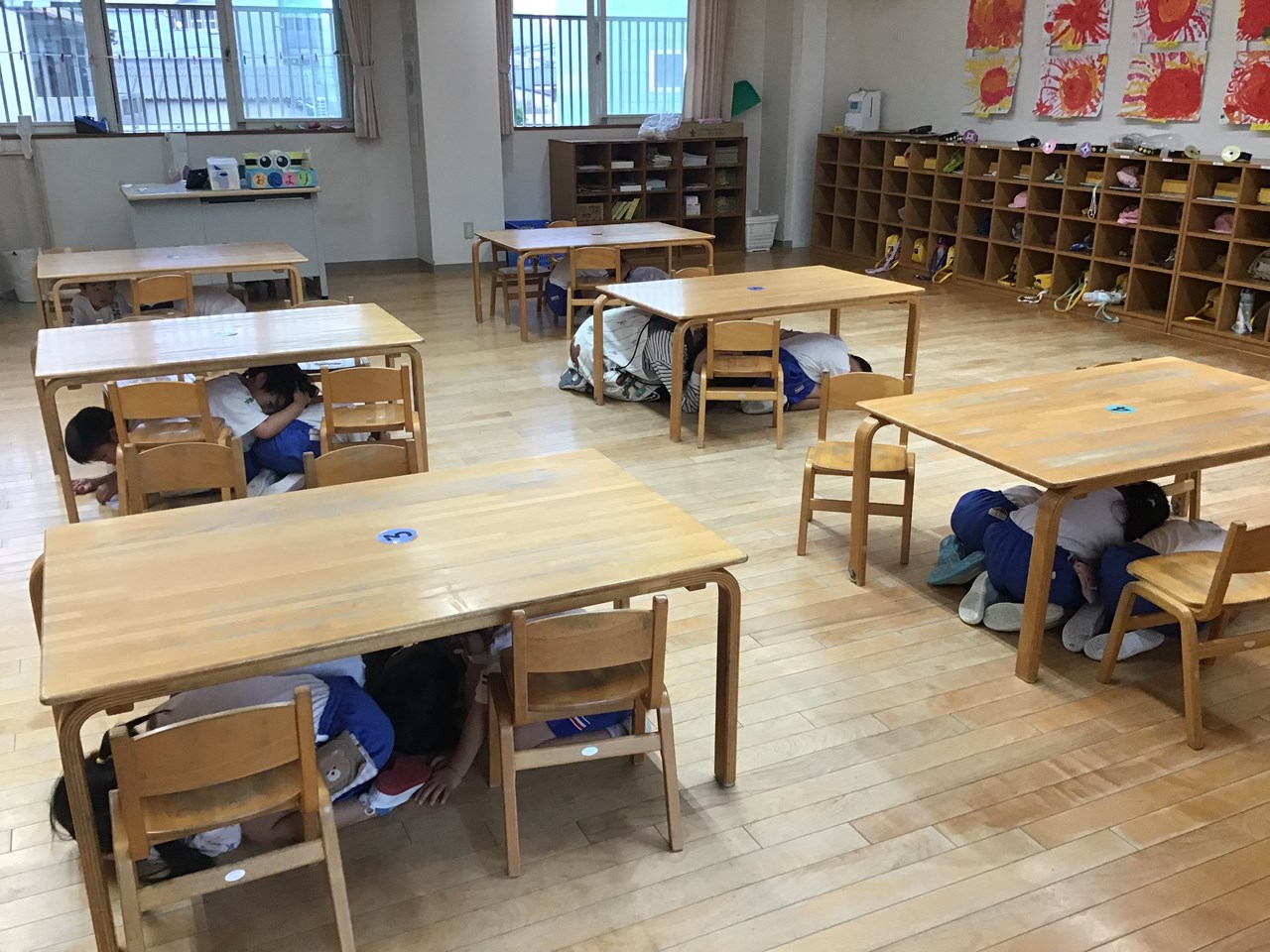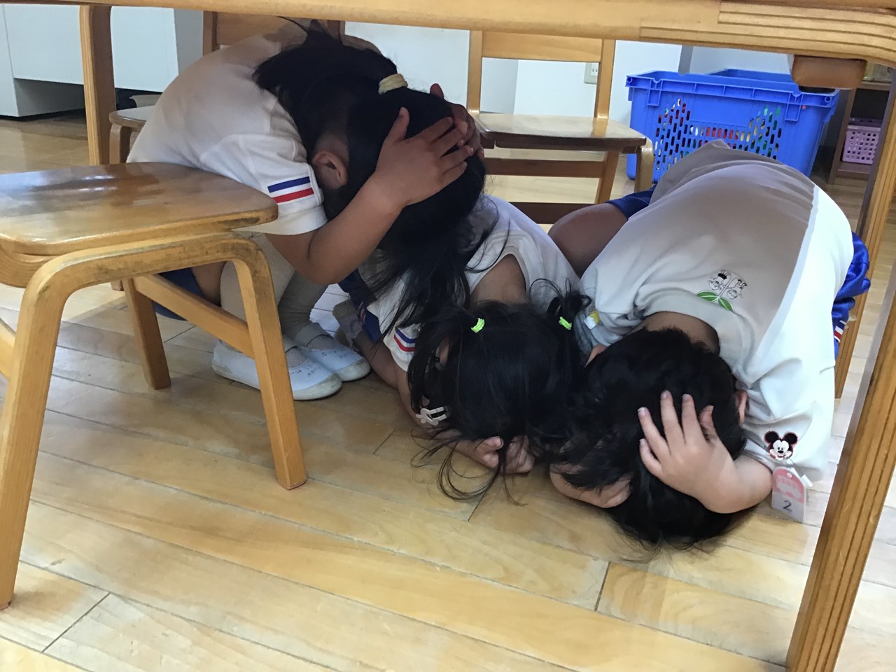さらに教室へ帰ってからも、一斉放送が流れ、机の下に潜ってもう一度ダンゴムシポーズのおさらいをしました。