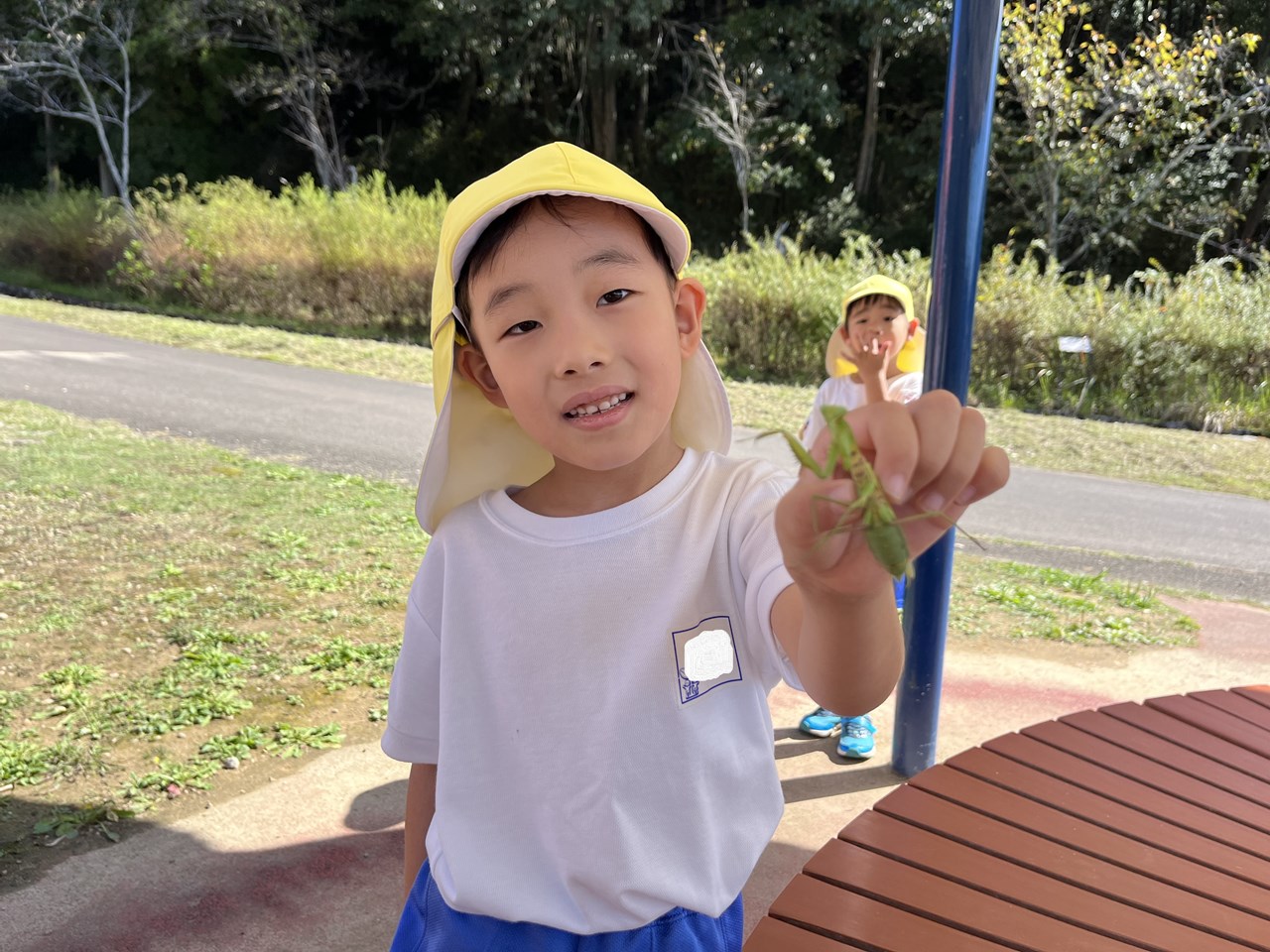 遊具までの道のりはちょっと長かったけれど、金木犀のかおりに秋を感じたり、かまきりに出会って大騒ぎしたり、お気に入りの木の実や枝を見つけたり、たくさんの自然に触れながら散歩をしました。