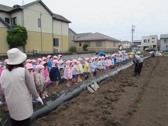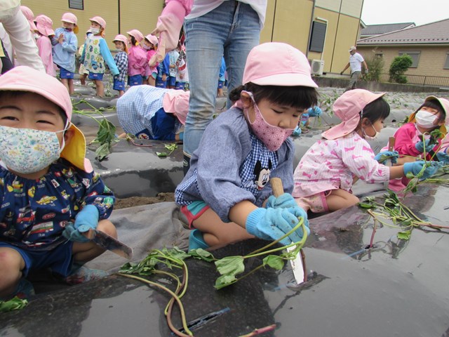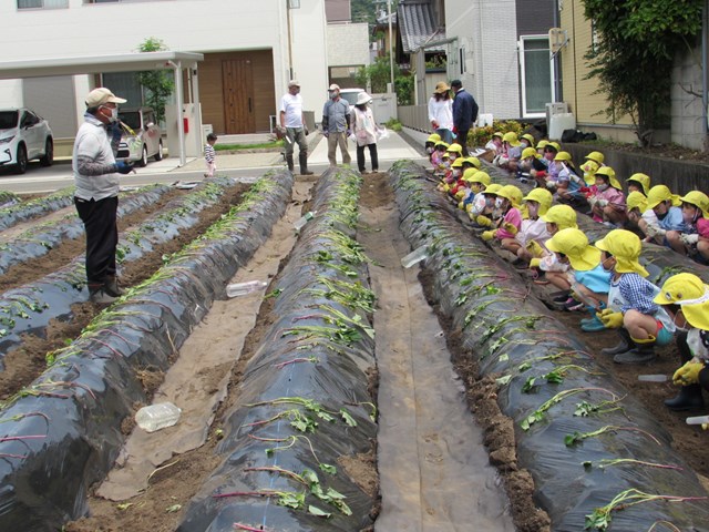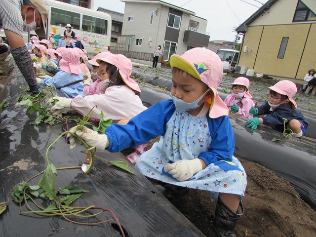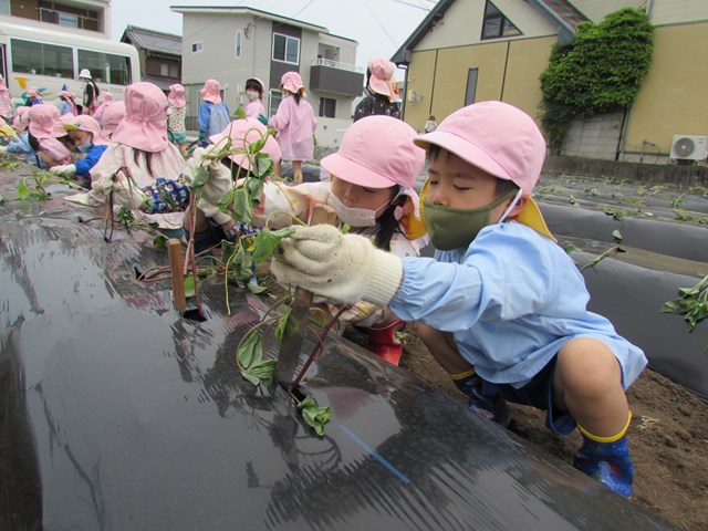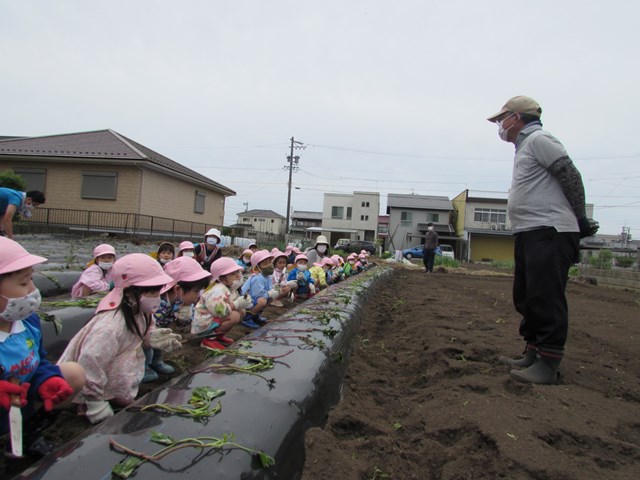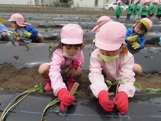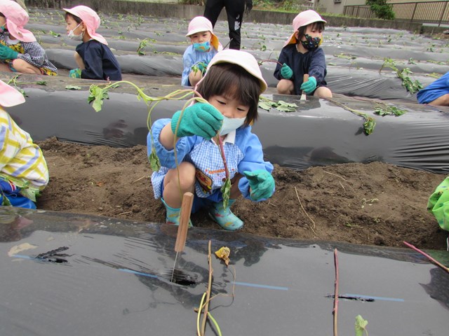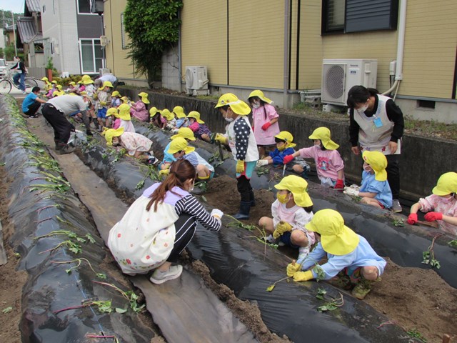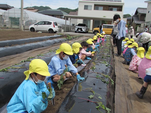 「10月に芋掘り行ったよね」「ハサミムシがいたね」「おいもたくさん掘れたね」「私さつまいも大好き」「さつまいも早く食べたい」と会話も弾みながら芋畑へと出発しました。昨年の5月は、コロナによる臨時休園でしたので職員が苗植えをしました。子どもたちにとって初めての苗植え体験です。「大きく育ってね!」と優しい表情で苗と向き合う子どもたちでした。およそ800本の苗を年中児と年長児で植えることが出来ました。