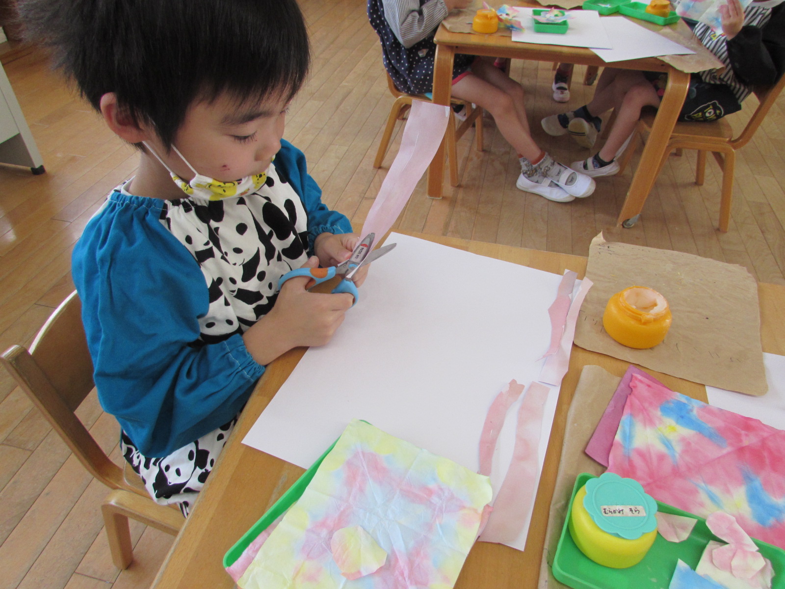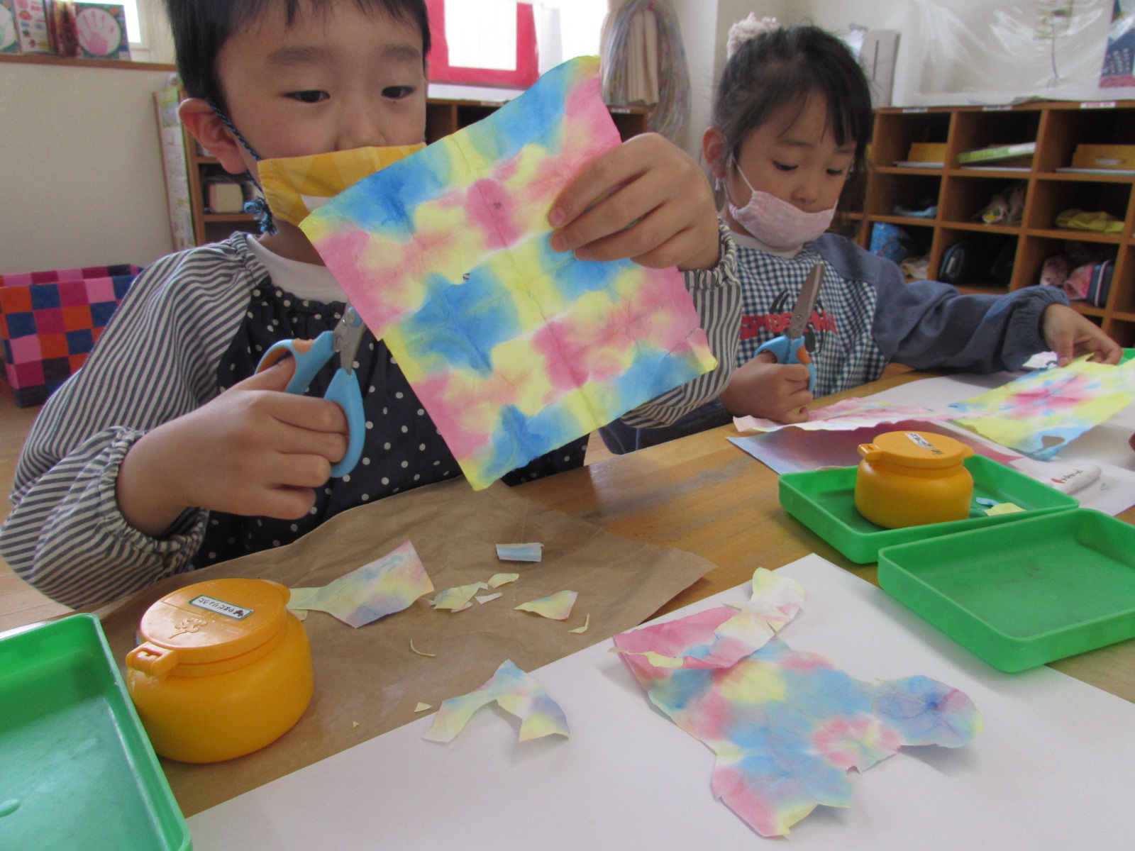 次の日・・・折染めした和紙を好きな形に切り、自分の世界を作りました。「僕は宇宙を作ろう」「虹色の雨が降るよ」とどんどん和紙を切り、クレパスで描き加えていきました。素敵な作品が出来ました。