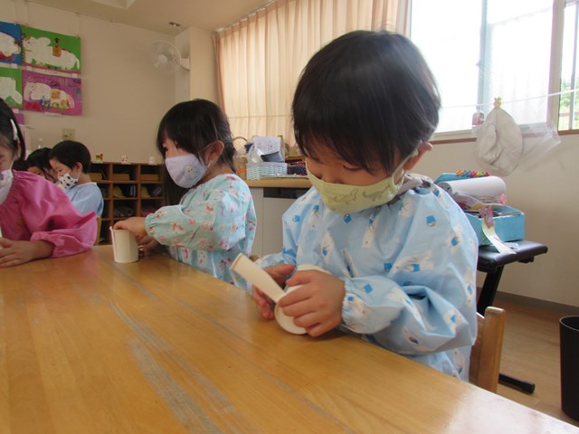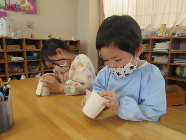 さくら組『紙コップのとんぼ』けん玉に魚釣り等、最近クラスでは「作って遊べるおもちゃ作り」が流行中です。今回の活動は紙コップを使ってとんぼを作りました。